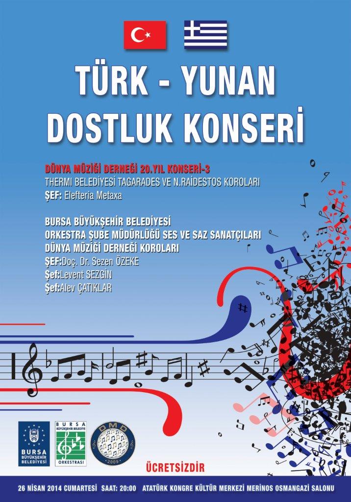 Doç. Dr. Sezen Özeke, Levent Sezgin, Alev Çatıklar ve Elefteria Metaxa’nın şefliğinde sunulacak olan konserde; Bursa Büyükşehir Belediyesi Orkestrası saz ve ses sanatçıları, Dünya Müziği Derneği koroları, Thermi Belediyesi Tagarades ve N. Raidestos koroları sahneye çıkacaktır. Keyifli müzik ziyafetini, Bursalılar ücretsiz olarak izleyebilecekler.