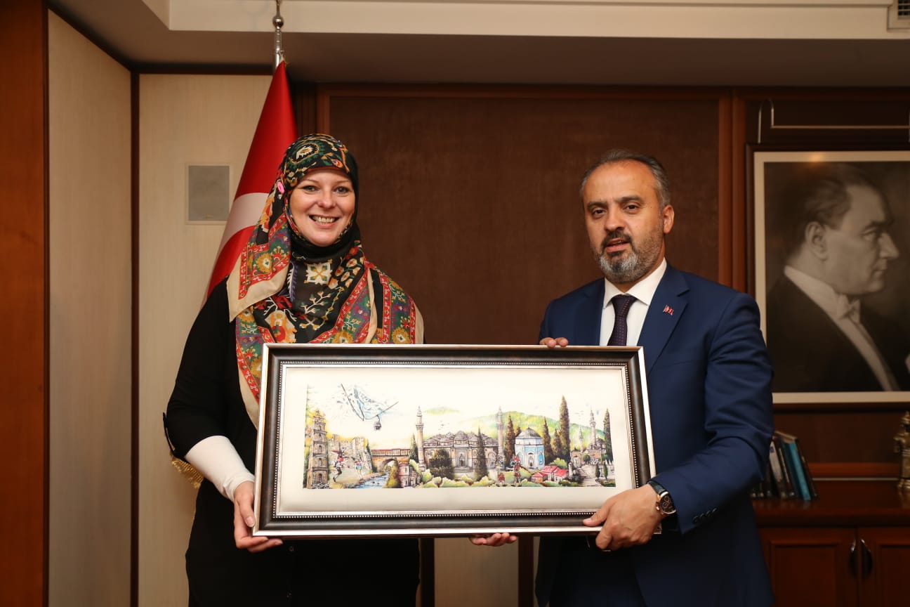 Büyükşehir Belediye Başkanı Alinur Aktaş, İngiliz misafirine Bursa’yı anlattı. Bursa’nın Türkiye’nin dördüncü büyük kenti olduğunu, Osmanlı’ya 130 yıl başkentlik yaptığını söyleyen Başkan Aktaş, Lauren Booth’u Osmanlı’nın doğduğu topraklarda ağırlamaktan duyduğu memnuniyeti dile getirdi.