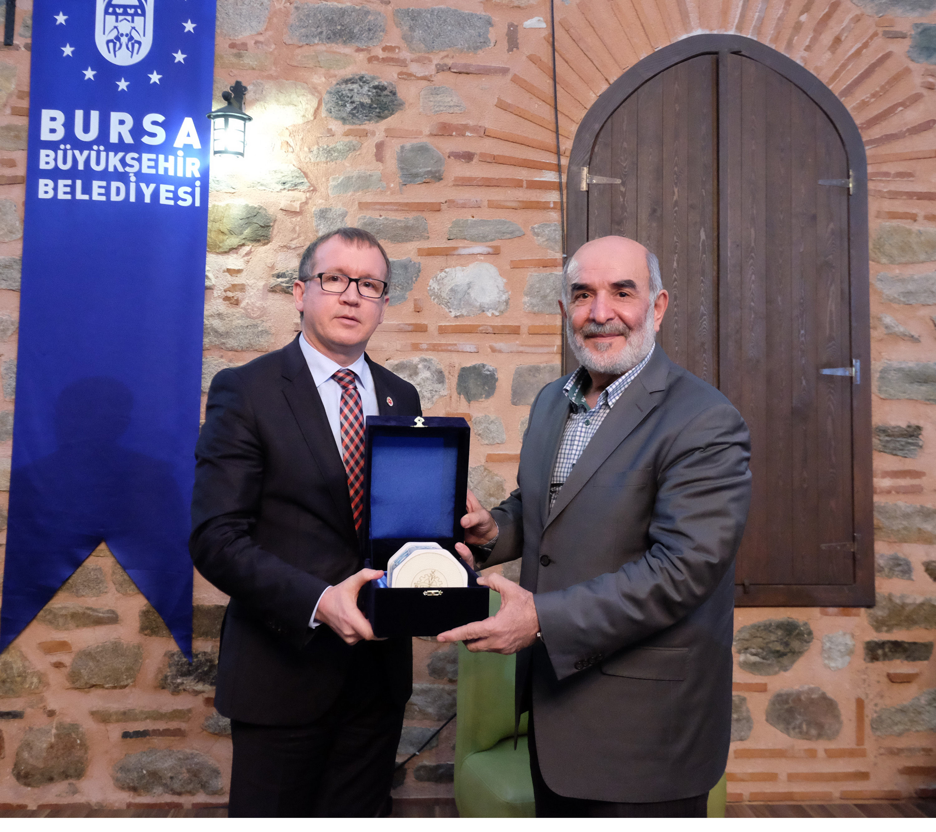 Bursa Büyükşehir Belediyesi Başkanvekili Abdülkadir Karlık, programın sonunda Ahmet Taşgetiren’e ve Selahaddin Kocaaslan’a teşekkür ederek BUSMEK kursiyerlerinin hazırladığı Yeşil Türbe çinisini hediye etti.