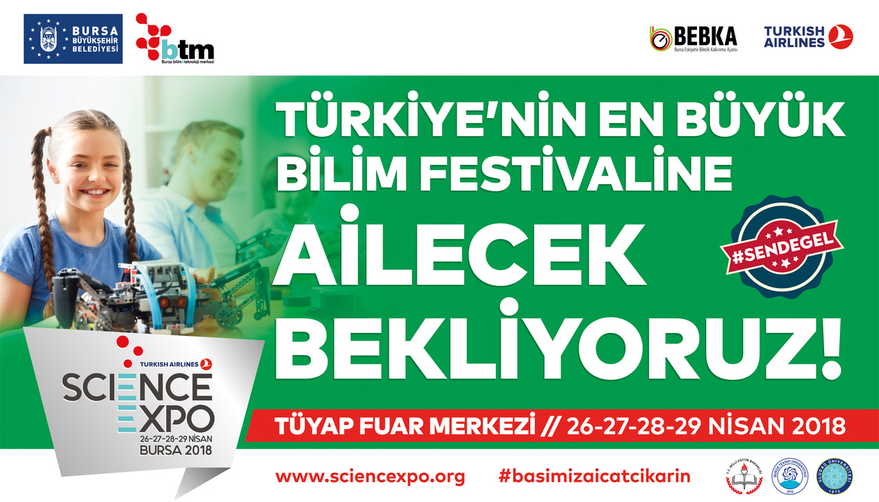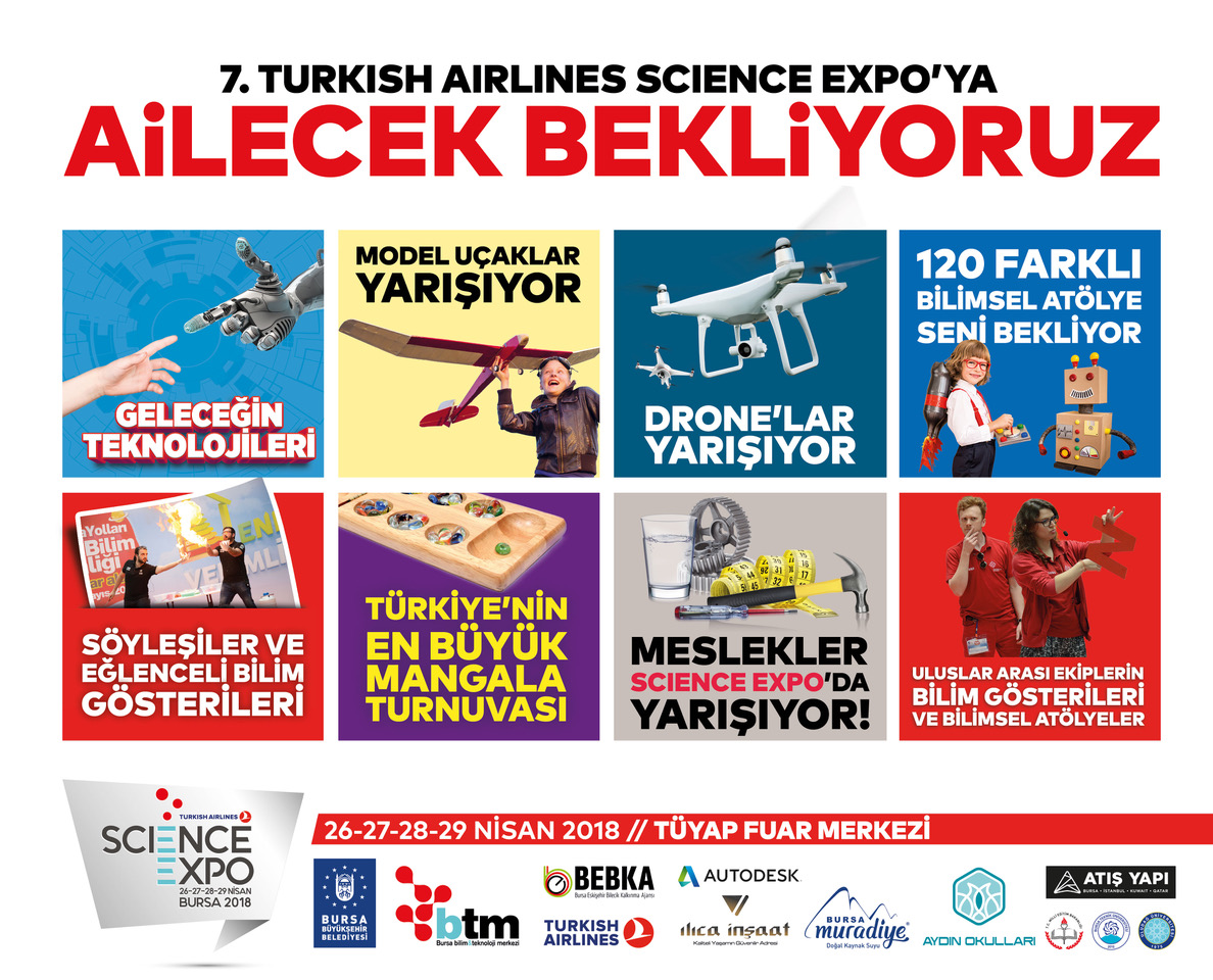Bursa Büyükşehir Belediyesi ve Bursa, Eskişehir, Bilecik, Kalkınma Ajansı (BEBKA) işbirliğinde gerçekleştirilen ‘7. Türk Hava Yolları Science Expo 2018’, TÜYAP Fuar Merkezi’nde düzenlenecek törenle start alacak.