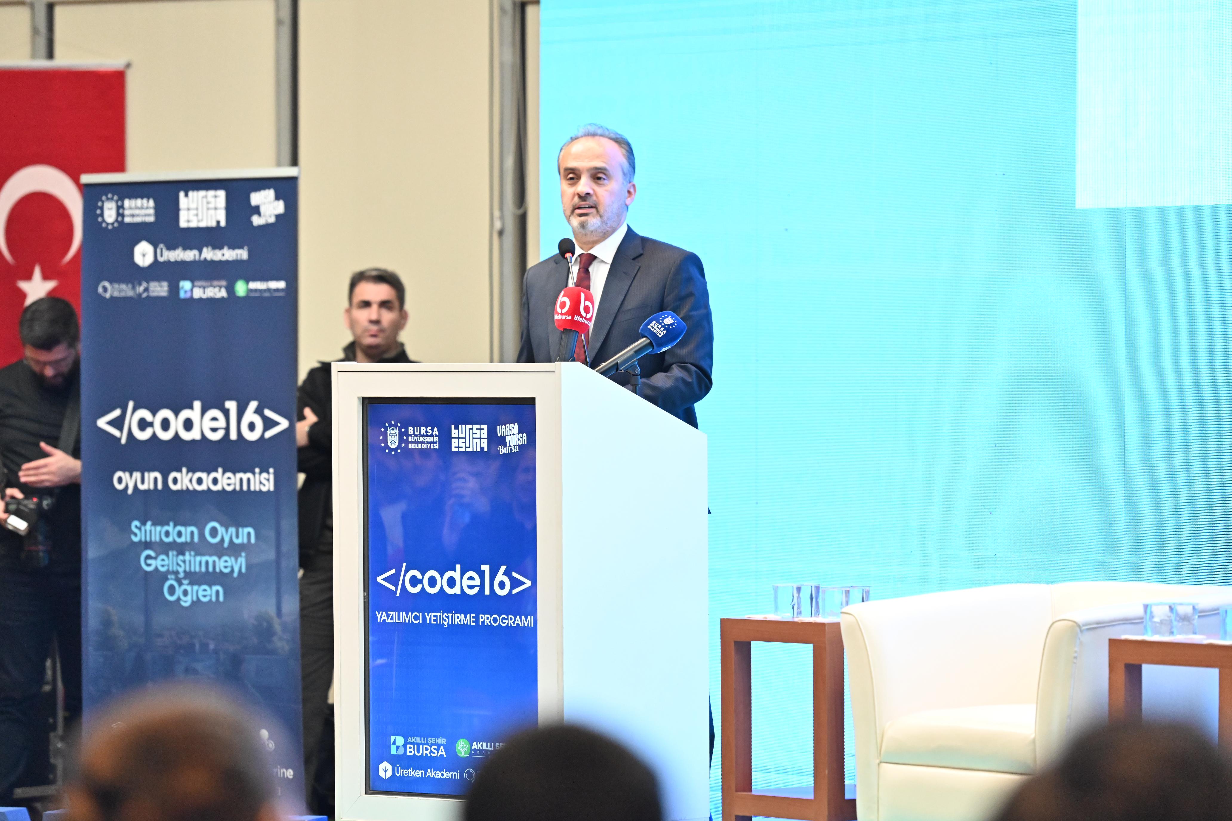 Bursa Büyükşehir Belediye Başkanı Alinur Aktaş, üniversite yıllarına ait bir anısını anlatarak konuşmasına başladı. Üniversitedeki bilgi işlem dersinin vizesinde ve finalinde 100 almasına rağmen hiç bilgisayar görmediğini söyleyen Başkan Alinur Aktaş, gittiği bilgisayar kursunda bilgisayarla tanıştığını belirtti. Gelinen noktanın artık baş döndürücü olduğunu ancak bunun yeterli olmadığını ifade eden Başkan Aktaş, “Bizim şehrimizden unicornlar çıkmasını istiyoruz. Bizim teknoloji üretmemiz gerekiyor. Katma değerli işler yapmalıyız. Code 16 sayesinde şehre değer katacak yeni arkadaşlar yetişsin istiyoruz. Bilim ve teknoloji konusunda Bursa, Türkiye’nin öncü şehirlerinden bir tanesi. Göreve geldikten sonra ‘Akıllı Şehircilik ve İnovasyon Daire Başkanlığı’nı kurduk. Science Expo Bilim Şenliği, Mobilfest, Robokod Kodlama Eğitimi, bilişim sınıflarının kurulması, Astrofest, Akıllı Şehircilik ve İnovasyon Merkezi çalışmalarımızdan bazıları. Gökmen Uzay Havacılık Eğitim Merkezi, şehrin önemli kazanımlarından bir tanesidir. Bizim vizyon projemiz olan ‘Bursa Bilim ve Teknoloji Merkezi’ de Türkiye’nin bilim ve teknoloji alanındaki gelişimine hız kazandırmayı ve bu kapsamdaki ilk örnek olarak bütün Türkiye’ye model olmayı hedefleyen bir merkez” dedi.