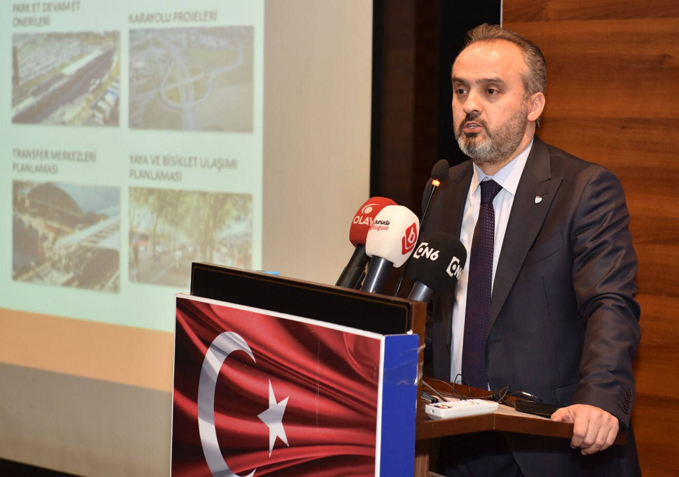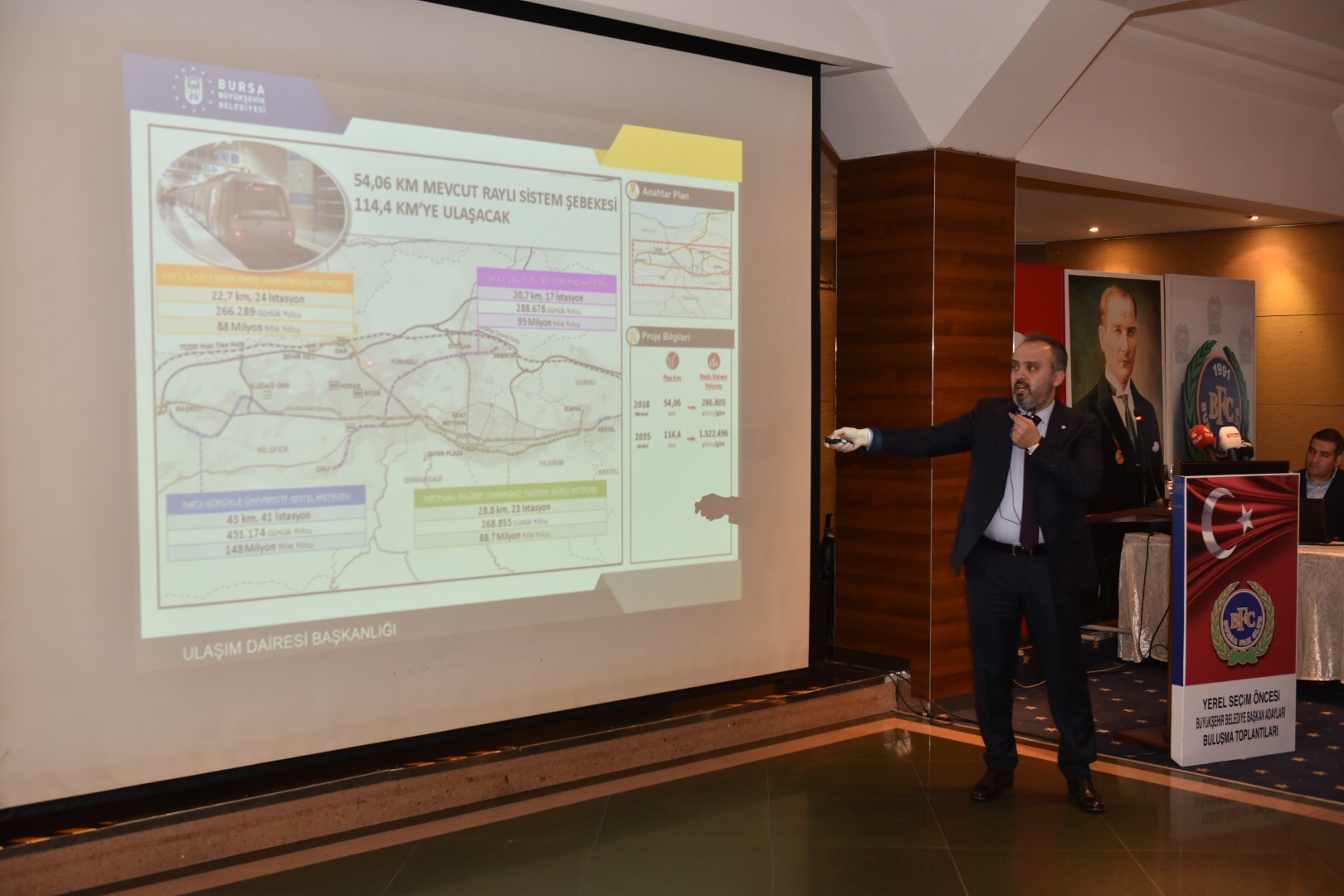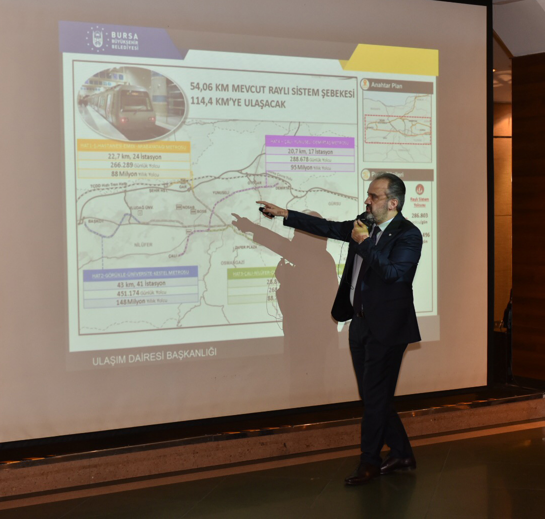Başkan Aktaş, ulaşım konusunda yapılan hazırlıkları özetlediği sunumunda, mevcut metroda sinyalizasyon optimizasyonu yapılacağını söyleyerek, “Ulaşım en acil konumuz. Orta ve uzun vadede çalışmalarımız var, ulaşım master planını seçim sonrasında gündeme alacağız. Mevcut raylı sistem hattı sinyalizasyon yatırımı ile 3.75 dakikadan 2 dakikaya inerek yıllık 70 milyonluk yolcu artışı olacak. Mevcut raylı sistem hatları hat 1 ve hat 2, Şehir Hastanesi uzatması, Görükle ve Hasanağa uzatması, yeni iki tane metro hattı, hat 3 ve hat 4 ile 54.06 km’lik mevcut raylı sistem hattı 114,4 km’ye ve günlük taşınan yolcu sayısı da 286 binden 1 milyon 322 bine ulaşacak. 400 km bisiklet yolu oluşturulacak. Acemler viyadük ve servis yolları, stat bağlantı yolları ve Yakın Çevre Yolu’na bağlayan köprü ve kavşaklarla kapasitesi artırılarak trafik sorunu çözülecek. 18 noktada toplu taşıma transfer merkezi ve 30 noktada, ‘Park et, devam et, P&R’ alanlarıyla ulaşım entegrasyonu sağlanacak” diyerek ulaşım başta olmak üzere kente değer katacak çalışmaların hazır olduğuna işaret etti.