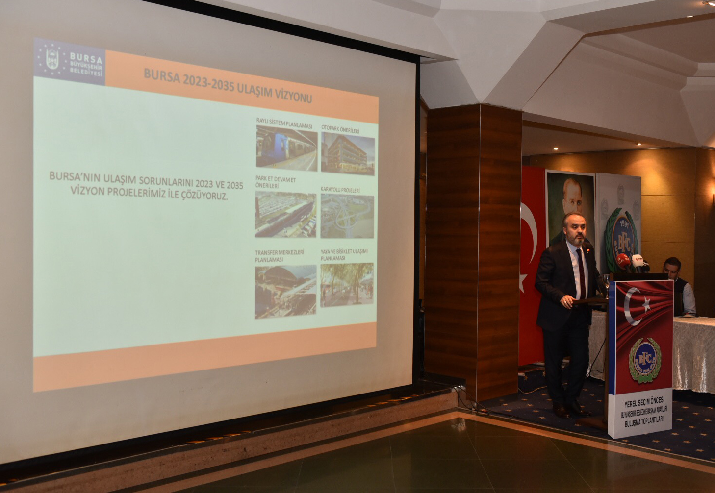 Bursa Büyükşehir Belediye Başkanı Alinur Aktaş, Bursa Fan Club tarafından Almira Otel’de gerçekleştirilen ‘Yerel Seçimler Öncesi Büyükşehir Belediye Başkan Adayları Buluşma Toplantıları’nda, ‘Bursa 2023-2035 Ulaşım Vizyonunu anlattı. Bursa’nın sahip olduğu değerlerle özellikli olduğunu söyleyen Başkan Aktaş, “Bursa, ezberleri bozan bir şehir. Bursa’da kentleşmeyle ilgili bir sorun var. Bursa ile ilgili bir tasavvur oluşturmalıyız. Bursa’da 14 bin 326 kişiye sorduk, her fırsatta vatandaşlarımızı dinledik. Bursa’nın öncelikli sorununu ulaşım olduğunu olarak tespit ettik ve bu noktada çalışmalara hız verdik” dedi.