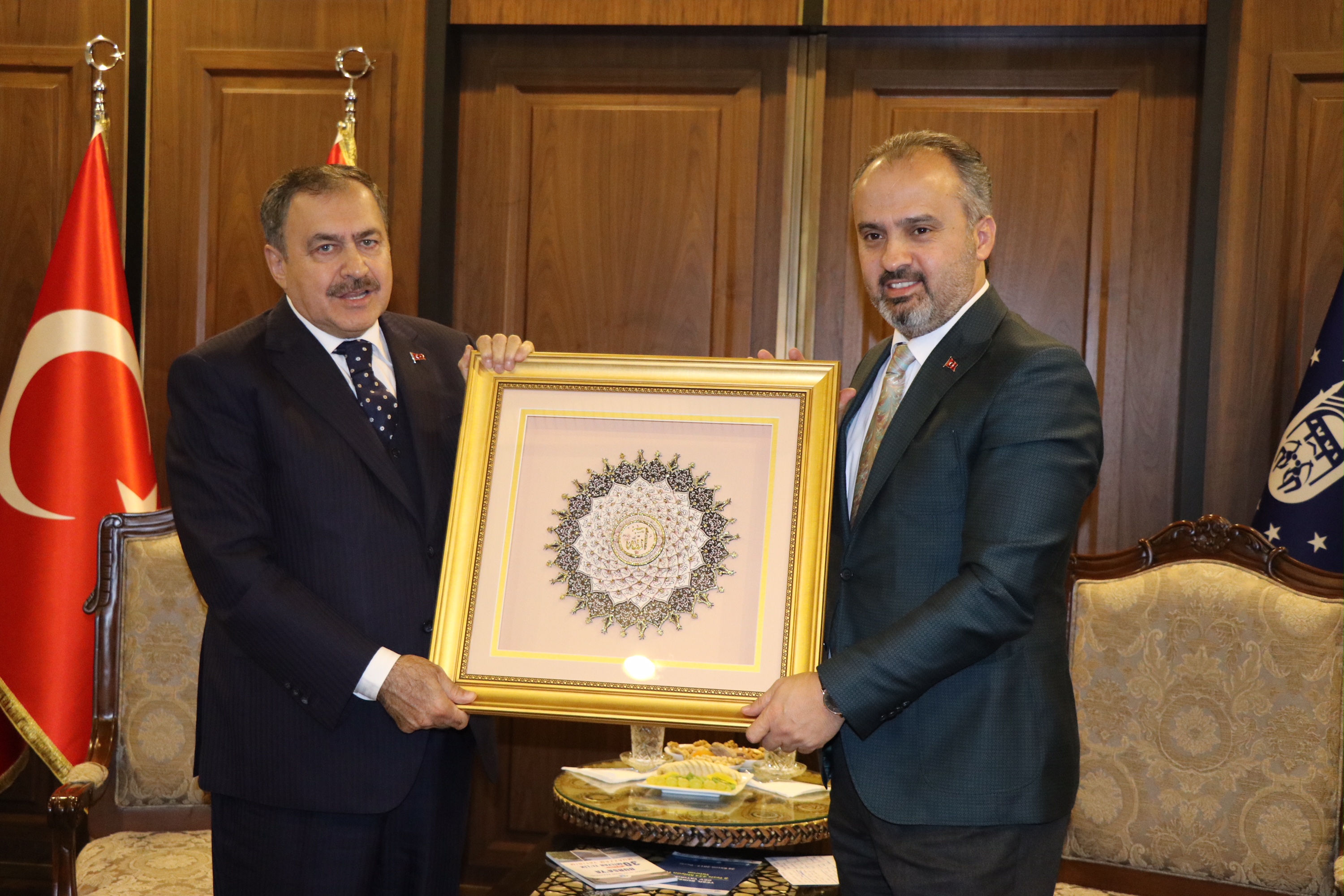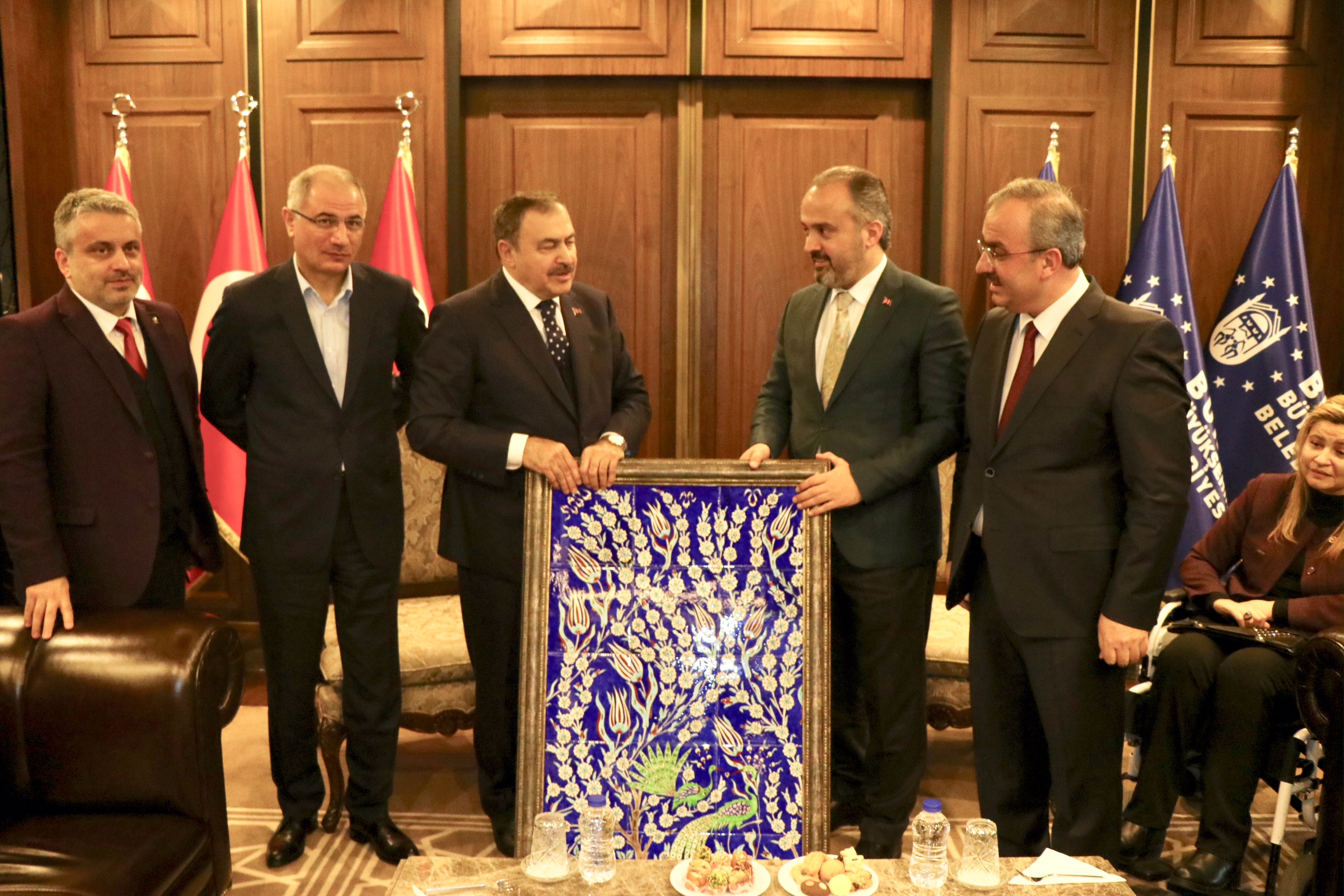 Büyükşehir Belediye Başkanı Alinur Aktaş ise Bakan Eroğlu’nu Büyükşehir’de ağırlamaktan büyük memnuniyet duyduklarını ifade etti. Bakan Eroğlu’nun Cumhurbaşkanı Erdoğan’la birlikte İstanbul Büyükşehir Belediyesi’nde, devletin çeşitli kademelerinde ve son olarak uzun yıllar Orman ve Su İşleri Bakanlığı’nda engin tecrübelerinin bulunduğunu kaydeden Başkan Aktaş, “Sayın bakanımız görev aldığı süreçler boyunca harika işlere imza attılar. Ülkemizin yüz akı oldular. Heyecanlı ve mutluyuz. Tecrübeli ve değerli bakanımızı Bursa’da ağırlıyoruz. Derdimizi ve heyecanımızı bakanımızla paylaşacağız. Milletvekillerimiz, ilçe belediyelerimiz ve teşkilatımızla sorumluluğumuzu yerine getirip, Bursa ve Uludağ’ın sorunlarını minimize etmenin peşine düşeceğiz. İnşallah başta Uludağ olmak üzere diğer konularda sayın bakanımızın tecrübesinden ve desteğinden faydalanarak harika işlere imza atacağız. Yapılmış olanlar, yapılması gerekenler ve gecikenler var. Bunlar en kısa zamanda düzene girecek” açıklamasında bulundu. Başkan Aktaş, Büyükşehir Belediye Başkanlığı için kendisini ilk tebrik eden kabine üyesinin Bakan Eroğlu olduğunu hatırlattı. Büyükşehir Belediye Başkanı Alinur Aktaş, ziyaretin anısına Bakan Eroğlu’na Esma-ül Hüsna’nın yanı sıra tarihi İznik çinisinden yapılmış ‘yaşam ağacı’nı simgeleyen tablo hediye etti. Mustafakemalpaşa Belediye Başkanı Sadi Kurtulan da, Bakan Eroğlu’na Suuçtu Şelalesi’nin tablosunu verdi.