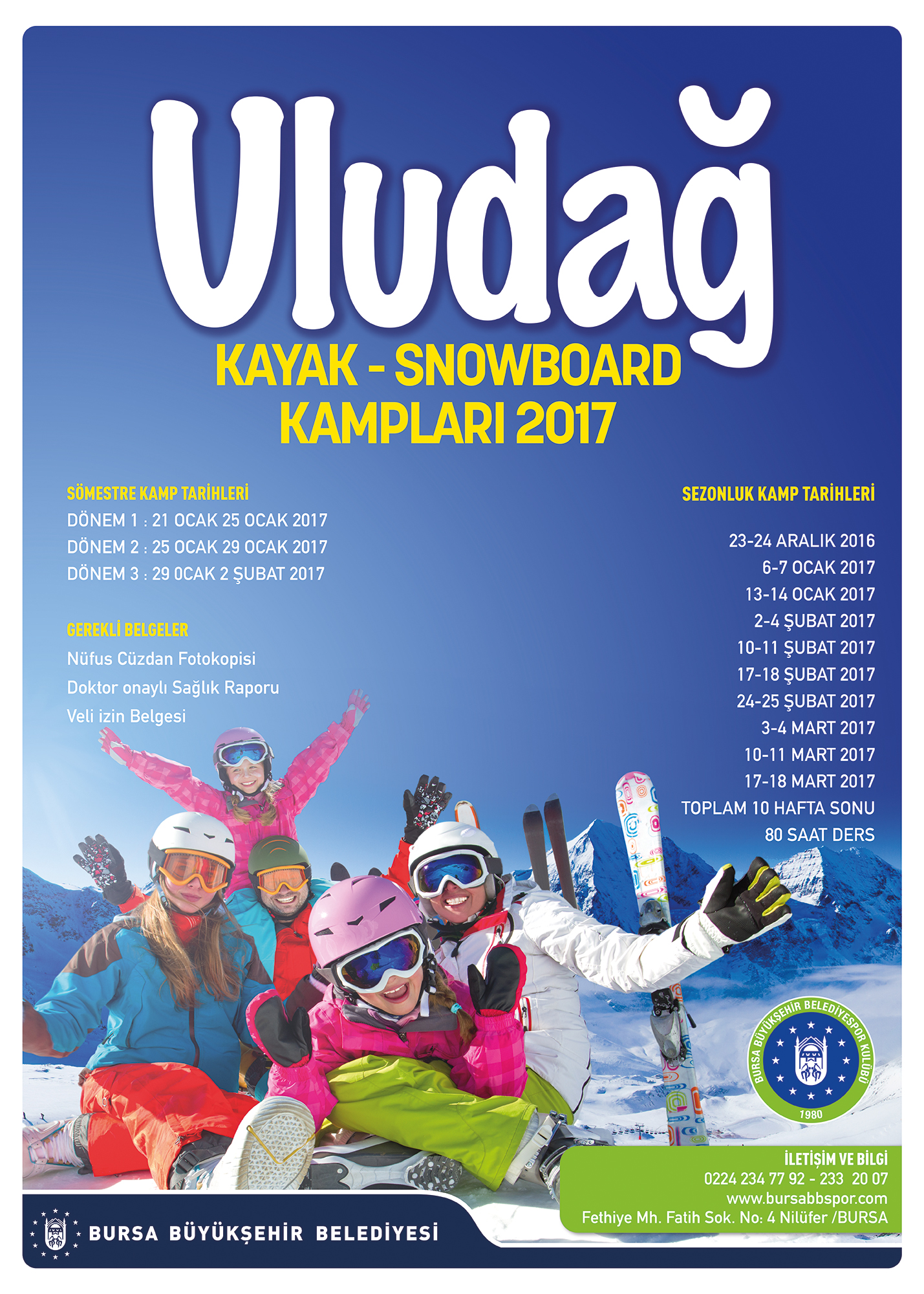 24 Aralık tarihinde başlayacak olan 7-15 yaş arası kayak severlerin kayıt olabileceği sezonluk kamp dönemi 10 hafta sonu sürecek ve sporcular 80 saat kayak-snowboard eğitimi alacak. Ayrıca sporcuların Uludağ´daki konaklamaları, ulaşım, telesiyej, kayak-snowboard malzemeleri ve giysileri Büyükşehir Belediyespor Kulübü tarafından karşılanacak. Kontenjan sayısı 25 kişiden oluşan Bursa Büyükşehir Belediyespor Kulübü Sezonluk Kayak-Snowboard Kampı 18 Mart´ta son bulacak.