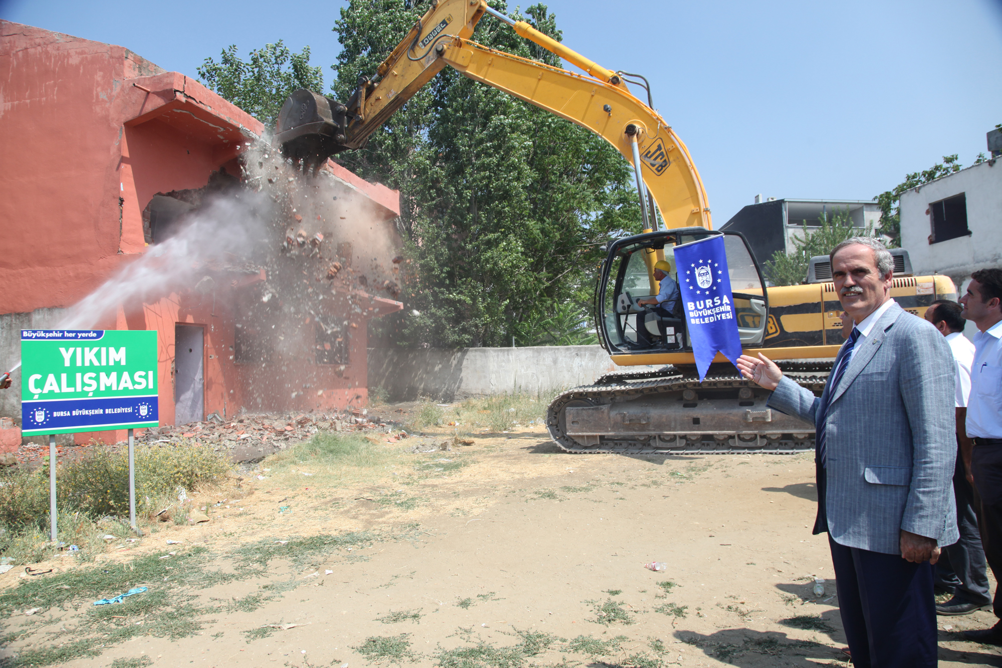 Bursa’nın daha sağlıklı ve yaşanılabilir bir kent olması için tüm mahalleleri spor tesisi, park, meydan ve sağlık ocağı gibi sosyal donatı alanlarına kavuşturan Büyükşehir Belediyesi, yeterli sosyal donatı alanı bulunmayan Ulus Mahallesi’ne meydan kazandırılması çalışmalarını başlattı. Projenin uygulanacağı yaklaşık 3 bin 500 metrekare alan üzerindeki binalar kamulaştırılırken, yaklaşık 2 milyon TL harcanan kamulaştırmanın ardından yıkımlar da başlatıldı. Alan üzerinde kalan son binaların yakım çalışmasını yerinde inceleyen Büyükşehir Belediye Başkanı Recep Altepe, Ulus Mahallesi’ne de halkın nefes alabileceği modern bir meydan kazandıracaklarını söyledi.