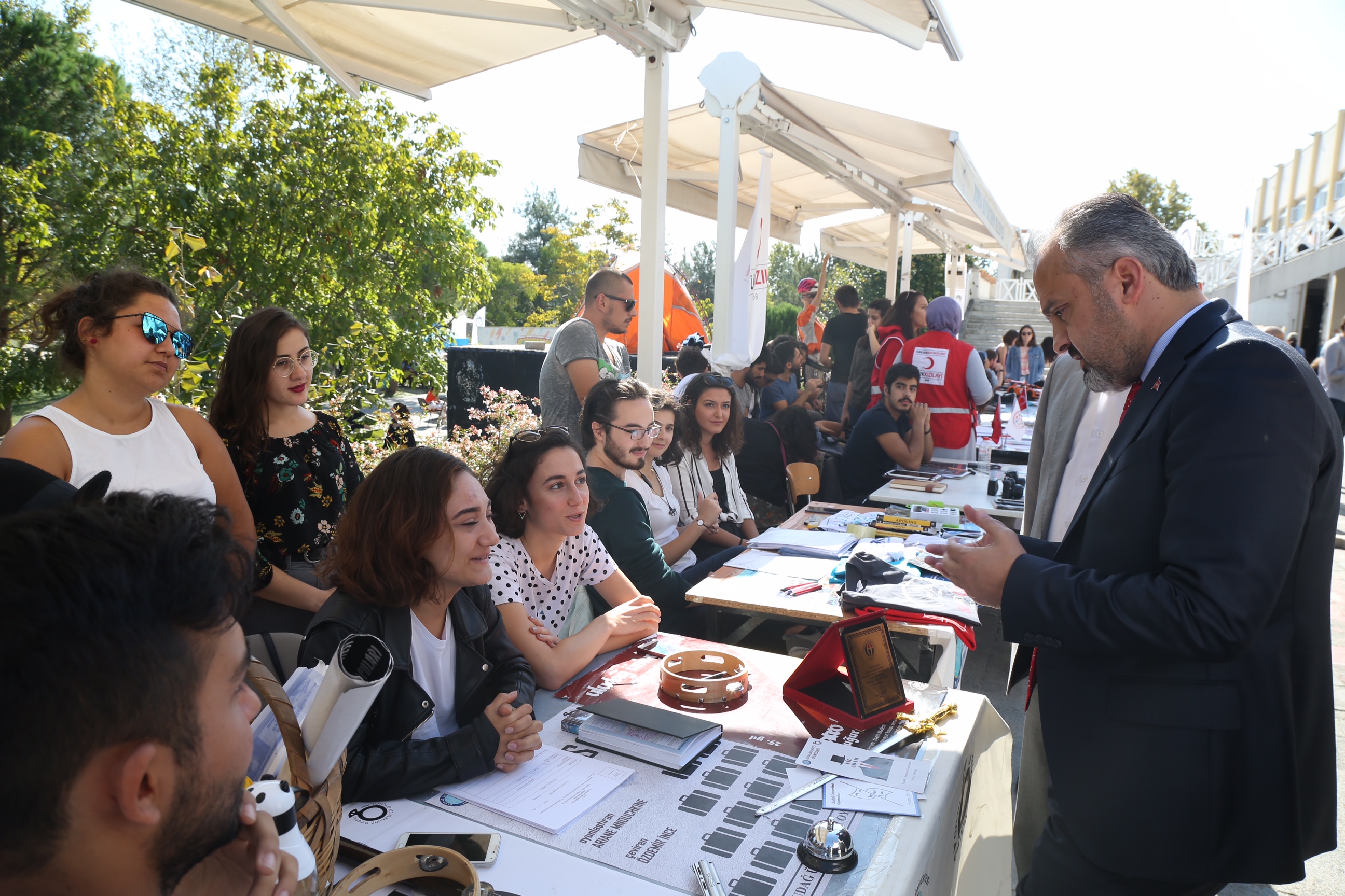 Eğitime ve ülkemizin yarınları olan gençlere büyük önem veren Bursa Büyükşehir Belediyesi, Uludağ Üniversitesi öğrencilerinin de yanında olmaya devam ediyor. Bursa Büyükşehir Belediye Başkanı Alinur Aktaş, 2018-2019 eğitim ve öğretim yılının başlamasıyla Uludağ Üniversitesi Öğrenci Toplulukları'nın tanıtımı için kurulan stant alanını gezerek gençlerle sohbet edip, çalışmaları hakkında bilgi aldı. Yeni kayıt yaptıran ve eğitimine devam eden öğrencilerle fikir alışverişinde bulunan Başkan Aktaş, AK Parti Gençlik Kolları ve TÜGVA Bursa Şubesi'nin de stantlarının yer aldığı alandaki etkinlikleri de yakından takip etti.