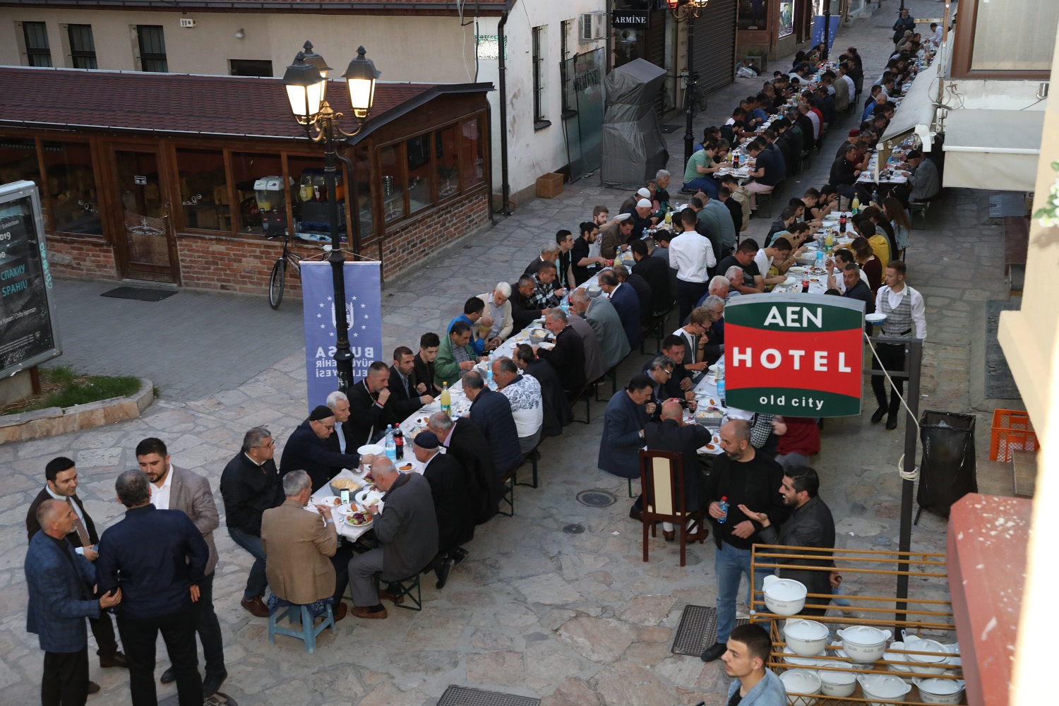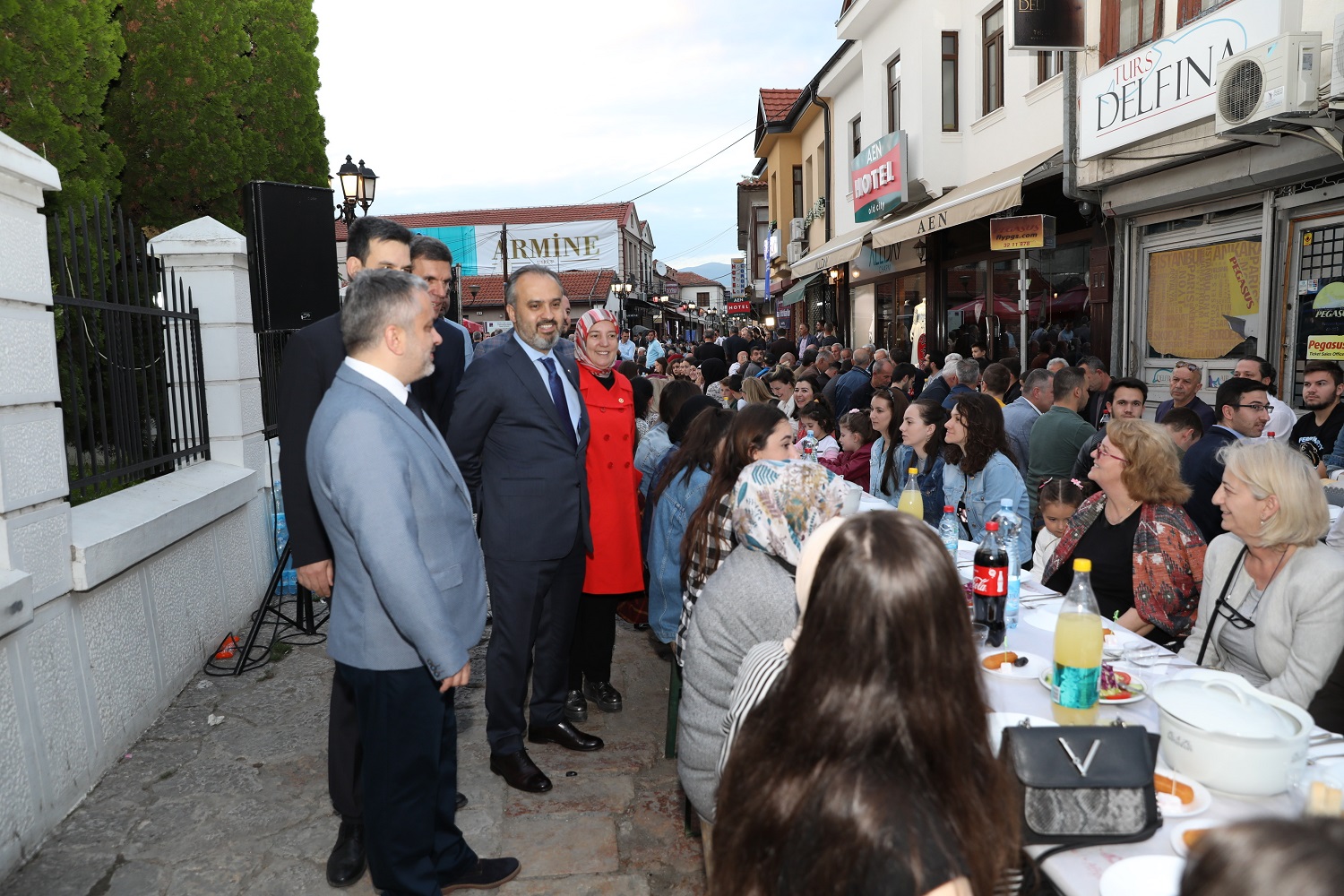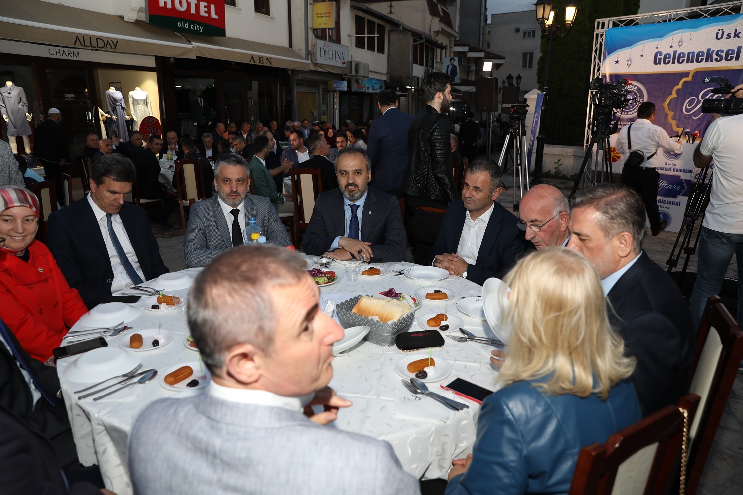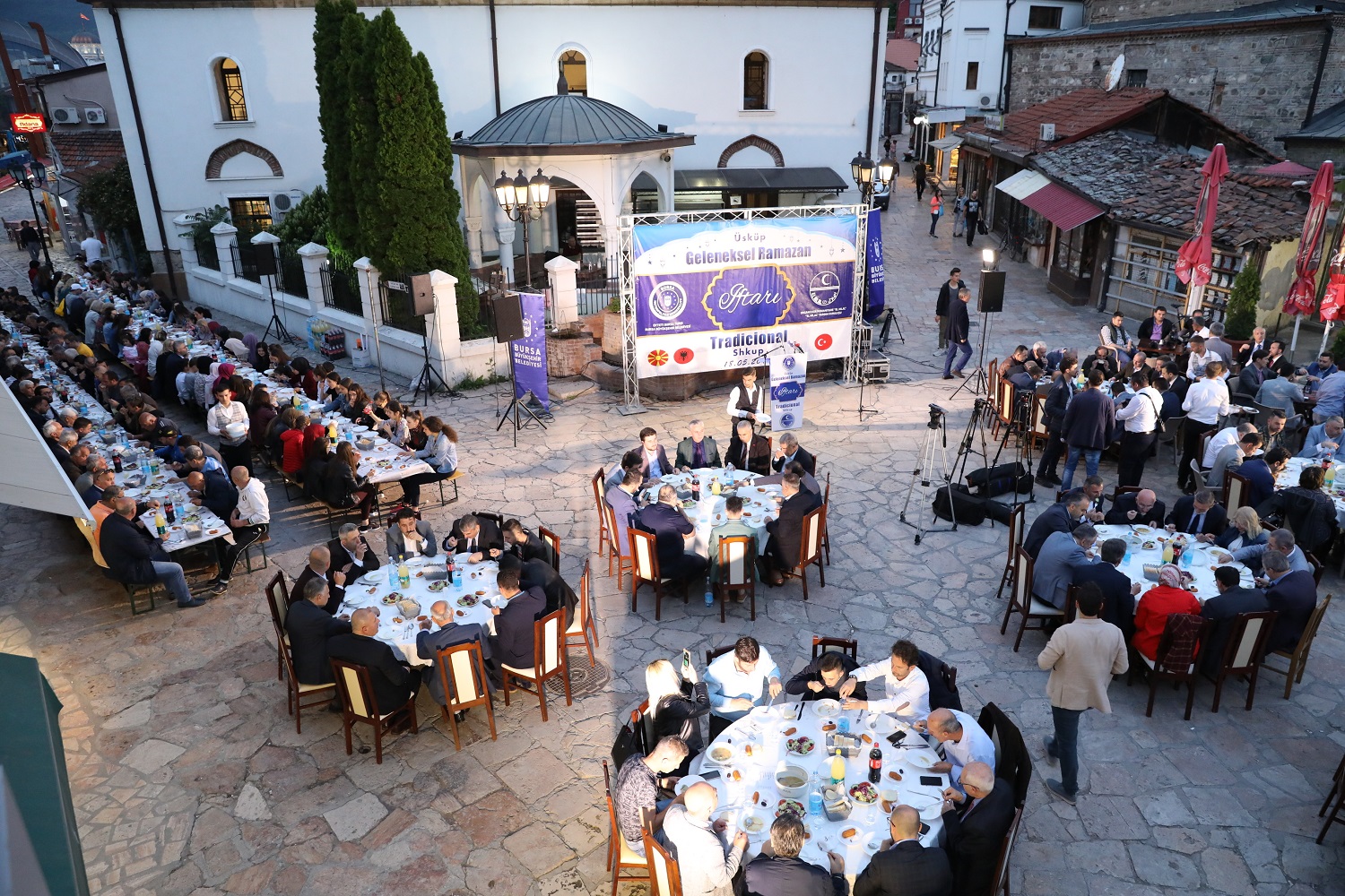 Üsküp, tarihi günlerinden birini daha yaşadı. Bursa Büyükşehir Belediyesi’nin El Hilal Derneği’yle ortaklaşa organize ettiği iftar yemeği, yoğun katılıma sahne oldu. Yüzlerce Üsküplü ‘aileleriyle birlikte’ kurulan sofralarda orucunu açarken; Balkan Müslümanlarını Türkiye’nin Üsküp Büyükelçisi Tülin Erkal Kara, AK Parti Bursa İl Başkanı Ayhan Salman, Bursa Ticaret ve Sanayi Odası (BTSO) Başkanı İbrahim Burkay, AK Parti Bursa milletvekilleri Emine Yavuz Gözgeç, Zafer Yıldız, Mustafa Esgin ve Refik Özen de yalnız bırakmadı. Tarihi Murat Paşa Camii önünden başlayarak Türk Çarşısı boyunca uzayan sofralar, Üsküplü Müslümanların ilgisiyle şenlendi. İftar yemeğinin duası ise Türkiye Büyükelçiliği Din Hizmetleri Müşaviri Murat Altan tarafından yapıldı.