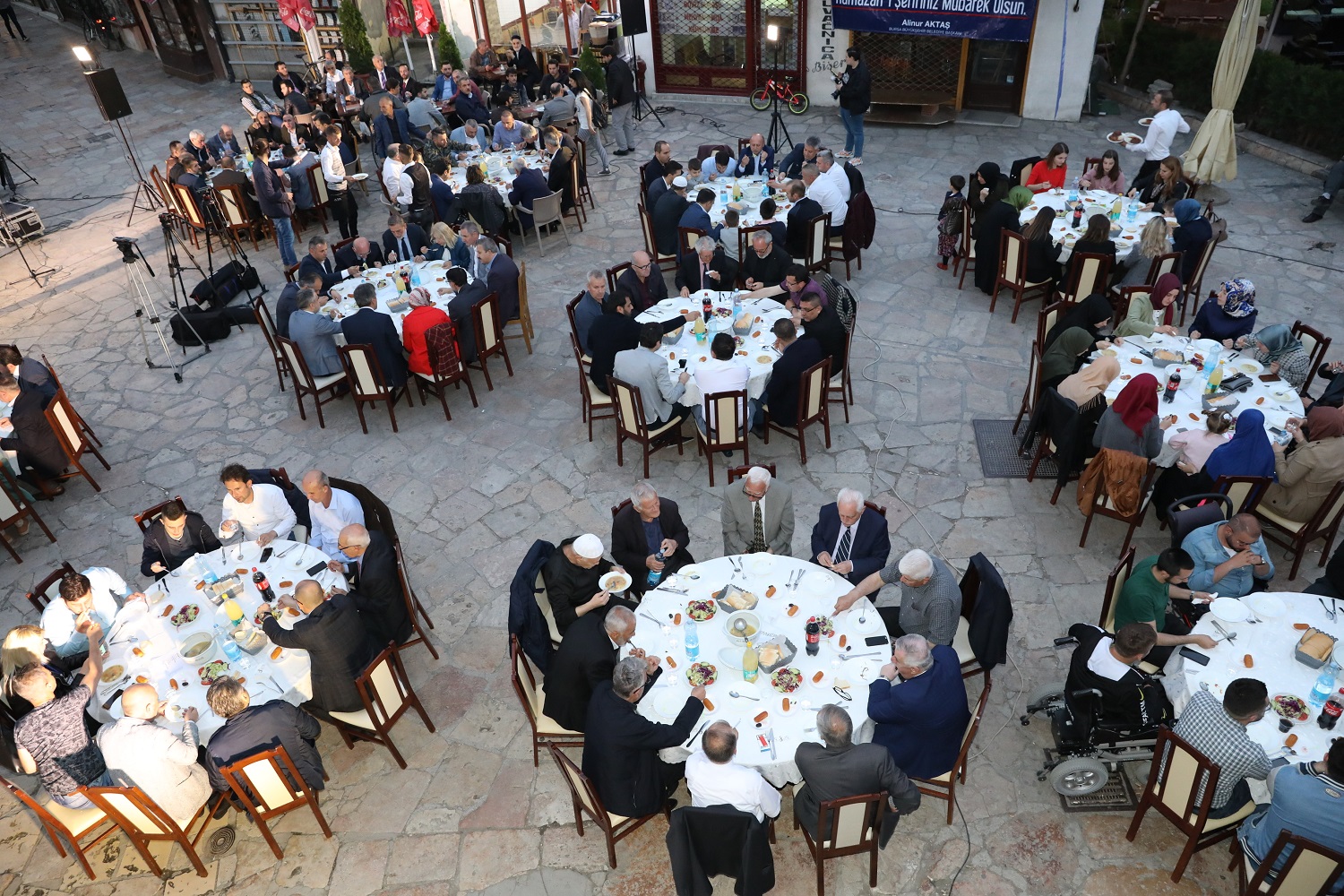 BURSA - Bursa Büyükşehir Belediyesi’nin El Hilal Derneği işbirliğiyle verdiği iftar yemeğine yüzlerce Üsküplü ‘aileleriyle birlikte’ katıldı. Türk Çarşısı Tarihi Murat Paşa Camii önündeki organizasyonda konuşan Büyükşehir Belediye Başkanı Alinur Aktaş, Balkan ülkelerindeki Müslümanlara verdikleri desteğin dün olduğu gibi bugün ve yarın da süreceğini söyledi.