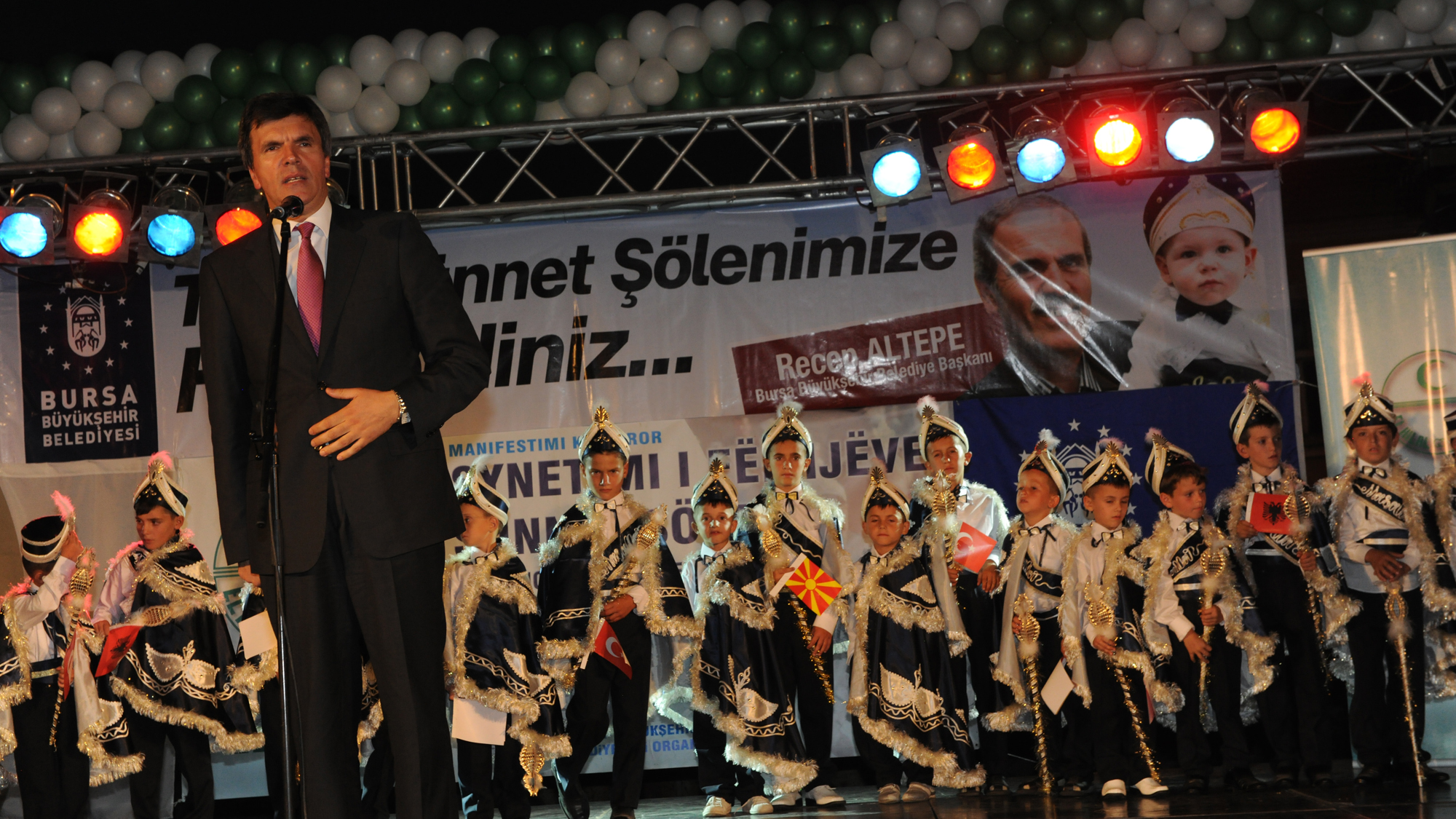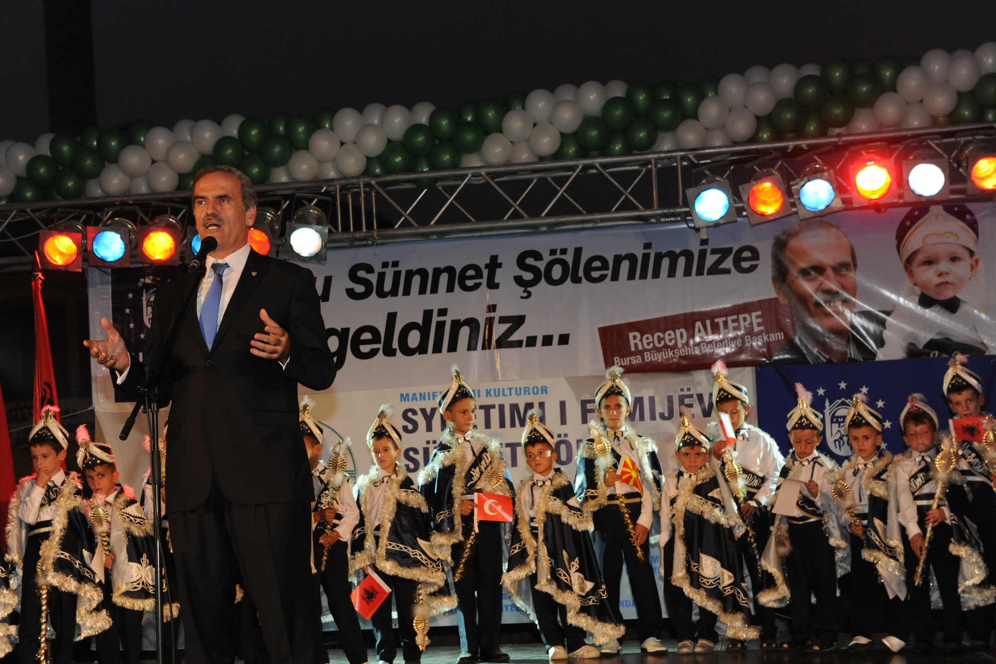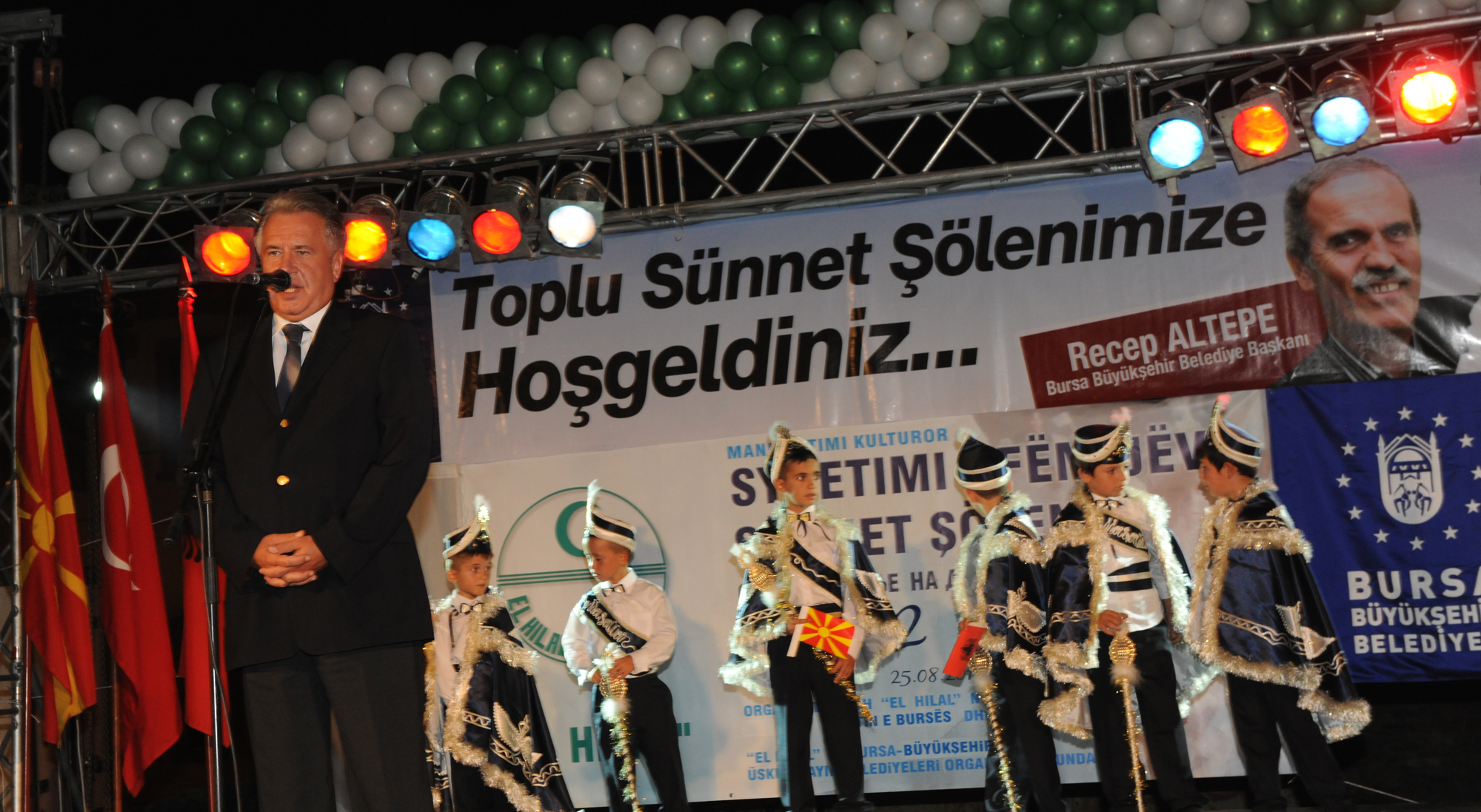 Tarihi ve kültürel mirası ayağa kaldırma çalışmaları kapsamında Osmanlı coğrafyasında yer alan ülkelerdeki ecdat yadigârı eserleri bir bir ayağa kaldıran Bursa Büyükşehir Belediyesi, Makedonya’nın başkenti Üsküp’te düzenlediği sünnet şöleni ile Balkanlardaki hizmet halkasına bir yenisini daha ekledi. El Hilal Derneği ve Üsküp Çayır Belediyesi tarafından 10 yıldır düzenlenen ve son 5 yıldır da Bursa Büyükşehir Belediyesi’nin destekleriyle gerçekleşen sünnet şölenin altıncısı Üsküp Kalesi önünde yapıldı. Törene Bursa Büyükşehir Belediye Başkanı Recep Altepe’nin yanı sıra Türkiye Cumhuriyeti Üsküp Büyükelçisi Gürol Sökmensüer, El Hilal Yardımlaşma Teşkilatı Başkanı ve Üsküp Milletvekili Behicüddin Şehabi, Çayır Belediye Başkanı İzzet Meciti, Bursa ve Üsküp’ten gelen davetliler ve sünnet çocuklarının aileleri katıldı.