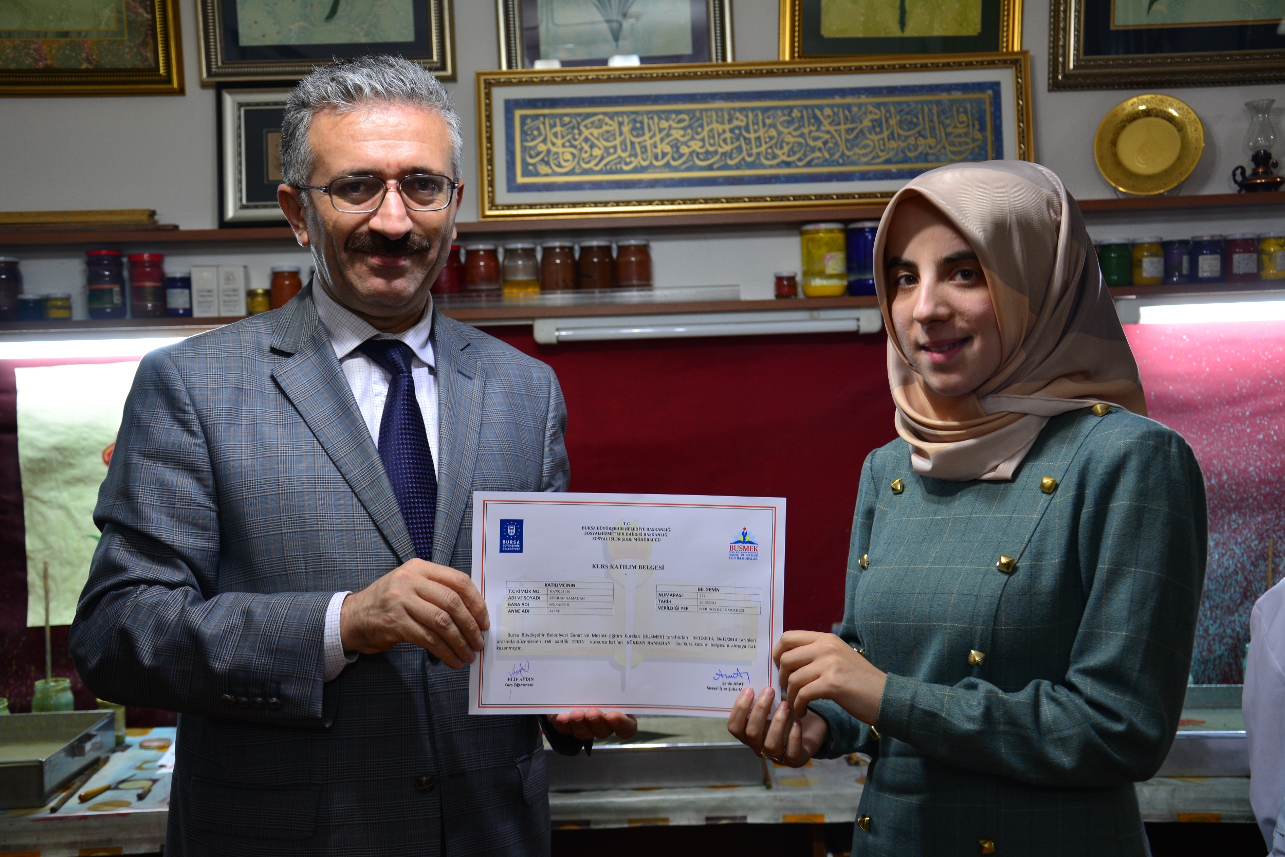 BUSMEK, ülkeler arasında kültür köprüsü kuran hizmetleriyle dikkat çekiyor. Makedonyalı kardeşler Şükran ve Ümran Ramadan, BUSMEK’te ebru eğitimi almak için Üsküp’ten Bursa’ya geldi. Ebru eğitmeni Elif Aydın’dan ebru eğitimi alan ikiz kardeşler, 25 günlük eğitim sürecini başarıyla tamamladı. Ramadan kardeşlerin sertifikalarını, Bursa Büyükşehir Belediyesi Sosyal İşler Şube Müdürü Şahin Arat verdi.