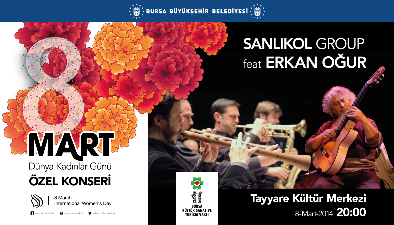 Büyükşehir Belediyesi ile Bursa Kültür Sanat ve Turizm Vakfı (BKSTV) organizasyonu ve Durmazlar Makina A.Ş. sponsorluğunda gerçekleştirilecek olan ‘8 Mart Dünya Kadınlar Günü Konseri’, usta sanatçılar Erkan Oğur ile Mehmet Ali Sanlıkol ve grubunu aynı sahnede bir araya getiriyor.