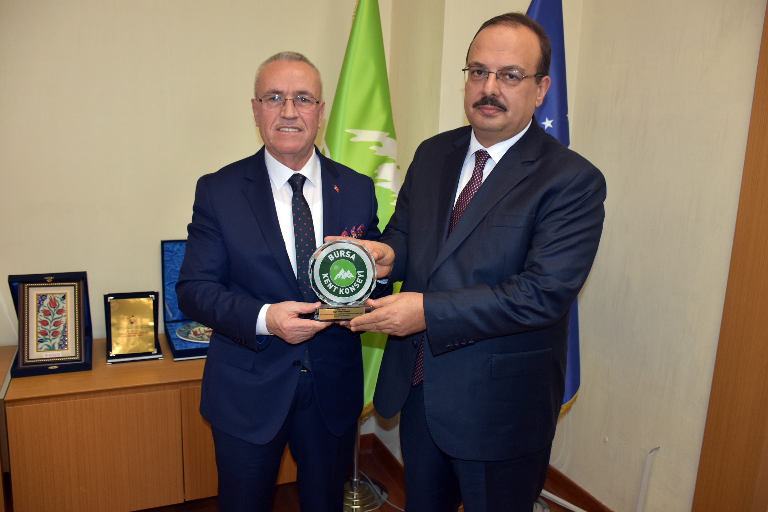 Ziyaretin sonunda Bursa Kent Konseyi Başkanvekili Şuayip Toprak, Vali Yakup Canbolat’a günün anısına cam plaket hediye etti.