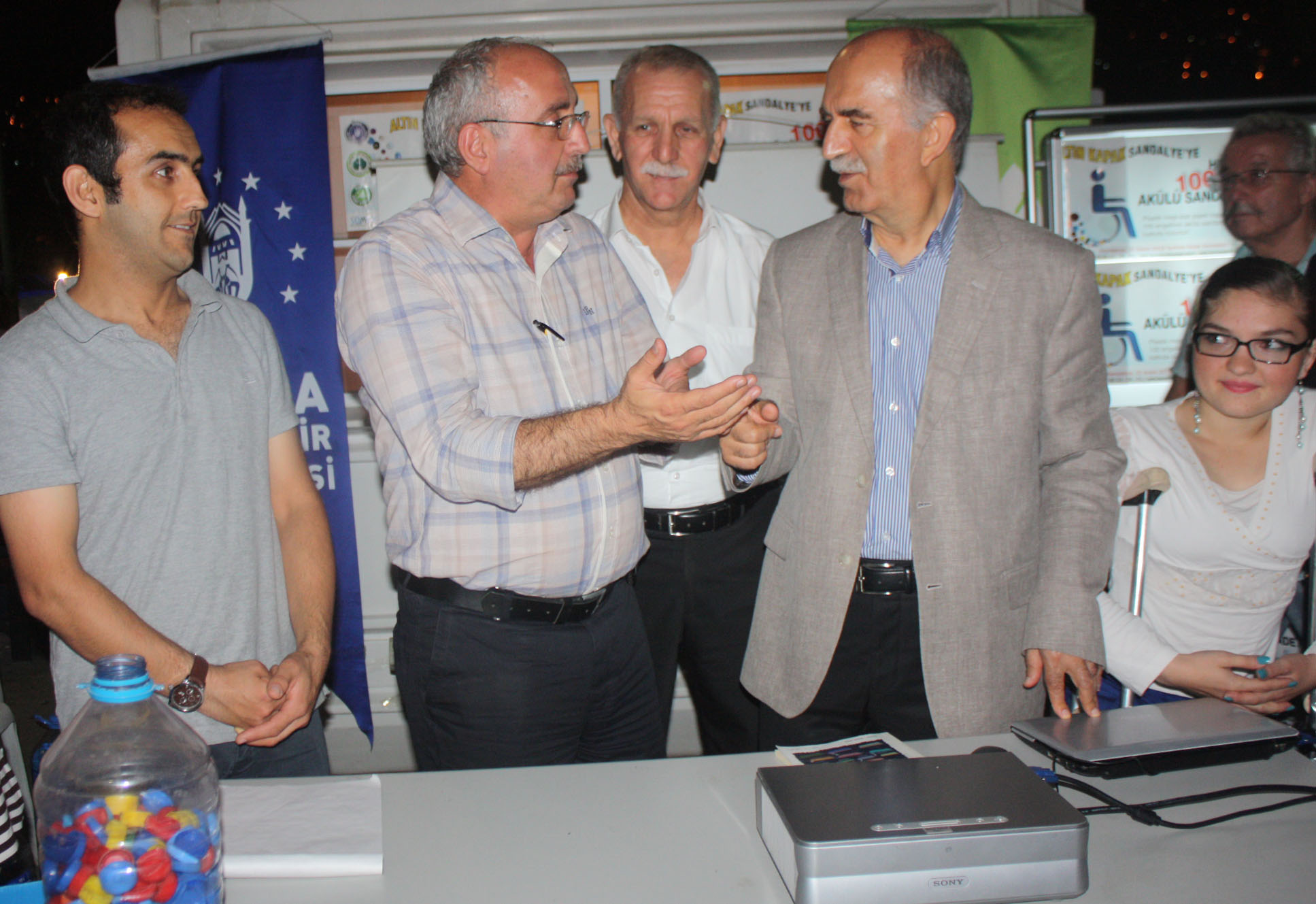 Engellilerin toplum içinde eğitim, üretim kapasitelerinin geliştirilmesi ve toplumsal yaşam içinde daha fazla yer almalarının sağlanması için örnek projeler hayata geçiren BKK Engelliler Meclisi, ‘Temaşa-i Ramazan’ etkinlikleri kapsamında açtığı stantla mavi kapak projesini her kesime duyuruyor. Bursa Valisi Şahabettin Harput da Bursa Kent Konseyi Engelliler Meclisi standını ziyaret ederek çalışmalar hakkında bilgi aldı. Emniyet Müdürü Ali Osman Kahya’nın bulunduğu ziyarette proje hakkında bilgi veren BKK Başkanı Semih Pala, Bursa Kent Konseyi’nin Türkiye’ye örnek çalışmalar yaptığını söyledi. Mavi kapak projesinde bugüne kadar 60 akülü sandalye aracını ihtiyaç sahiplerine dağıttıklarını anlatan Pala, “Toplanan kapaklar ile elde edilen gelirle akülü sandalyeler alınıyor. Hedefimiz 100 adet akülü sandalye dağıtmak. Tüm Bursalıları plastik kapaklar kampanyasına davet ediyorum” dedi.