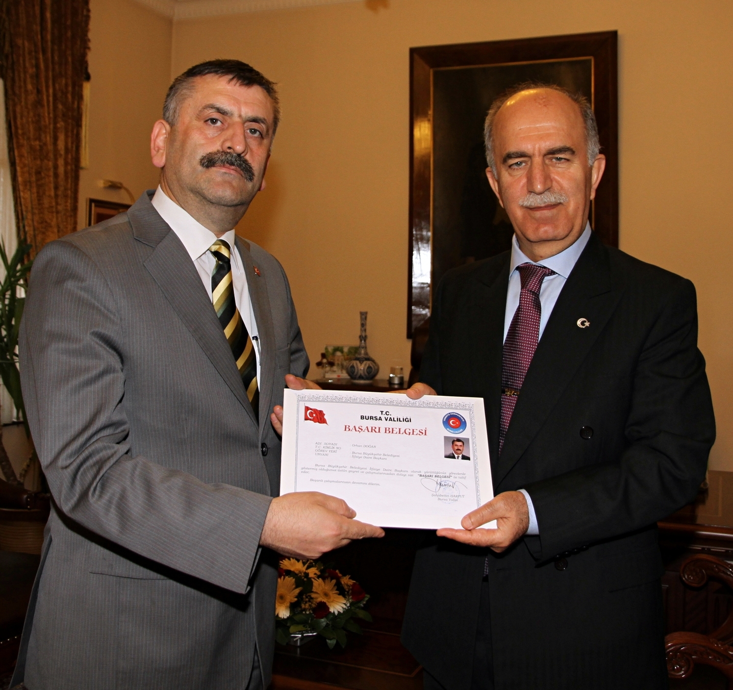 - Bursa Valisi Şahabettin Harput, kentte yürütülen önemli hizmetlerinden dolayı Büyükşehir Belediyesi İtfaiye Dairesi Başkanı Orhan Doğan’a başarı belgesi verdi.
