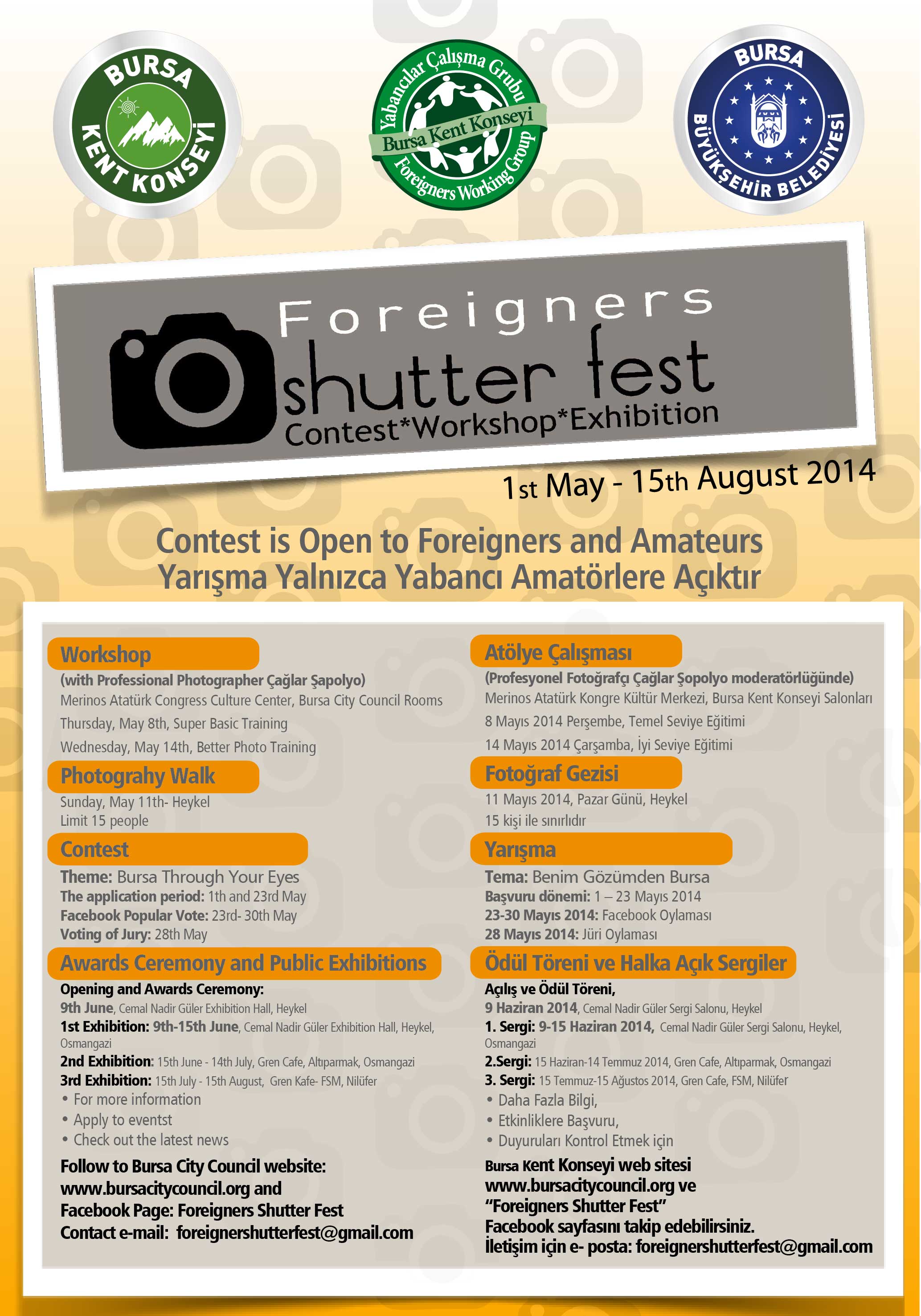 16 ülkeden Bursa’da yaşayan yabancı kökenlilerin katıldığı “Benim Gözümden Bursa” temalı Shutterfest Fotoğraf Yarışması’nın sosyal medya üzerinden yapılan halk oylaması başladı. Katılımcılar https://www.facebook.com/foreignershutterfest/app_451684954848385 adresi üzerinden 30 Mayıs’a kadar beğendikleri fotoğraflara oy verebilecekler.