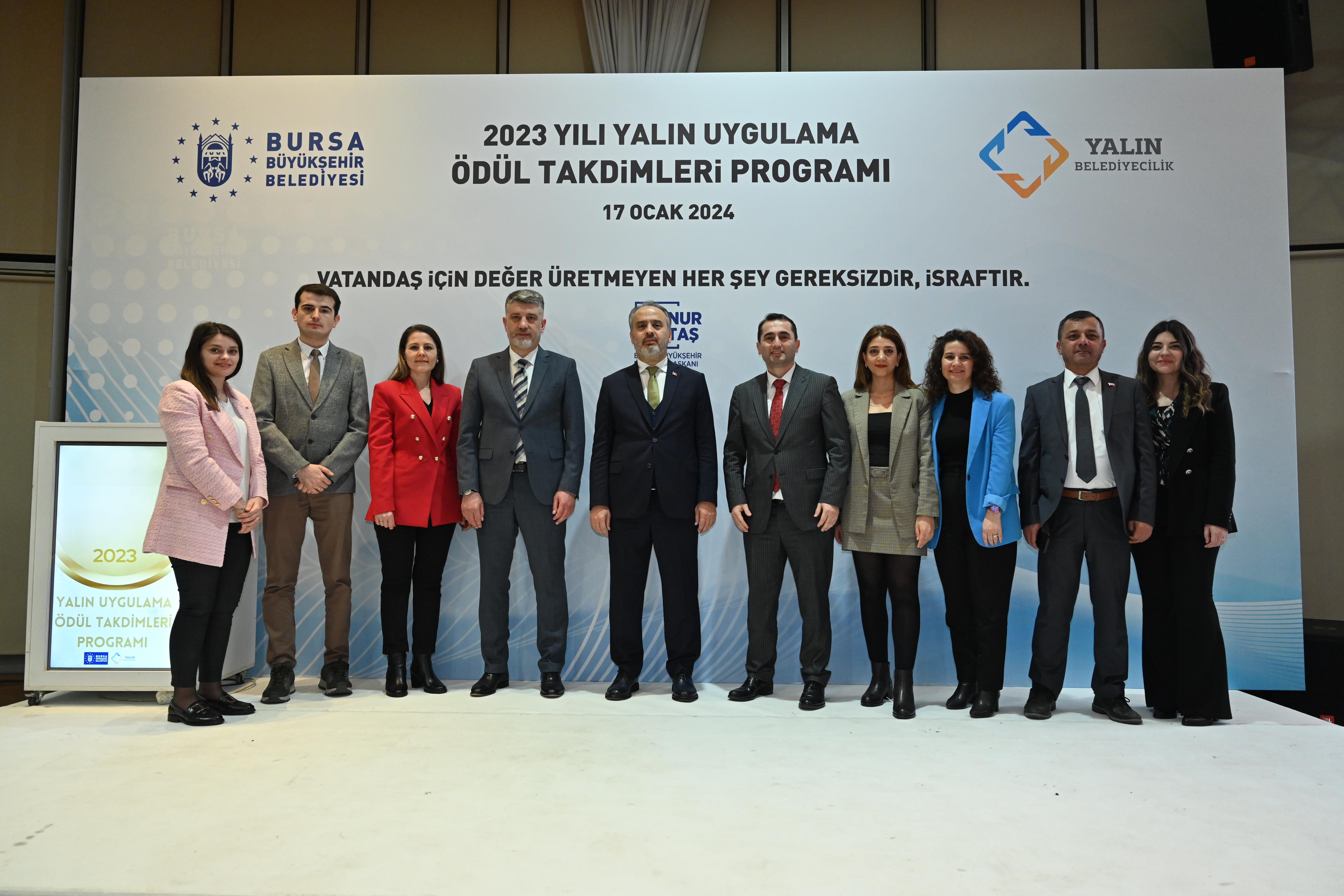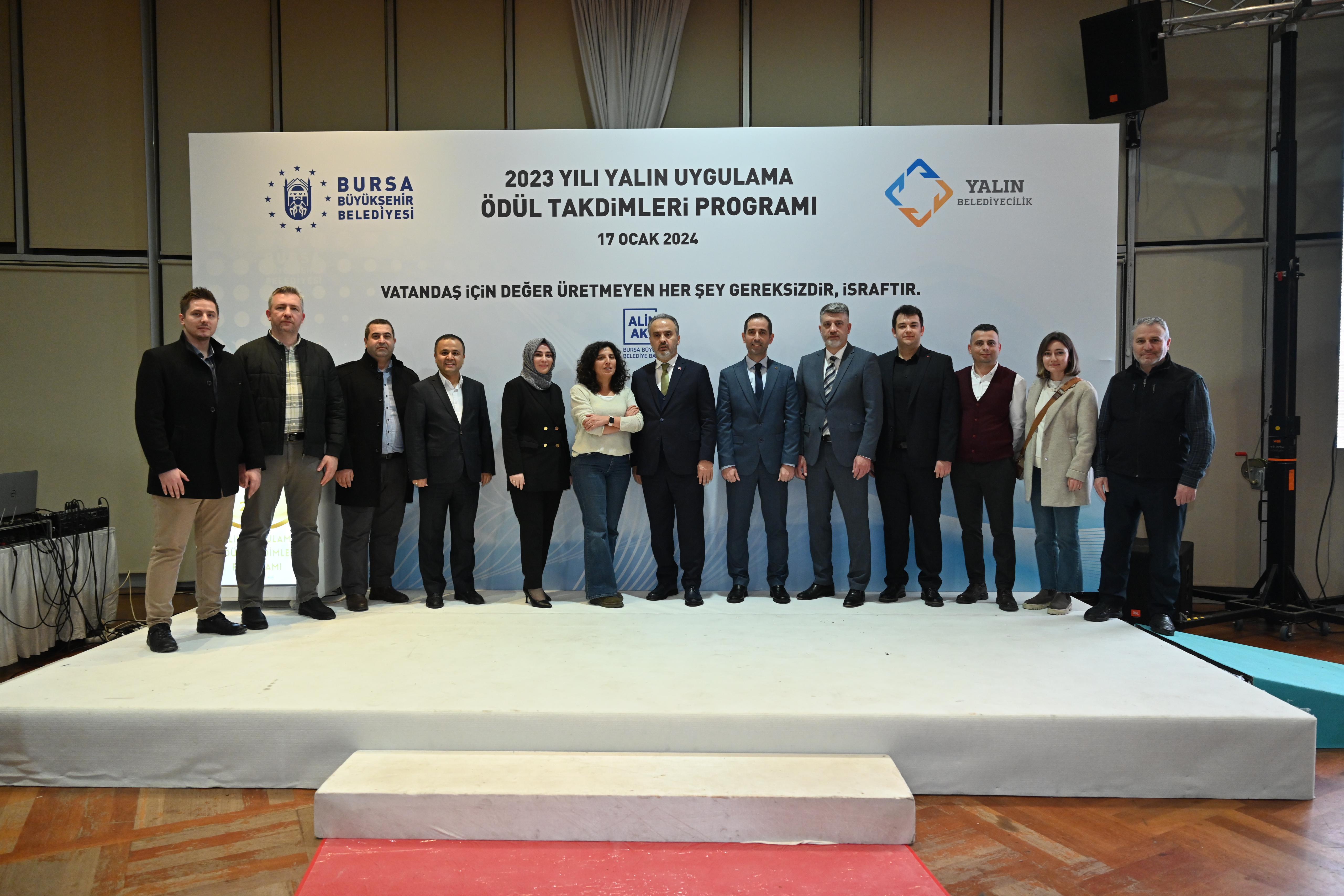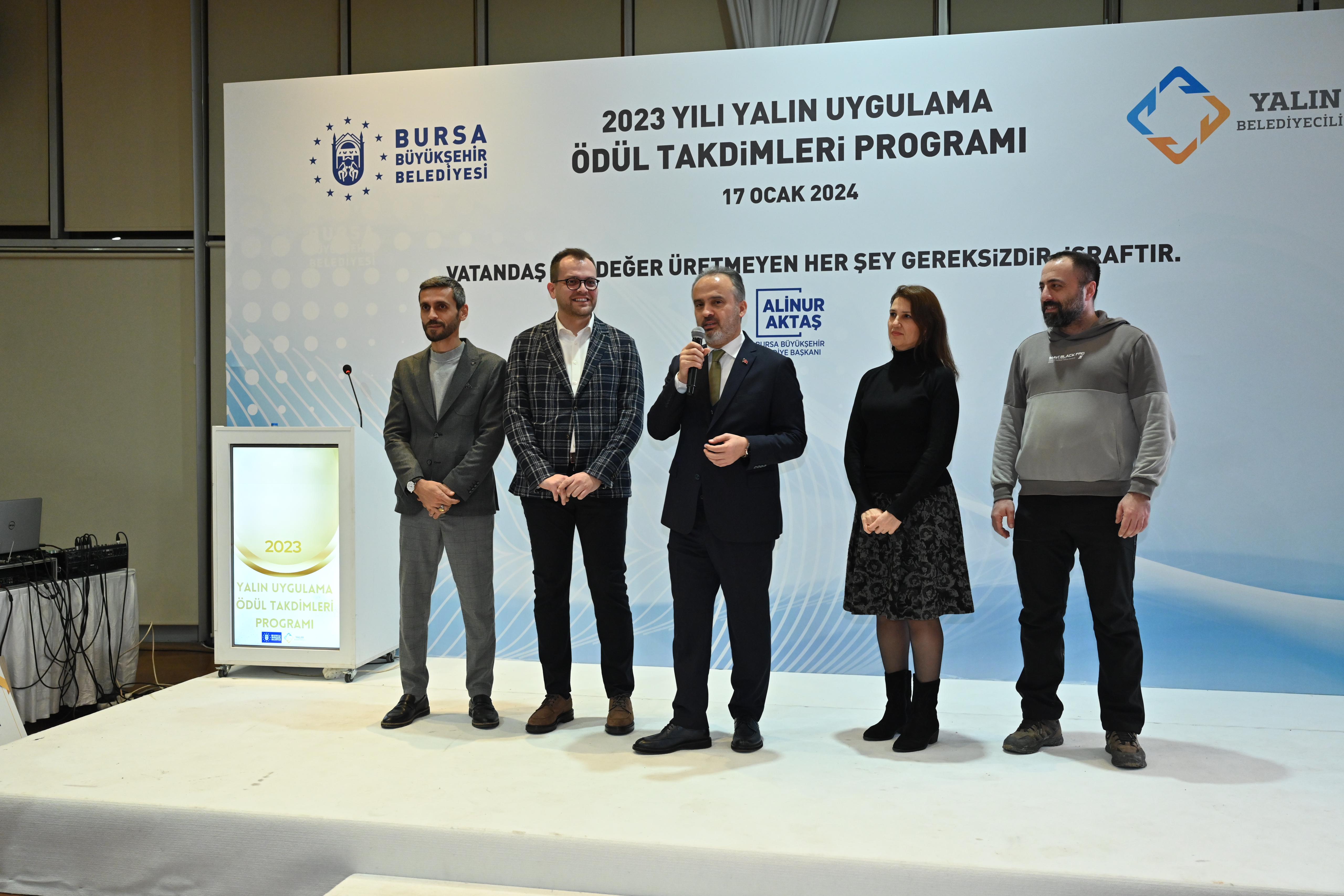 Bursa Büyükşehir Belediyesi, var olan kaynakların en etkin şekilde kullanılarak en verimli hizmetin sunulabilmesi amacıyla, kamuda örneklerine fazla rastlanılmayan yalın yönetim sistemini 2020 yılında uygulamaya başladı. Türkiye’de yerel yönetimlere örnek olarak başlatılan uygulama kapsamında yapılan çalışmalarla, vatandaş için değer üretmeyen ancak kaynak tüketen her şey gereksiz ve israf olarak tanımlandı. Atatürk Kongre ve Kültür Merkezi’nde 2023 yılındaki yalın uygulamaların ödüllendirilmesine yönelik düzenlenen törene Bursa Büyükşehir Belediye Başkanı Alinur Aktaş, Büyükşehir Belediyesi Genel Sekreteri Ulaş Akhan, Genel Sekreter Yardımcıları ile Belediye iştiraklerinin Genel Müdür ve Genel Müdür Yardımcıları, Daire Başkanları ve Yalın yönetim ekipleri katıldı. Ödül töreni öncesinde Yalın Uygulamalarla ilgili çalışma yapan ekipler arasında Yalın Uygulamalara dair kelimelerle ilgili bir oyun oynandı. Ödül takdimi öncesi Strateji Geliştirme Dairesi Başkanı Alper Bayrak, Yalın Belediyecilik ve ödüllendirme sistemi ile ilgili bilgiler içeren bir sunum gerçekleştirdi.