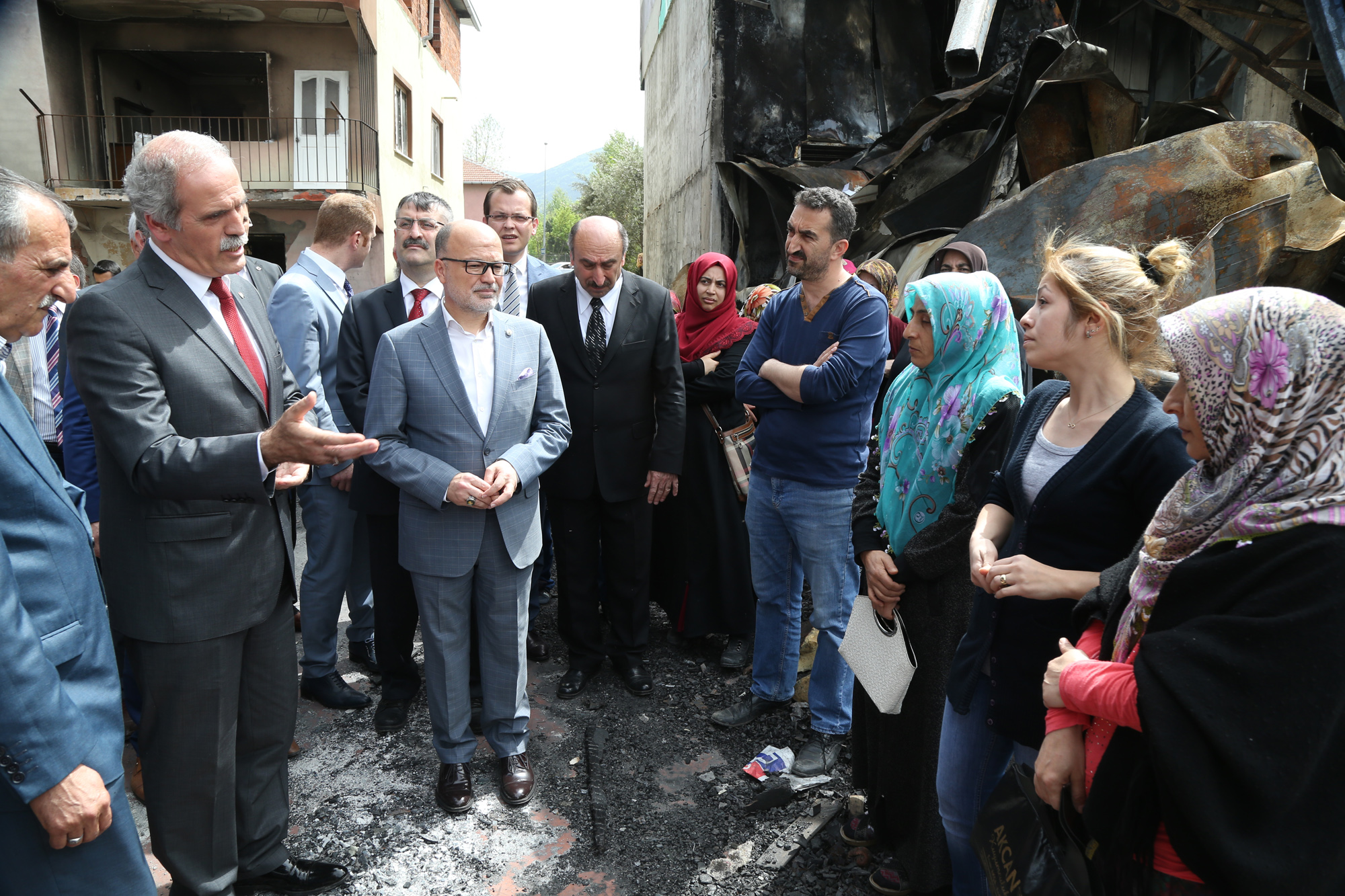 BURSA - Mehmet Akif Mahallesi’nde çıkan ve soğuk hava deposu ile çevresindeki evlere büyük zararlar veren yangının yaralarının sarılması için Büyükşehir Belediyesi devreye girdi. yangında zarar gören vatandaşları dinleyen Büyükşehir Belediye Başkanı Recep Altepe, evlerin onarımından eşya desteğine ve bölgenin modern bir görünüm kazanmasını sağlayacak çevre düzenlemesine kadar her türlü çalışmayı yapacaklarını söyledi.