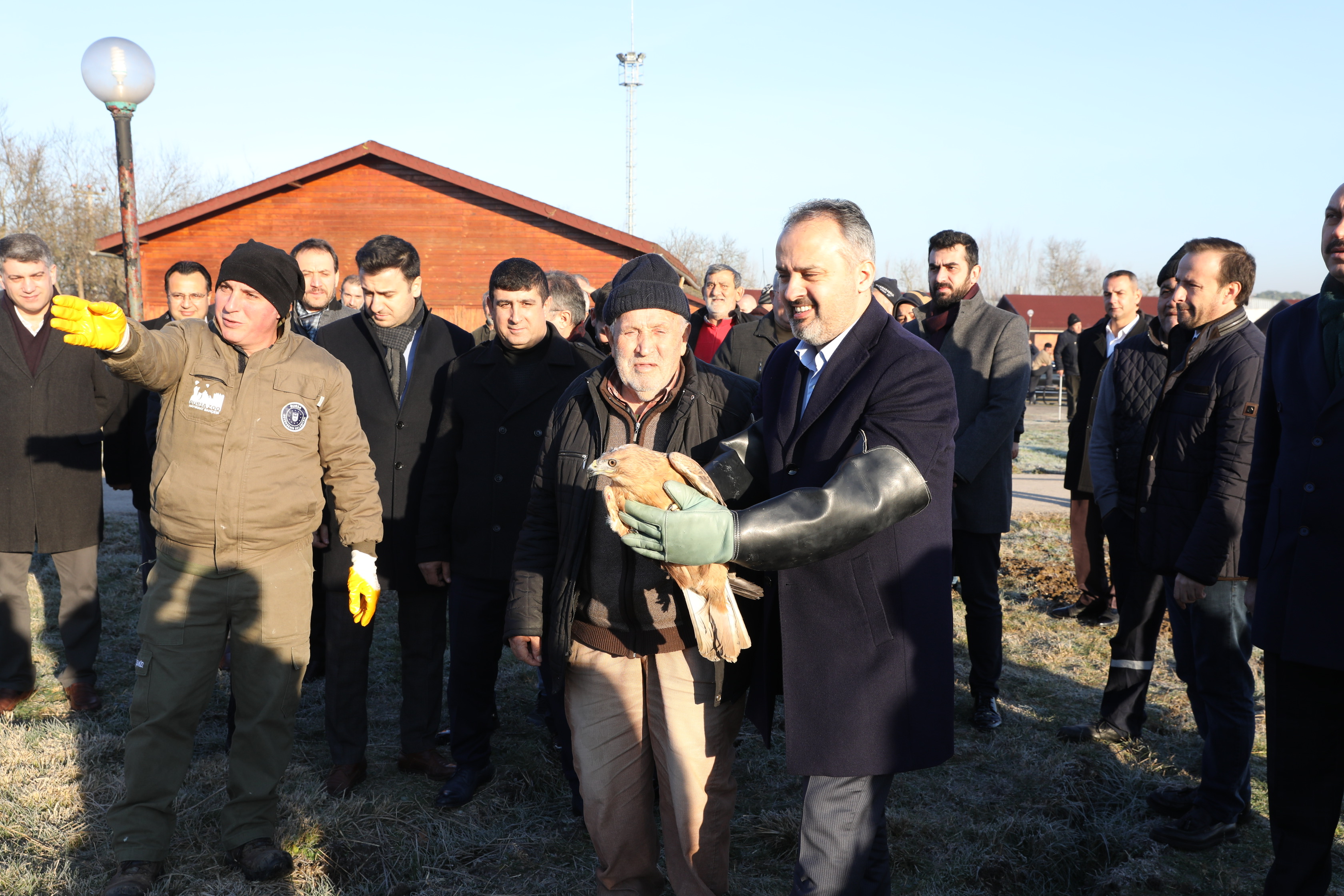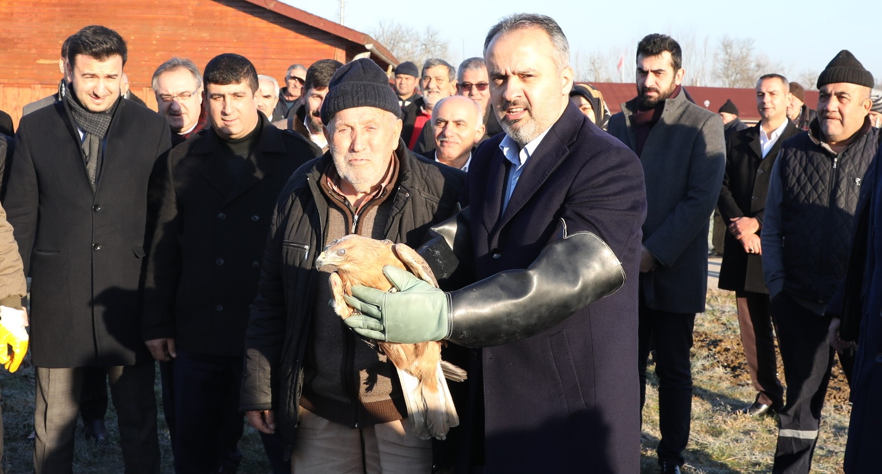 Ürünlü’deki erkek barınma evi ziyareti sırasında, barınma evinin en yaşlı sakini olan 91 yaşındaki Akif Vatan’ı da yanına alan Büyükşehir Belediye Başkanı Alinur Aktaş, kızıl şahini uçurmadan önce eline koruyucu eldivenleri giydi. Bursa’da her alanda ve her canlıya hizmet ettiklerini hatırlatan Başkan Aktaş, “Bu manada Hayvanat Bahçemiz marifetiyle yaralanan, hastalanan hayvanların tedavilerini de gerçekleştiriyoruz. 2019 yılı içerisinde tam 872 tane farklı türden hayvanın tedavisini ve bakımını yapıp tekrar doğal ortama bıraktık. Eylül ayında yaralı bir şekilde bulunan kızıl şahinin de tedavileri yapıldı. Şimdi onu dualarla tekrar doğal ortamına salıyoruz” dedi. Başkan Aktaş, yanındaki barınma evi sakini Akif Vatan’dan kızıl şahine bir isim vermesini istedi. Akif dede de kendi soyadı Vatan’ı kızıl şahine verdi ve ‘şahin vatan’ Başkan Aktaş’ın ellerinden özgürlüğüne uçtu.