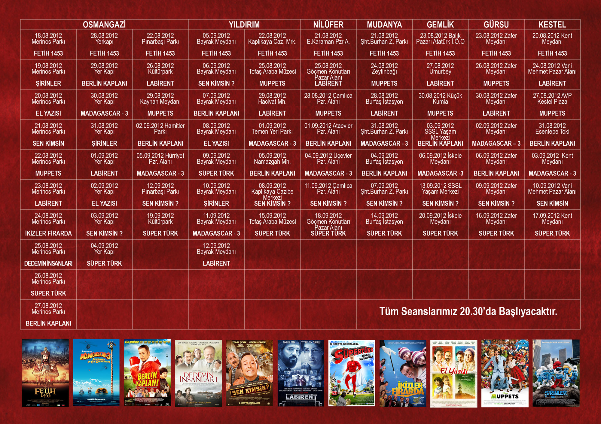 - AÇIKHAVADA SİNEMANIN NOSTALJİK KEYFİNİ YAŞATAN ‘YAZLIK SİNEMA KUMPANYASI’, 18 AĞUSTOS CUMARTESİ GÜNÜ (BUGÜN) SAAT 21.00’DA MERİNOS PARKI’NDA ‘FETİH 1453’ FİLMİNİN GÖSTERİMİYLE BAŞLAYACAK.