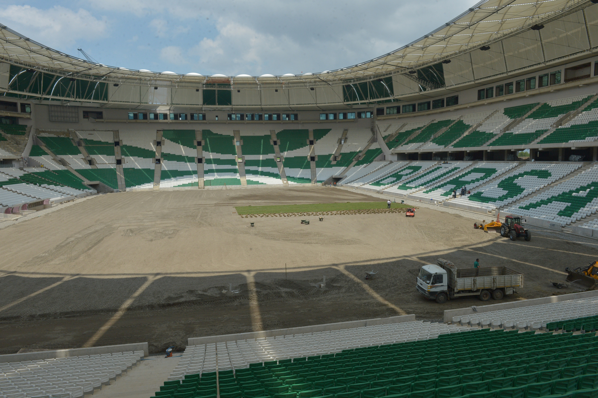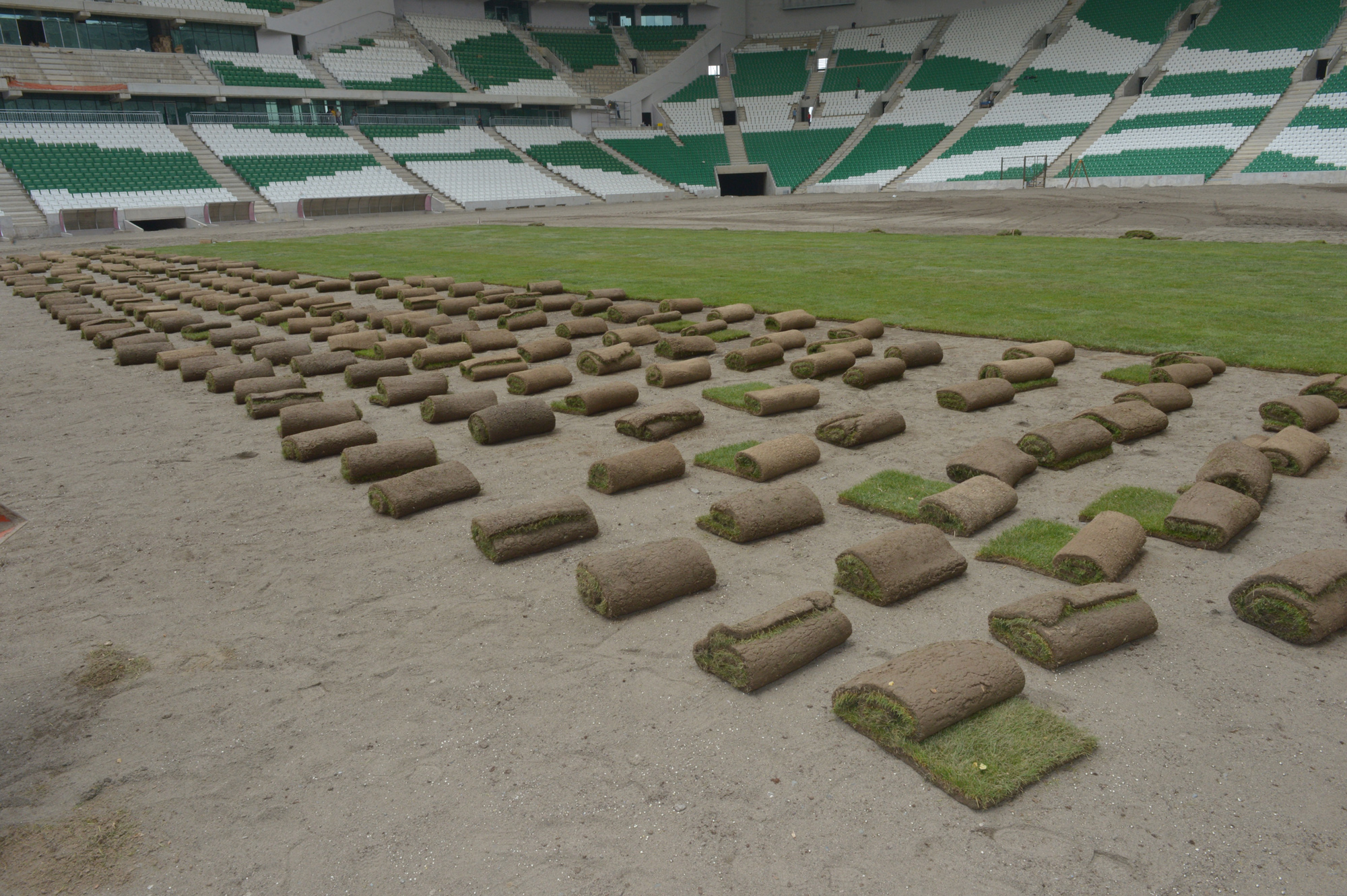 Yeni stadyumun çimlerinin Atatürk Stadyumu’nun çimlerini hazırlayan ekip tarafından hazırlandığını anlatan Başkan Altepe, “Mevcut Atatürk Stadyumu’ndaki çimler ve altyapı, Türkiye’ye örnek olmuştu. Kaliteli maç yapılabilmesi için, yoğun yağışta dahi su tutmayan zemin ve kaliteli çim olması gerekiyor. Her türlü hava şartına uygun çimlerin olması gerekiyor. Çimler daha önce ekildi ve düzenlendi. Uygun ölçüsüne getirildi. Stadyuma serilmeye de başlanıyor. Stadyumda artık saha da yeşillenecek. Bir hafta içinde zemin yeşille kaplanacak” şeklinde konuştu.