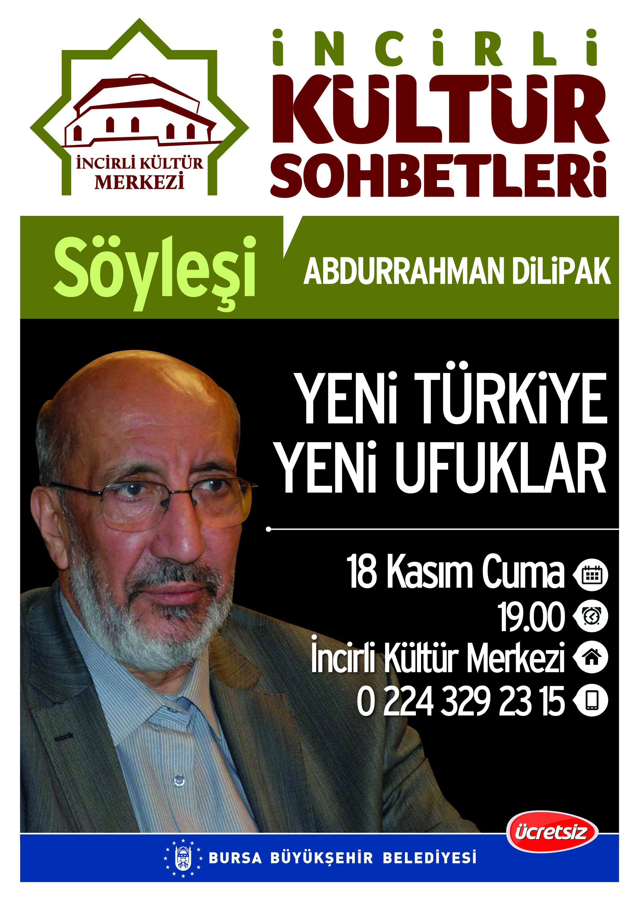 BURSA – İncirli Kültür Merkezi, Abdurrahman Dilipak’ın ‘Yeni Ufuklar Yeni Türkiye’ adlı söyleşisine ev sahipliği yapıyor.