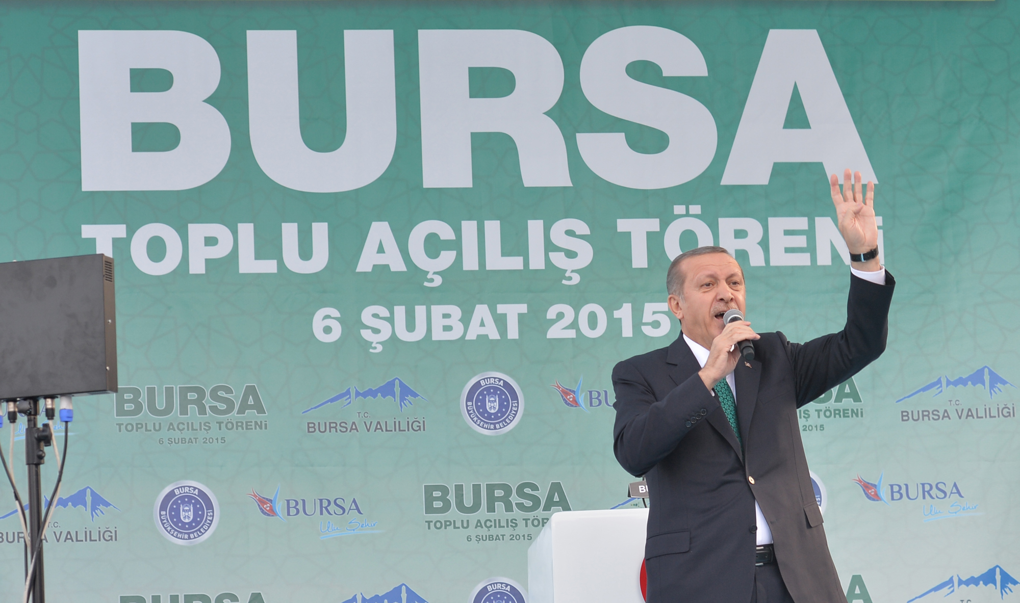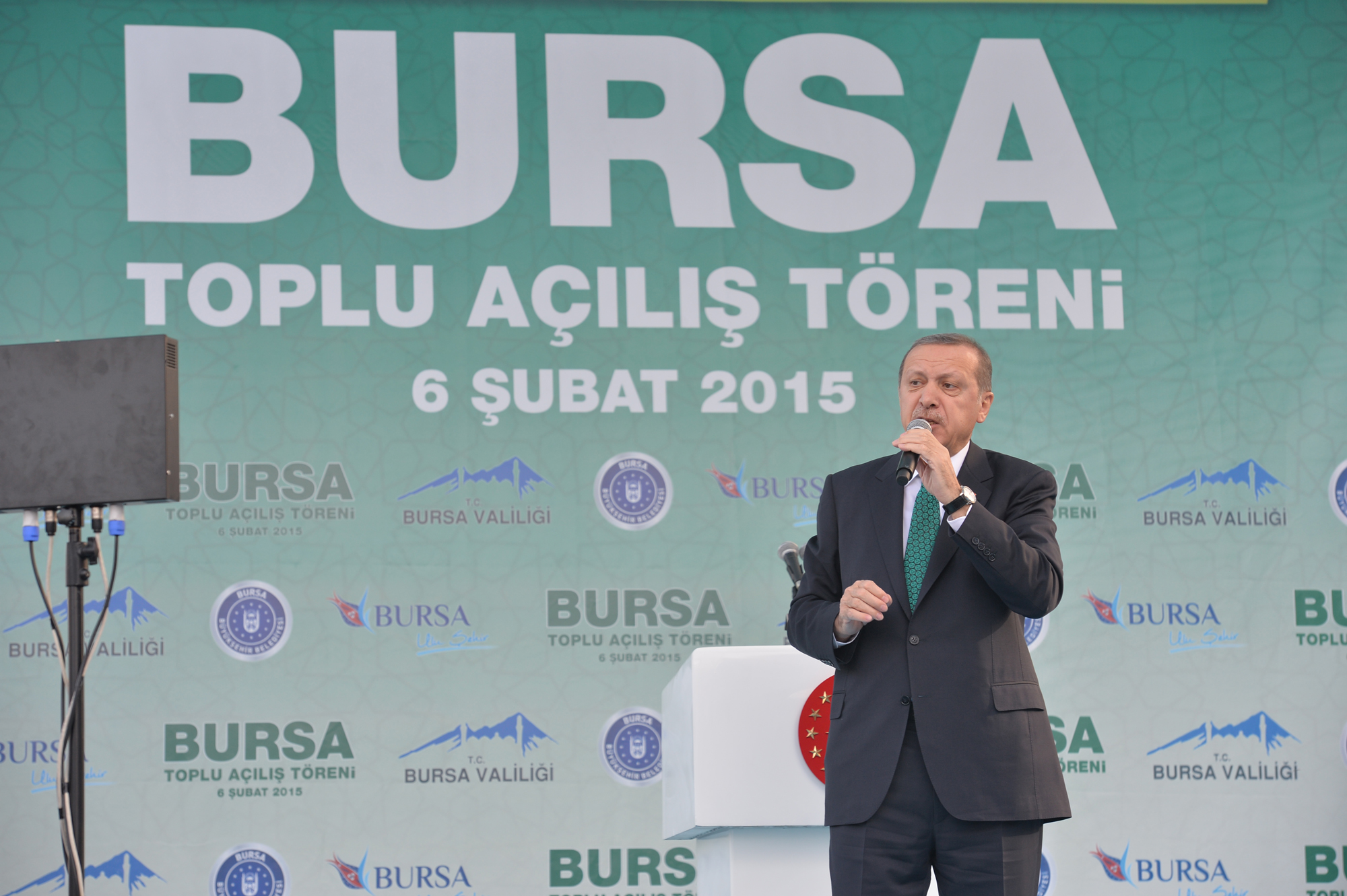 Açılışını yaptığı toplam yatırım tutarının 368 milyon TL olduğu 58 kalem eserin Bursa’ya hayırlı olmasını dileyen Erdoğan, “Bu hizmetleri Bursa’ya kazandıran kurumlarımızın yöneticilerini, emeği geçenleri tebrik ediyor, şükranlarımı sunuyorum. Bursa’nın önünde yeni dönem açacak olan ve hızla devam eden projelerimiz var. İstanbul, Ankara, İzmir’i bağlayacak yüksek hızlı tren hattının inşaatı süratle devam ediyor. Gezbe - Orhangazi - İzmir otoyolunun önemli parçası İzmit körfez geçişi köprüsü sürüyor, kuleler dikildi. Denizin yüzeyinden yukarı 252 metre kule. Denizin altında da 60 metreyi aşkın çalışma var. Bunlar daha önce hayal bile edilemiyordu şimdi hayata geçiyor. İnandık, azmettik. Dedik ki ‘bu millet bunları yapmaya muktedirdir. Bizim ecdadımız Fatih Sultan Mehmet karadan gemileri yürüttüyse onun torunları olarak denizin altından Marmaray yaparız dedik, yaptık. Denizin üstünde Yavuz Sultan Selim köprüsünde tabliyeler konmaya başladı. İstanbul’dan çıkıp Bursa üzerinden İzmir’e gidiş bizim için bir zor olmayacak. Zoru kolay kıldık. Şehir Hastanesi çalışmaları devam ediyor. Devam eden yatırımlarımız Bursa’nın çehresini değiştirecek, Bursa’yı geleceğe taşıyacak. Hepsini de adım adım takip ediyoruz. Bursa şehir stadı yapılıyor, modern bir stat. Bursaspor da maşallah iyi gidiyor. Her halde eski başarıları zorlayacak. Öyle görünüyor. Bursaspor’a başarılar diliyoruz” dedi.