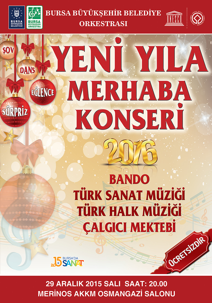BURSA – Bursa Büyükşehir Belediyesi Orkestra Şube Müdürlüğü, ‘Yeni Yıla Merhaba’ konserini 29 Aralık Salı günü saat 20.00’da Atatürk Kongre Kültür Merkezi (Merinos AKKM) Osmangazi Salonu’nda gerçekleştirilecektir.