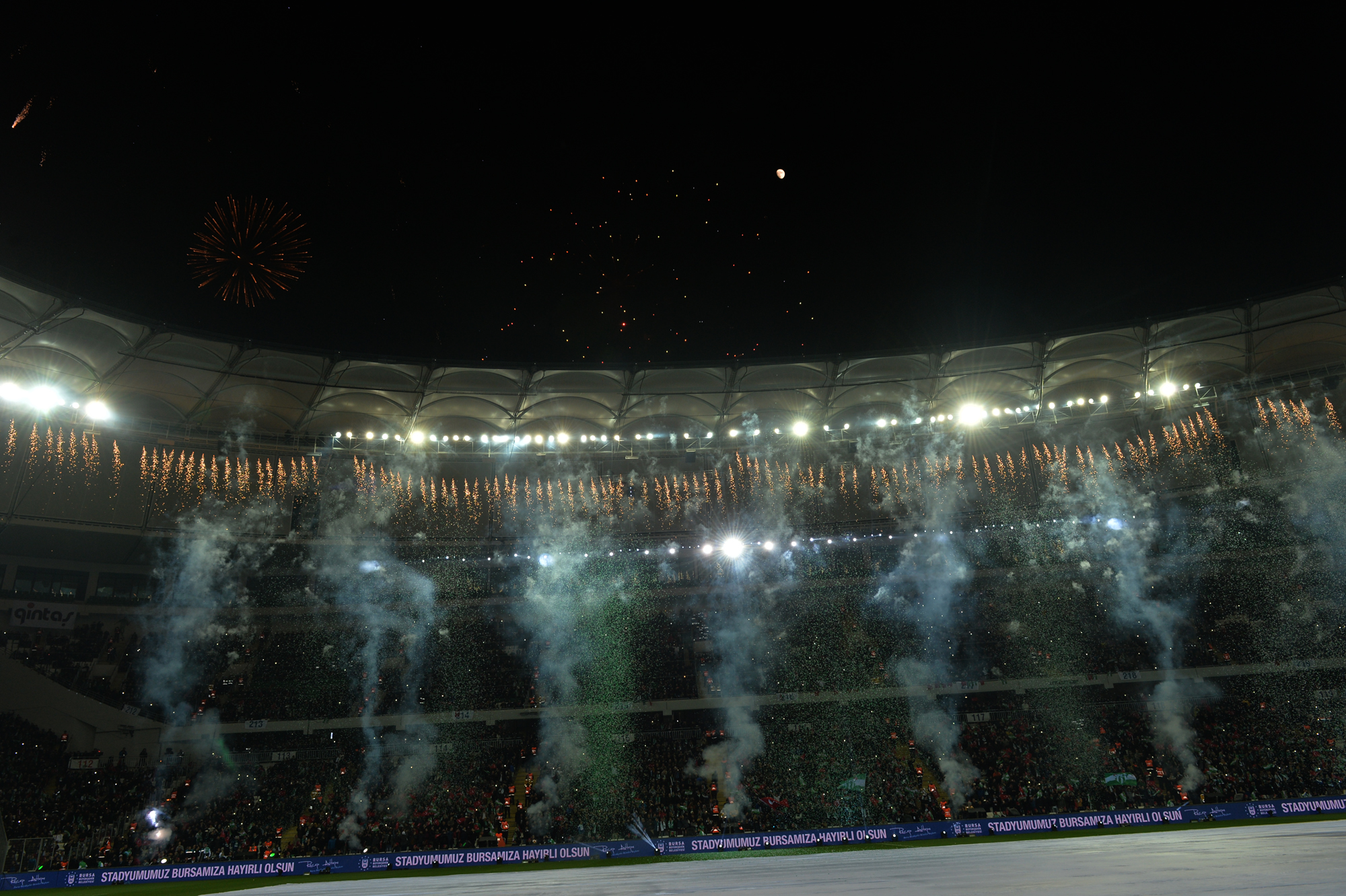 Bursa Büyükşehir Belediyesi tarafından temeli 2011 yılının Haziran ayında atılan, 400 bin metrekare proje alanı ve 190 bin metrekarelik inşaat alanıyla Bursa’nın en büyük anıtsal yapılarından biri olan Bursa Büyükşehir Stadyumu şölen gibi bir törenle açıldı. Bursalıların yoğun ilgi gösterdiği açılış törenine Fettah Can konseri ve bando gösterisinin ardından Cumhurbaşkanı Recep Tayyip Erdoğan, İçişleri Bakanı Efkan Ala, Sağlık Bakanı Mehmet Müezzinoğlu, Gençlik ve Spor Bakanı Akif Çağatay Kılıç, Bursa Valisi Münir Karaloğlu, Büyükşehir Belediye Başkanı Recep Altepe, Türkiye Futbol Federasyonu Başkanı Yıldırım Demirören, Bursaspor Kulüp Başkanı Recep Bölükbaşı, Bursa Milletvekilleri, ilçe belediye başkanları da katıldı. Tören, Bursaspor Teknik Direktörü Hamza Hamzaoğlu ve futbolcuların sloganlar eşliğinde saha çıkması ve istiklal marşının okunması ile başladı.