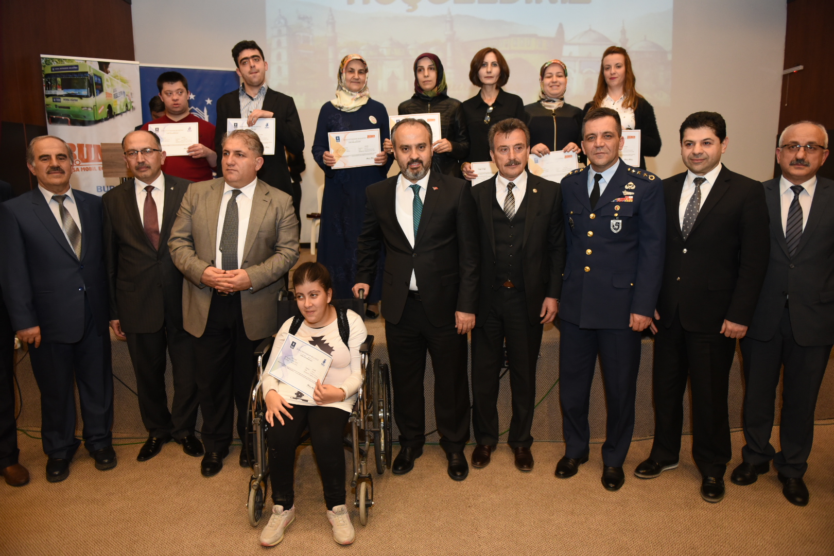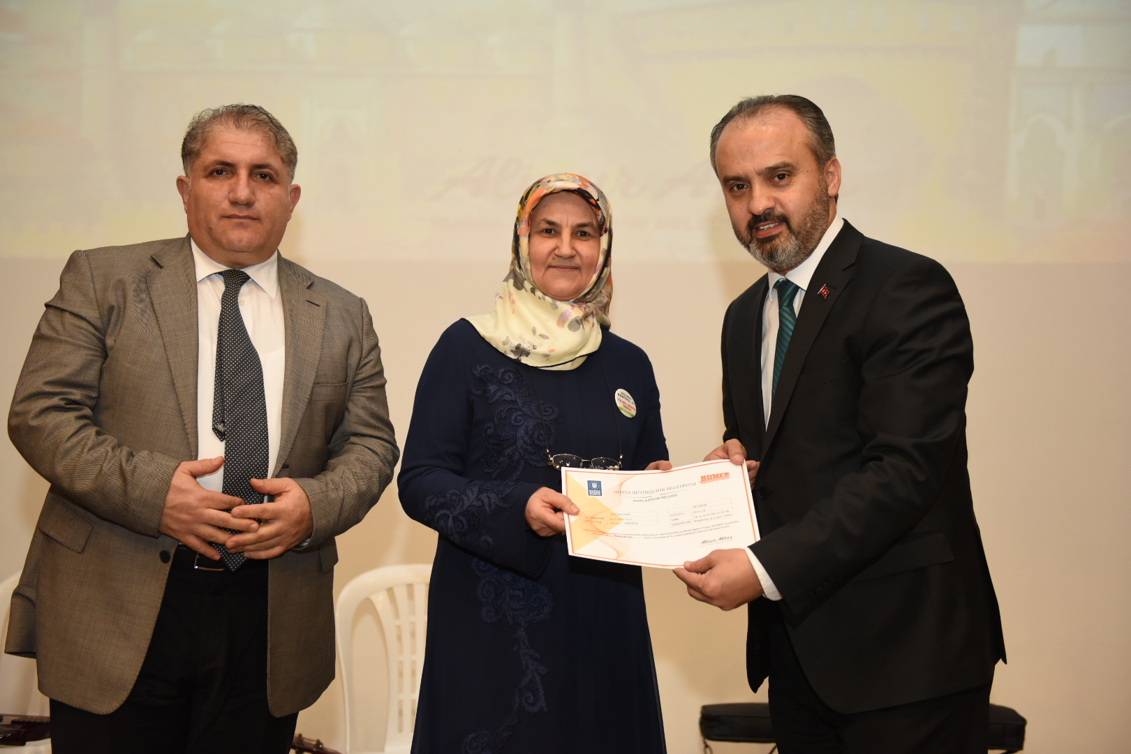 Başkan Alinur Aktaş, muhtarlarla toplantısının ardından Büyükşehir Belediyesi tarafından Yenişehir’de gerçekleştirilen Bursa Mobil Eğitim Projesi (BUMEP) ile Bursa Engelsiz Mobil Eğitim Projesi (BENMEP) kapsamında eğitimlerini tamamlayan 421 kursiyere sertifikalarını verdi.