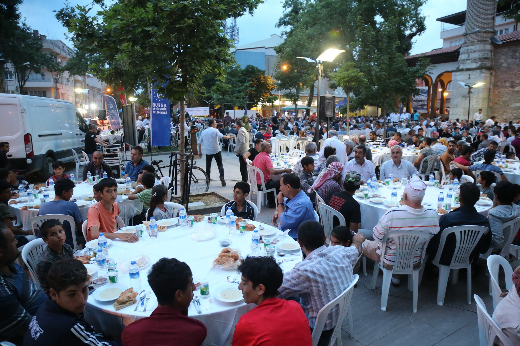 Bursa Büyükşehir Belediyesi, yaptığı organizasyonlarla, 17 ilçe ile 7 farklı ülkede 11 ayın sultanı ramazanı ‘ruhaniyetine uygun şekilde’ yaşatmaya devam ediyor. Bir yandan Bursa’nın tüm ilçelerinde kurduğu iftar sofralarıyla vatandaşları bir araya getiren Büyükşehir Belediyesi, diğer yandan başta Balkan ve Kafkas ülkeleri olmak üzere dünyanın değişik coğrafyalarında benzer etkinliklerle Müslümanlar arasında birlik ve beraberliği sağlıyor. Ramazan ayının coşkusunu insanlara yaşatan, katılımcıların kalplerinde manevi hislerin oluşmasına neden olan etkinliklerden biri de Bursa’nın tarım deposu Yenişehir’de yapıldı. Demokrasi Meydanı Çınarlı Camii önünde kurulan iftar sofraları, yüzlerce Yenişehirliyi bir araya getirdi. Büyükşehir Belediye Başkanı Alinur Aktaş ile Yenişehir Belediye Başkanı Süleyman Çelik’in de katıldığı organizasyonda, yaklaşık 3 bin kişi orucunu protokol üyeleriyle birlikte açtı.