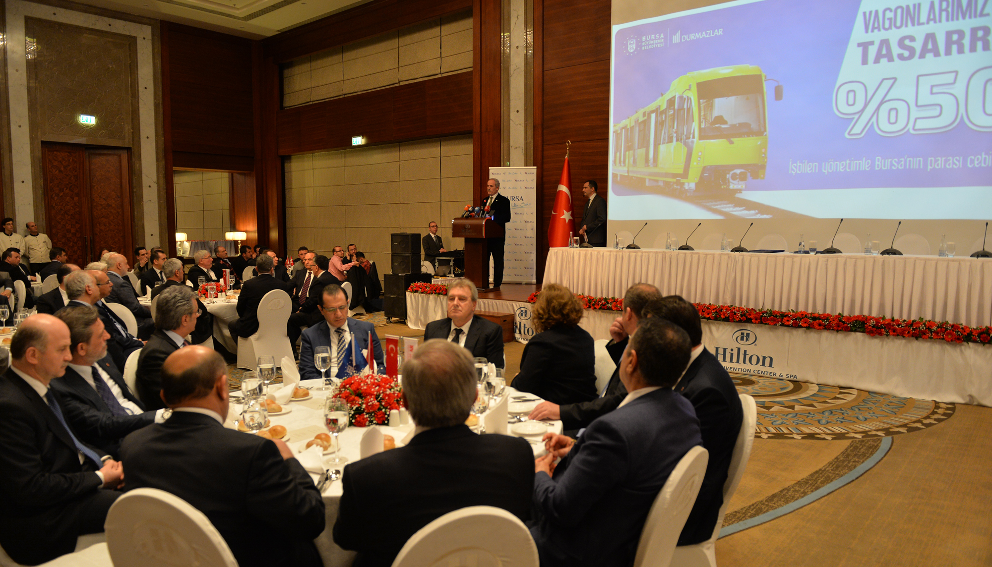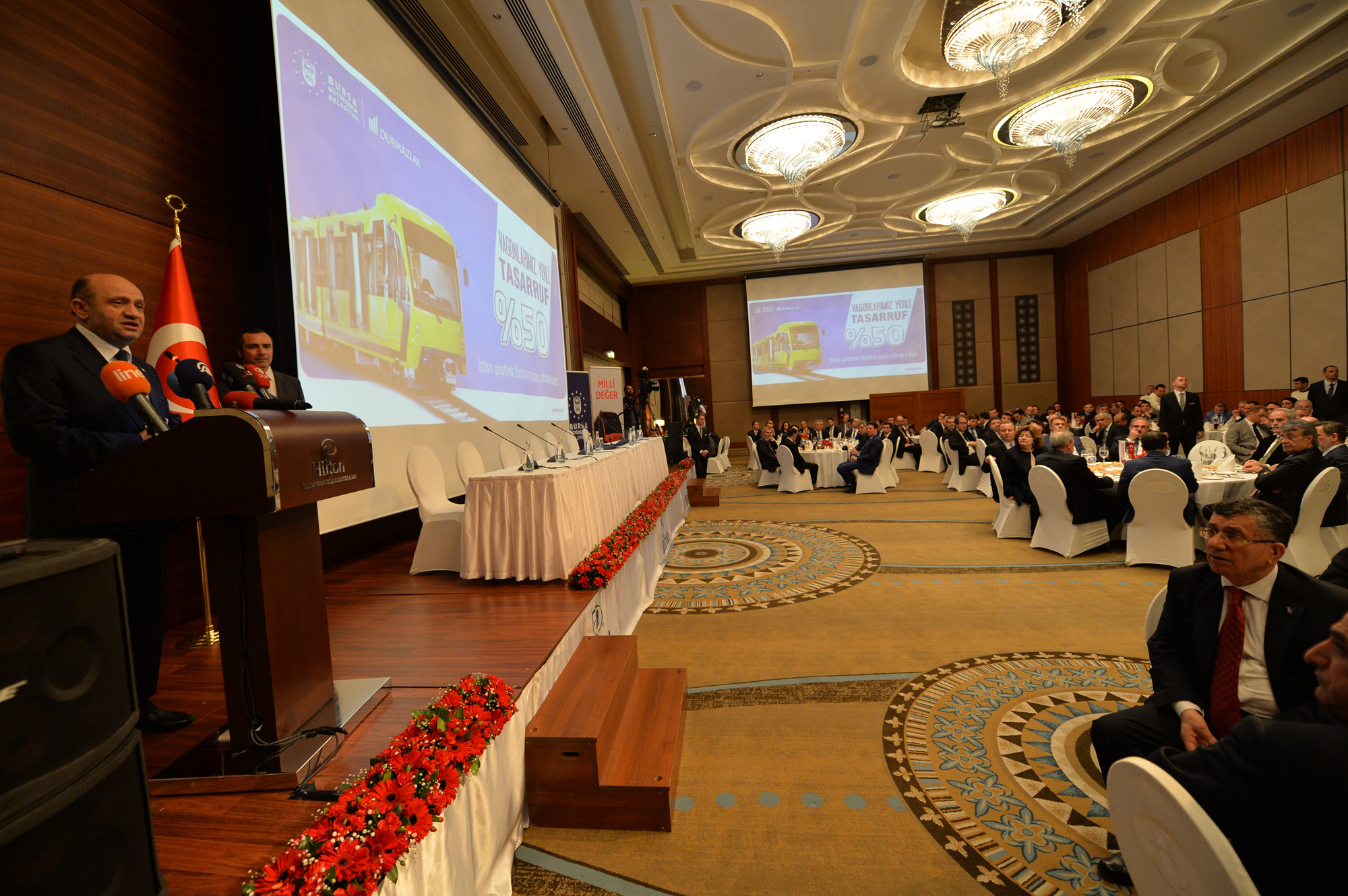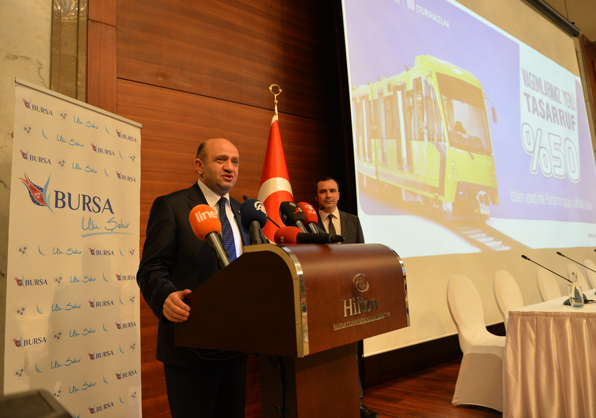 Durmazlar Makine Yönetim Kurulu Başkanı Hüseyin Durmaz da, konuşmasında, yerli araçların üretimine ilişkin bilgiler verdi. Bu yola 2008 yılında Büyükşehir Belediye Başkanı Recep Altepe’nin teşviki ve desteğiyle başladıklarını, kısa zaman sonra da sonuç aldıklarını ifade eden Durmaz, üretilen 6 aracın 1.5 yıldır Bursa yollarında hiçbir sorunla karşılaşmadan çalıştığını hatırlattı. Büyükşehir Belediyesi tarafından açılan tramvay ve vagon ihalesini kazanmaktan, bu alanad Bursa ve Türkiye ismini öne çıkarmaktan dolayı mutlu olduklarını açıklayan Durmaz, “İnsanın heyecanlanmaması mümkün değil. Hedefimiz, hem Türkiye’nin diğer şehirlerine bu araçları satmak hem de yurt dışına ihracat yapmak. Bombardier gibi firmaların yıllık ihracat oranı 5 milyar dolar. Eğer biz de bu seviyeye gelebilirsek, 10 yılda 50 milyar dolarlık müthiş potansiyel ortaya çıkacak. Milli markamızla, Türkiye’nin 2023 hedeflerine ufak da olsa katkı sağlamış olacağız” ifadelerini kullandı.