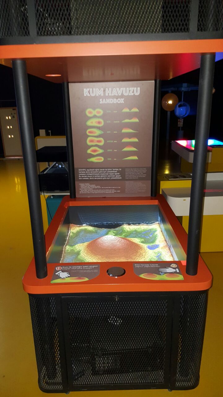 Deniz seviyesine göre aynı yükseltide bulunan noktaların birleştirilmesi ile oluşan çizgilerin kullanıldığı yöntem olan ve yüzey şekilleri hakkında bilgi veren eş yükselti anlamındaki izophips haritasının 3 boyutlu bir şekilde kum havuzuna yansıtıldığı düzenek, uygulamalı öğretim anlamında da son derece faydalı bir işlev görüyor. Ziyaretçiler, kum havuzunda elleriyle şekillendirdikleri kendi coğrafyalarını oluştururken yeryüzü şekillerine ilişkin bilgi sahibi oluyor. Bilim meraklıları, ayrıca, kum havuzunun üzerinde bulunan projektör sayesinde bir coğrafyada yer alan tepelerin, dağların, göl, ova ve deltaların izophis haritasında nasıl göründüğüne de şahit oluyor. 3 boyutlu düzenekle yeryüzüne kendi istediği şekli veren ziyaretçilerin sıklıkla deneyimlediği düzenek, coğrafya eğitiminde zorlanan öğrenciler için de önemli bir fırsat…