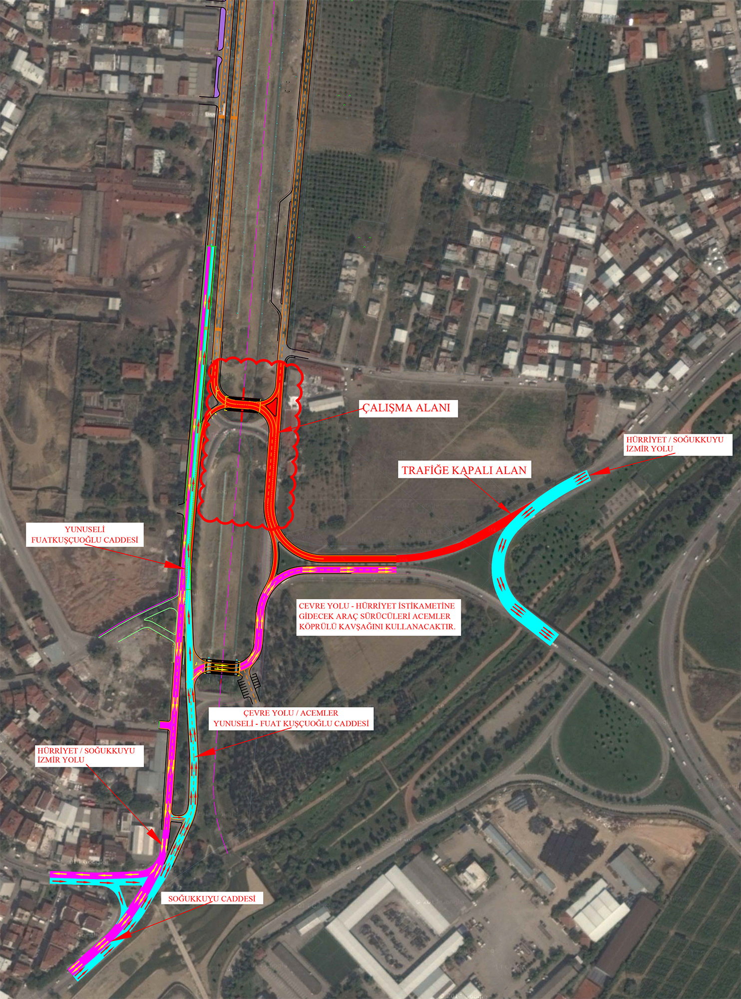 Çalışmalar kapsamında Yakın Çevre Yolu Avrupa Konseyi Bulvarından Yunuseli Fuat Kuşçuoğlu caddesine giriş kesimi 10 gün süreyle araç trafiğe kapatılacak. Yakın Çevre Yolundan Yunuseli ve Hürriyet mahallesine gidecek araç trafiği Acemler Kavşağına yönlendirilerek İzmir yolu Soğukkuyu Caddesi bağlantısını kullanarak Hürriyet ve Yunuseli Mahallesine erişim sağlanacak.