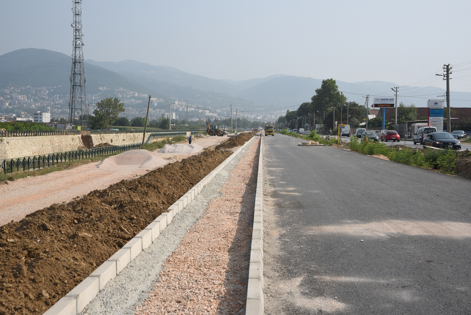 Bursa’yı ulaşılabilir bir kent haline getirmek amacıyla kent merkezinde yeni ana arter oluşturma çalışmalarından, ilçelerdeki arazi yollarına kadar her alanda önemli yatırımları hayata geçiren Büyükşehir Belediyesi, kent içi trafiğe nefes aldıracak önemli bir ulaşım projesini daha tamamlama aşamasına geldi. Yeni yerleşim bölgelerinden biri olması nedeniyle trafik yününün her geçen gün arttığı Yunuseli’de, Yunuseli kanalı yanındaki mevcut yolun ihtiyacı karşılamaması üzerine kanalın her iki yanına yeni yol kazandırılıyor. Dere kenarındaki yükselti, yol seviyesine indirilirken, asfaltlama çalışmalarına başlandı. Çalışmaların tamamlanmasıyla birlikte Yunuseli’ye geliş gidiş çift şeritli yol kazandırılırken, derenin doğu tarafına da çift şeritli bir yol kazandırılmış olacak.