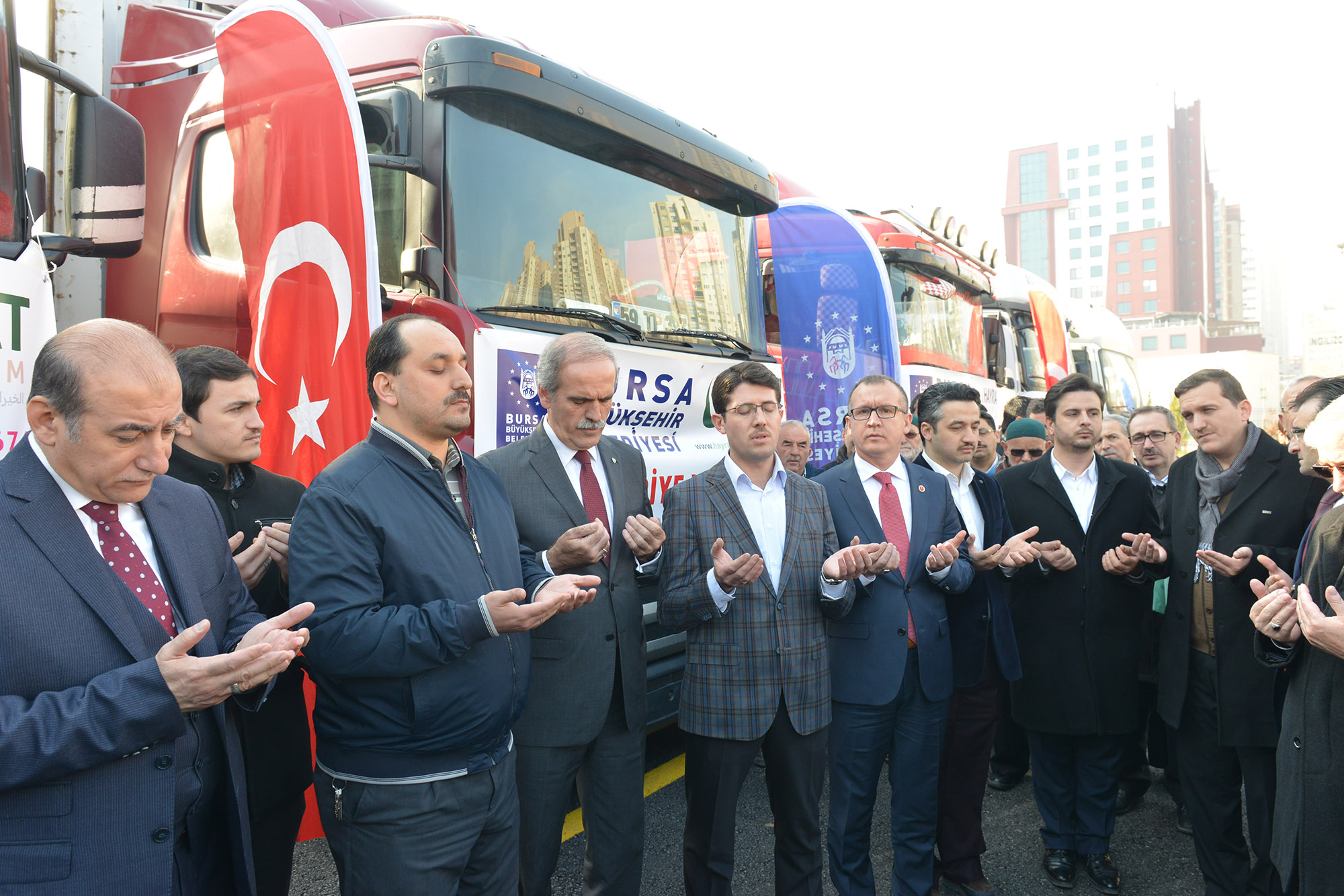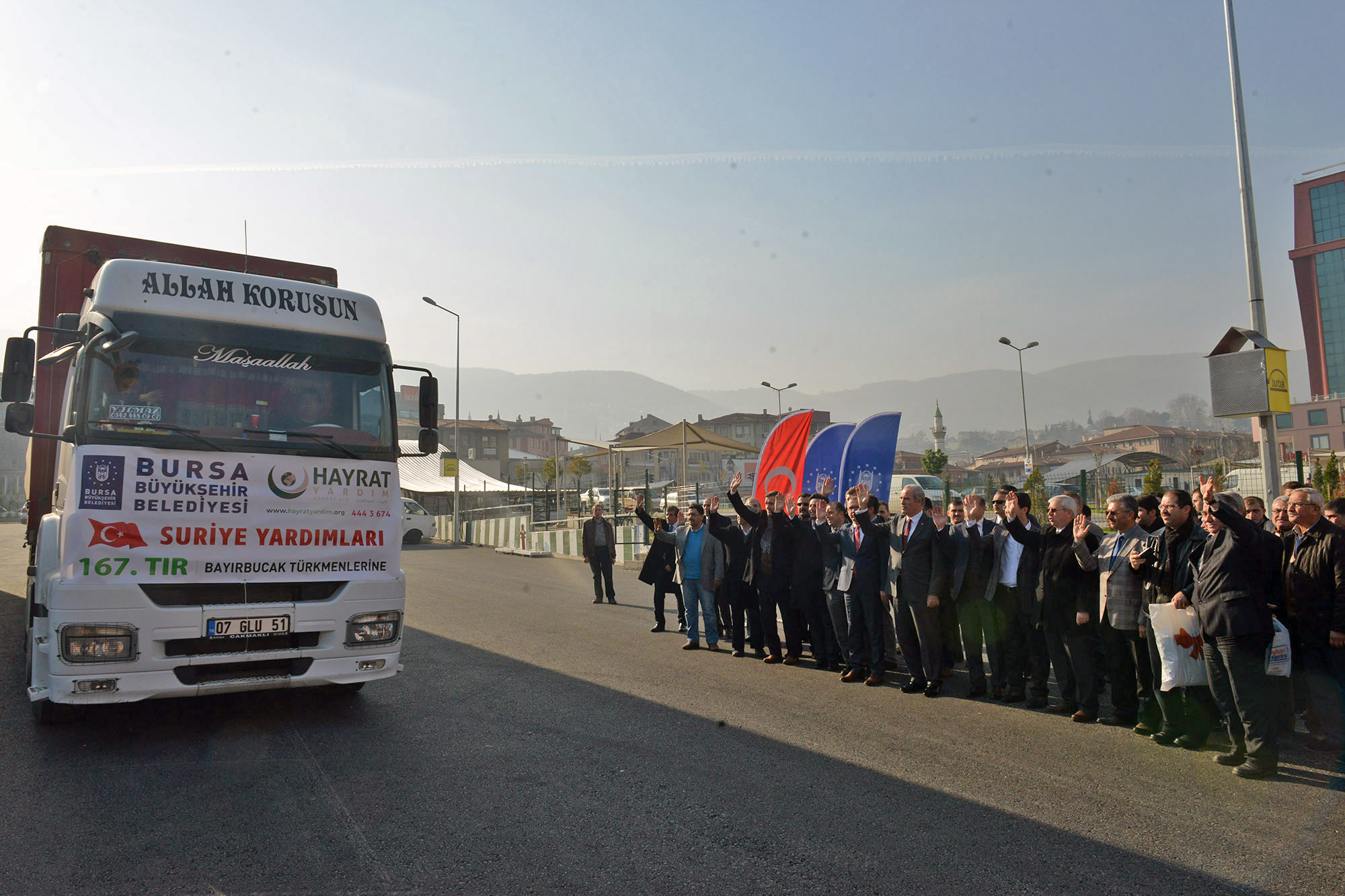 Suriyeli mazlumlara destek olmak amacıyla savaşın ilk günlerinden itibaren Bursa’da başlatılan yardım seferberliği, Büyükşehir Belediyesi’nin de destekleriyle çığ gibi büyüyor. Büyükşehir Belediyesi, işadamları, sivil toplum örgütleri ve vatandaşlardan sağlanan yardımlarla doldurulan 200’ü aşkın TIR, bölge halkının yaralarını sararken, son iki hafta içinde yapılan 7 Tır yardımın ardından bugün de içinde gıda, giyecek, yakacak ve yatak bulunan 6 Tır yardım malzemesi Bayırbucak Türkmenlerine ulaştırılmak üzere yola çıktı. Hayrat İnsani Yardım Derneği tarafından organize edilen ve yardımseverlerin de katkılarıyla toplanan yardımlarla doldurulan Tırlar Büyükşehir Belediyesi’nin Doğanbey Otoparkı’nda düzenlenen törenle bölgeye uğurlandı.