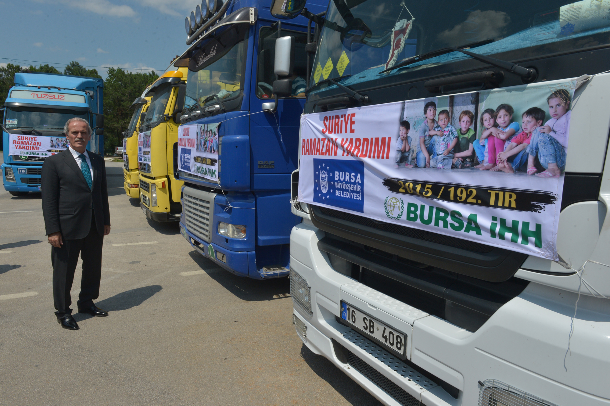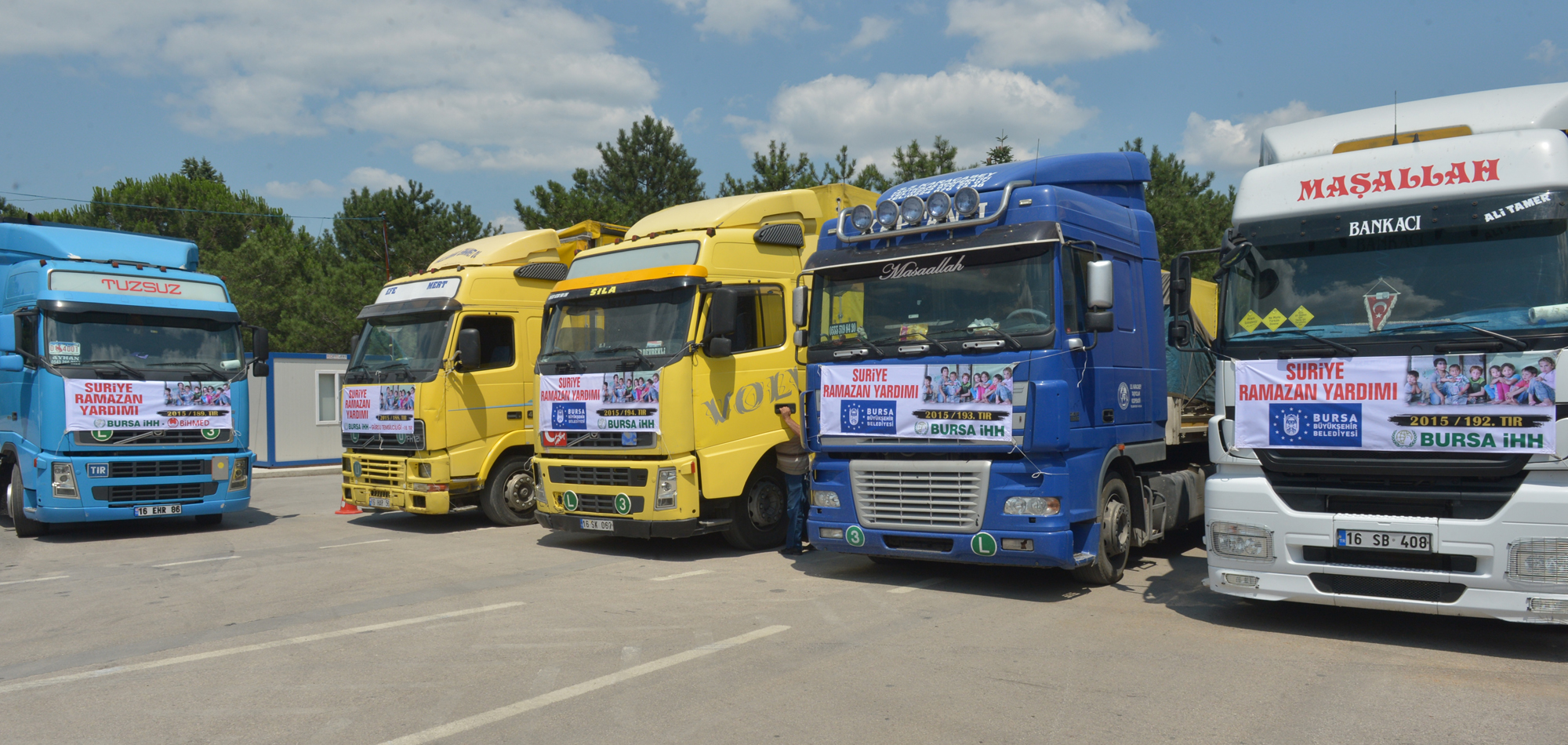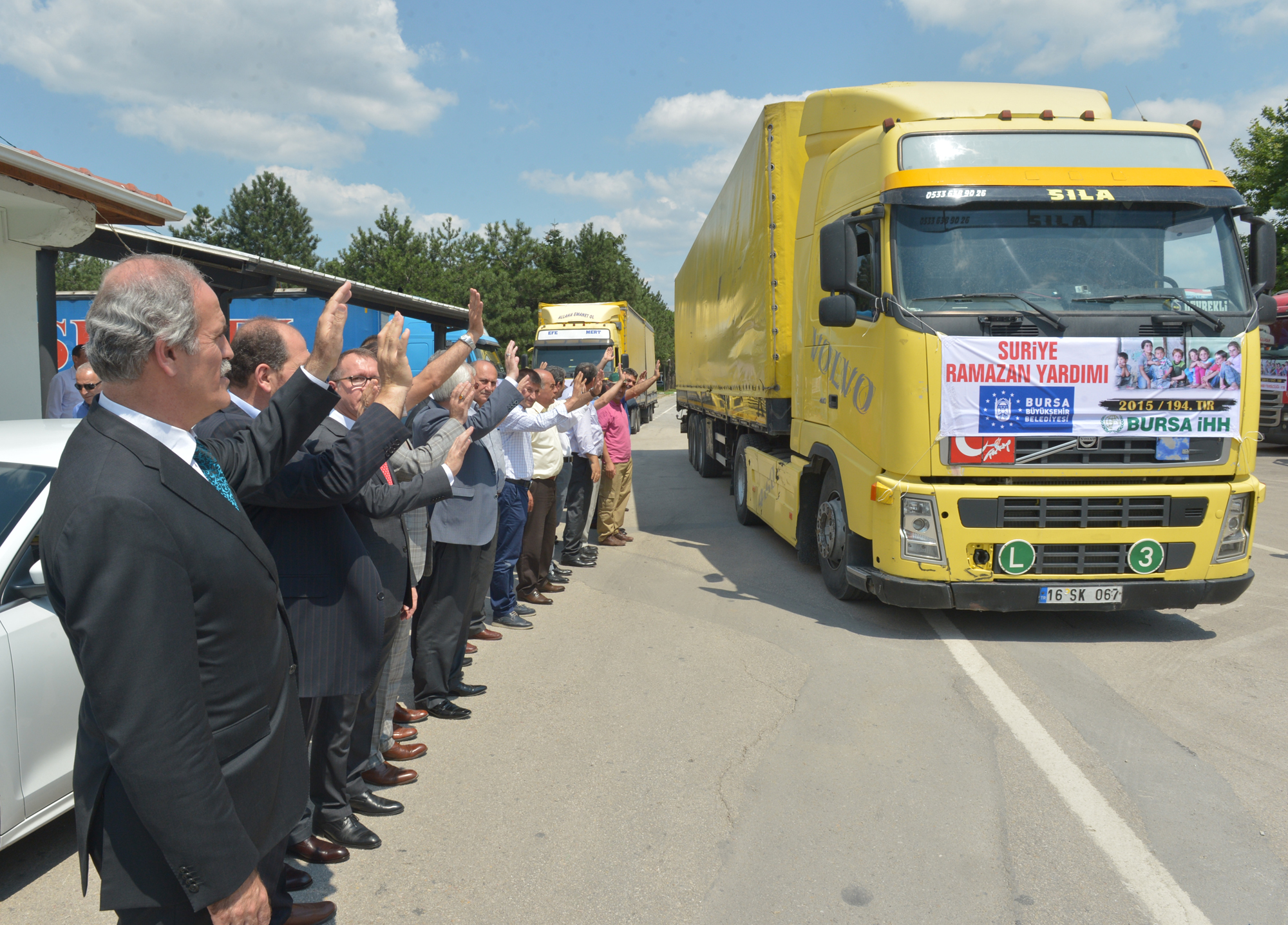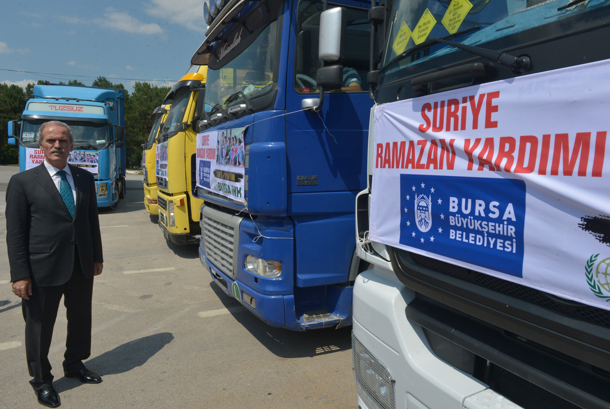 Suriye’de iç savaşın başladığı ilk günden buyana yardımseverliğini en iyi şekilde gösteren Bursa, yardımlaşma ve paylaşmanın öne çıktığı Ramazan ayında da Suriye konusundaki duyarlılığını en iyi şekilde gösterdi. Bursa Büyükşehir Belediyesi, İnsan Hak ve Hürriyetleri İnsani Yardım Vakfı, MÜSİAD, BİHMED ve hayırseverlerin katkılarıyla ağırlığı gıda maddelerinin oluşturduğu 13 TIR yardım malzemesi toplandı. Toplanan yardımlar Büyükşehir Belediyesi’nin Arabayatağı’ndaki yerleşkesinde düzenlenen törenin ardından ihtiyaç sahiplerine ulaştırılmak üzere Suriye’ye yolcu edildi.
