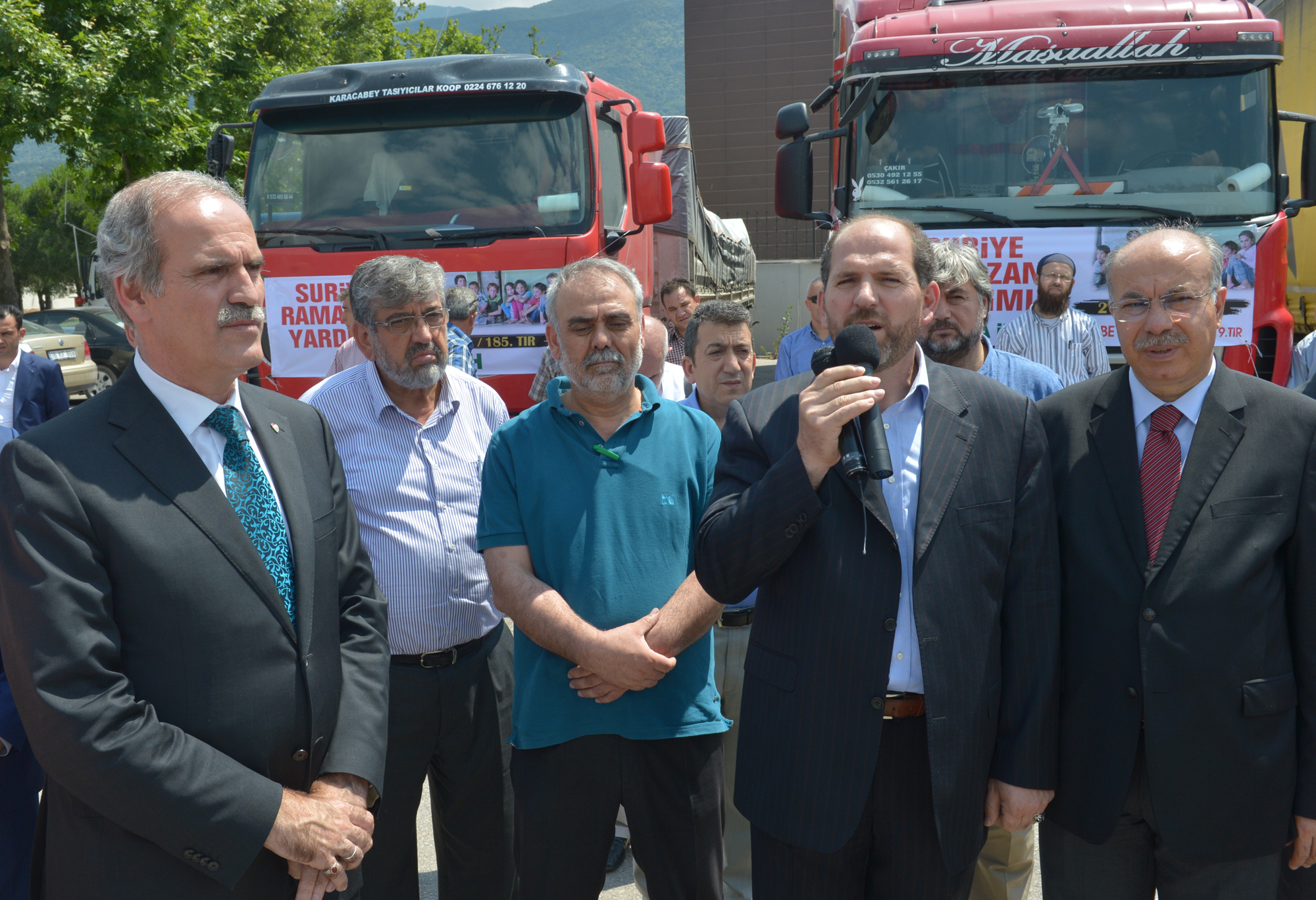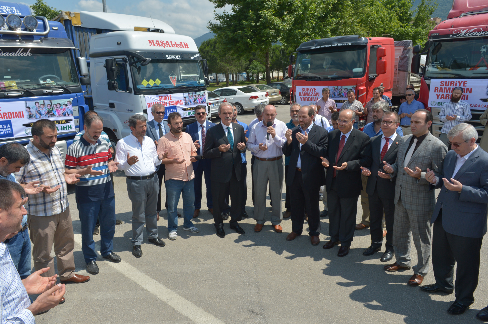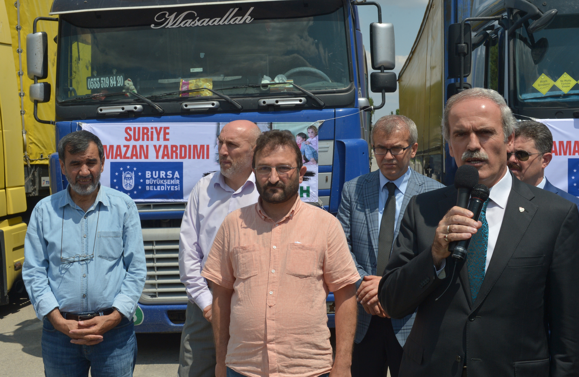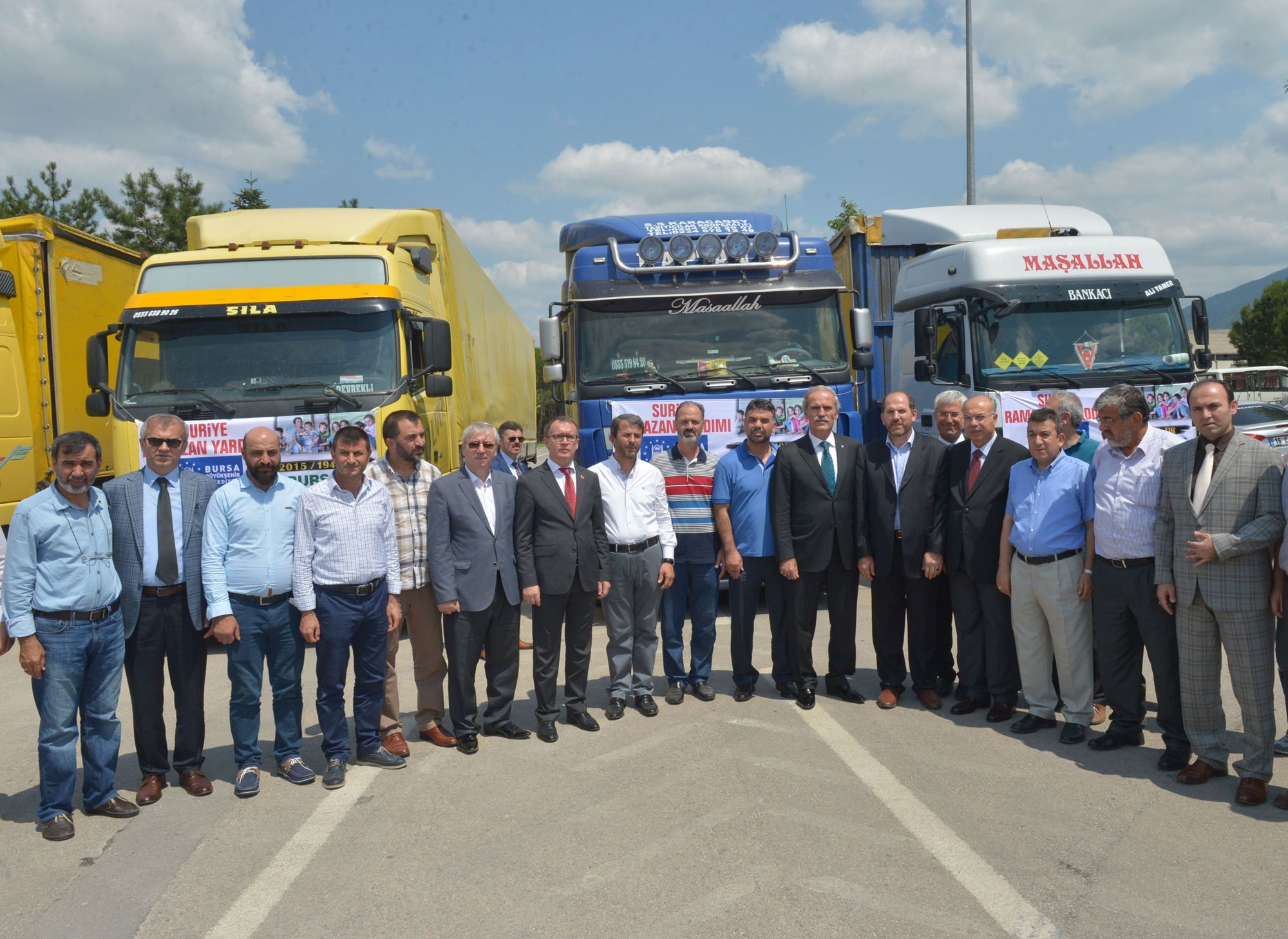 Suriye’de iç savaşın başladığı ilk günden buyana yardımseverliğini en iyi şekilde gösteren Bursa, yardımlaşma ve paylaşmanın öne çıktığı Ramazan ayında da Suriye konusundaki duyarlılığını en iyi şekilde gösterdi. Bursa Büyükşehir Belediyesi, İnsan Hak ve Hürriyetleri İnsani Yardım Vakfı, MÜSİAD, BİHMED ve hayırseverlerin katkılarıyla ağırlığı gıda maddelerinin oluşturduğu 13 TIR yardım malzemesi toplandı. Toplanan yardımlar Büyükşehir Belediyesi’nin Arabayatağı’ndaki yerleşkesinde düzenlenen törenin ardından ihtiyaç sahiplerine ulaştırılmak üzere Suriye’ye yolcu edildi.