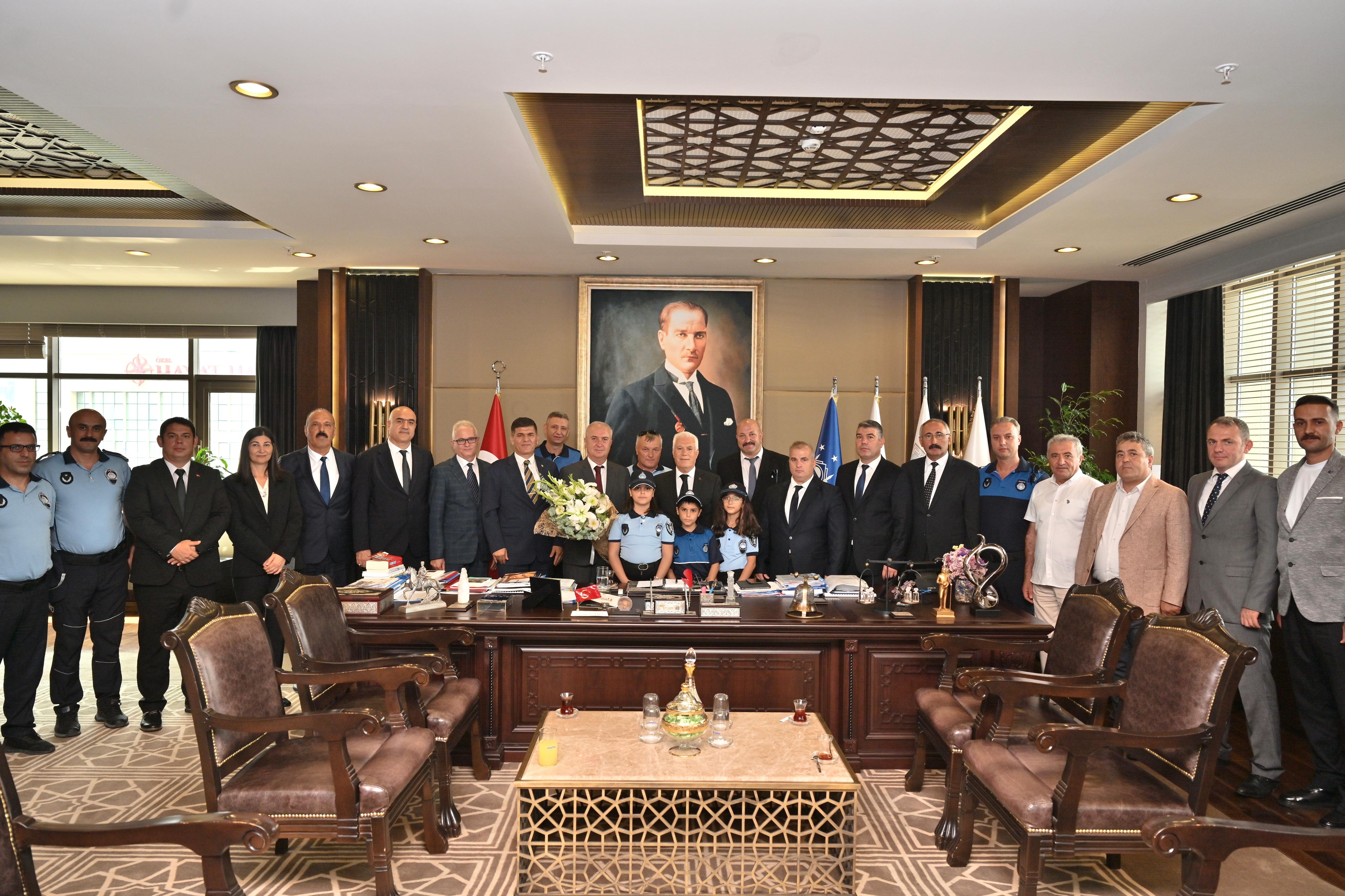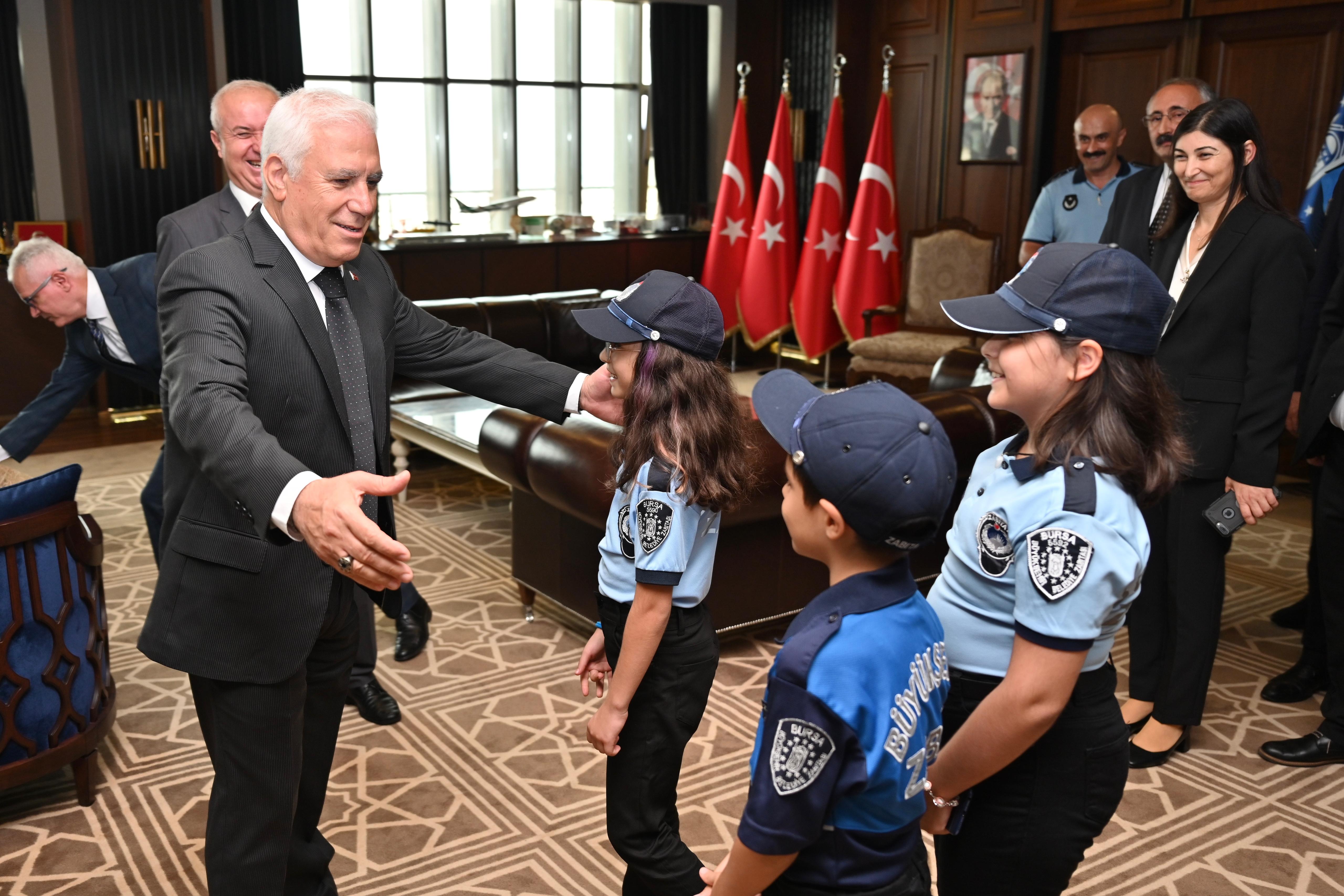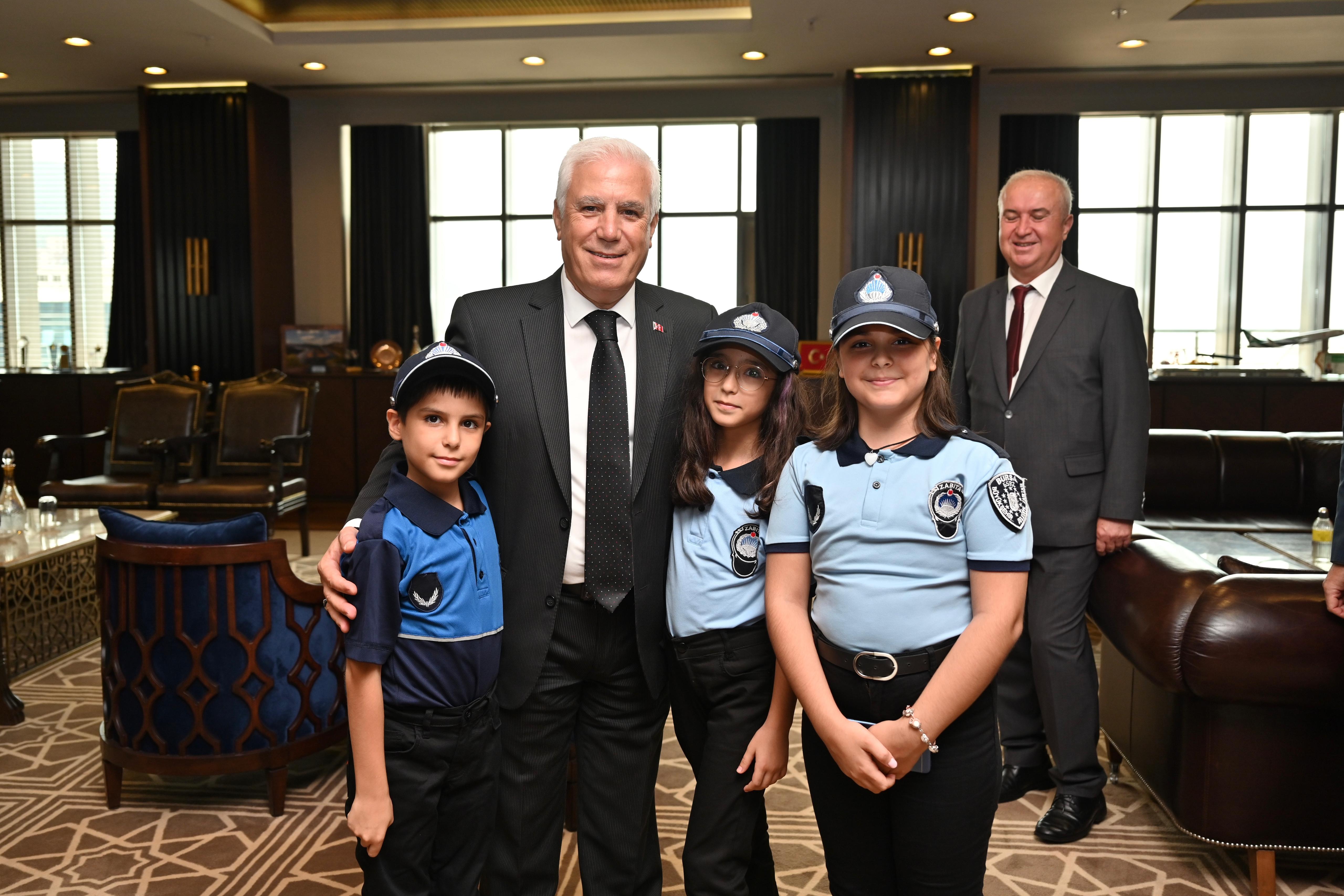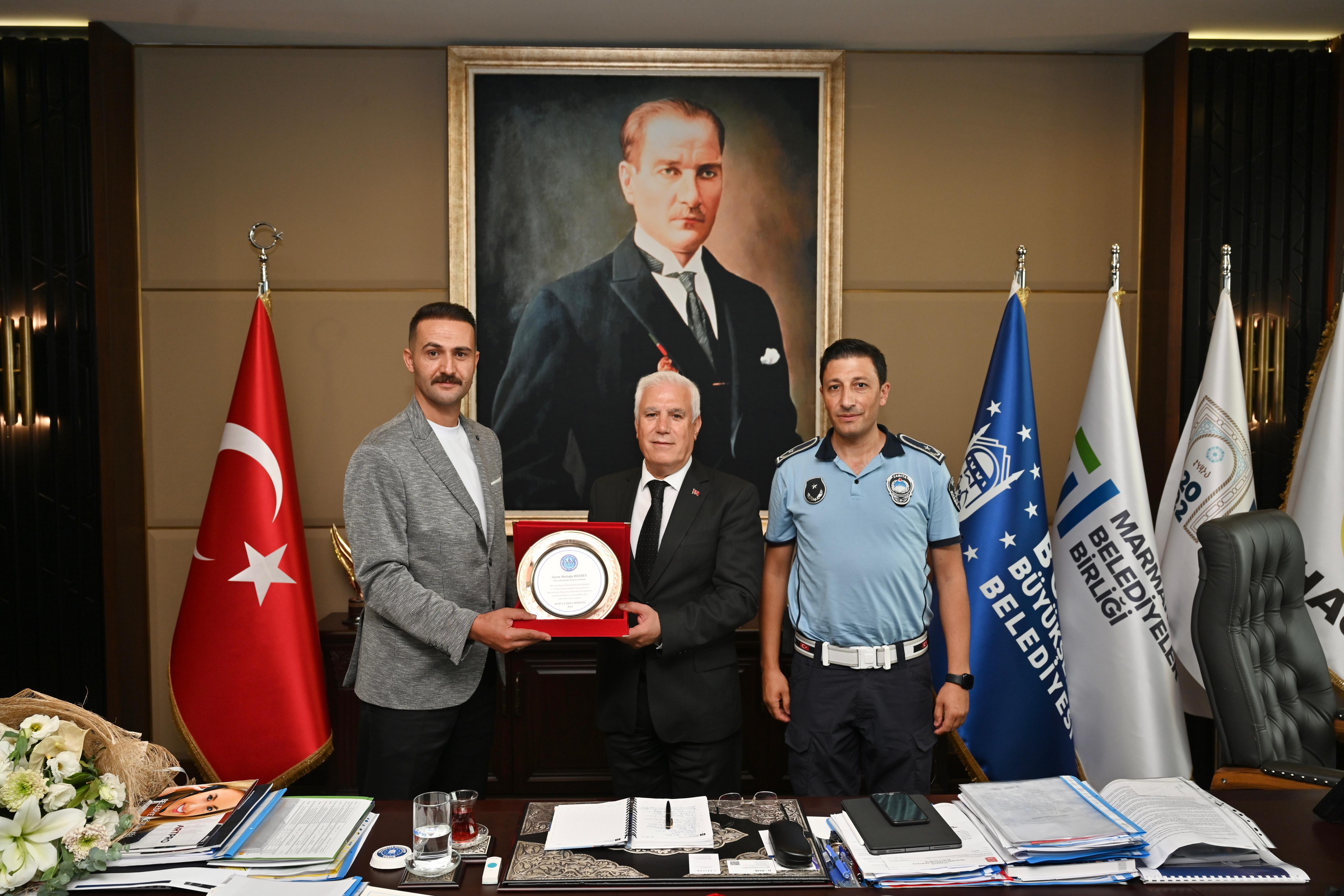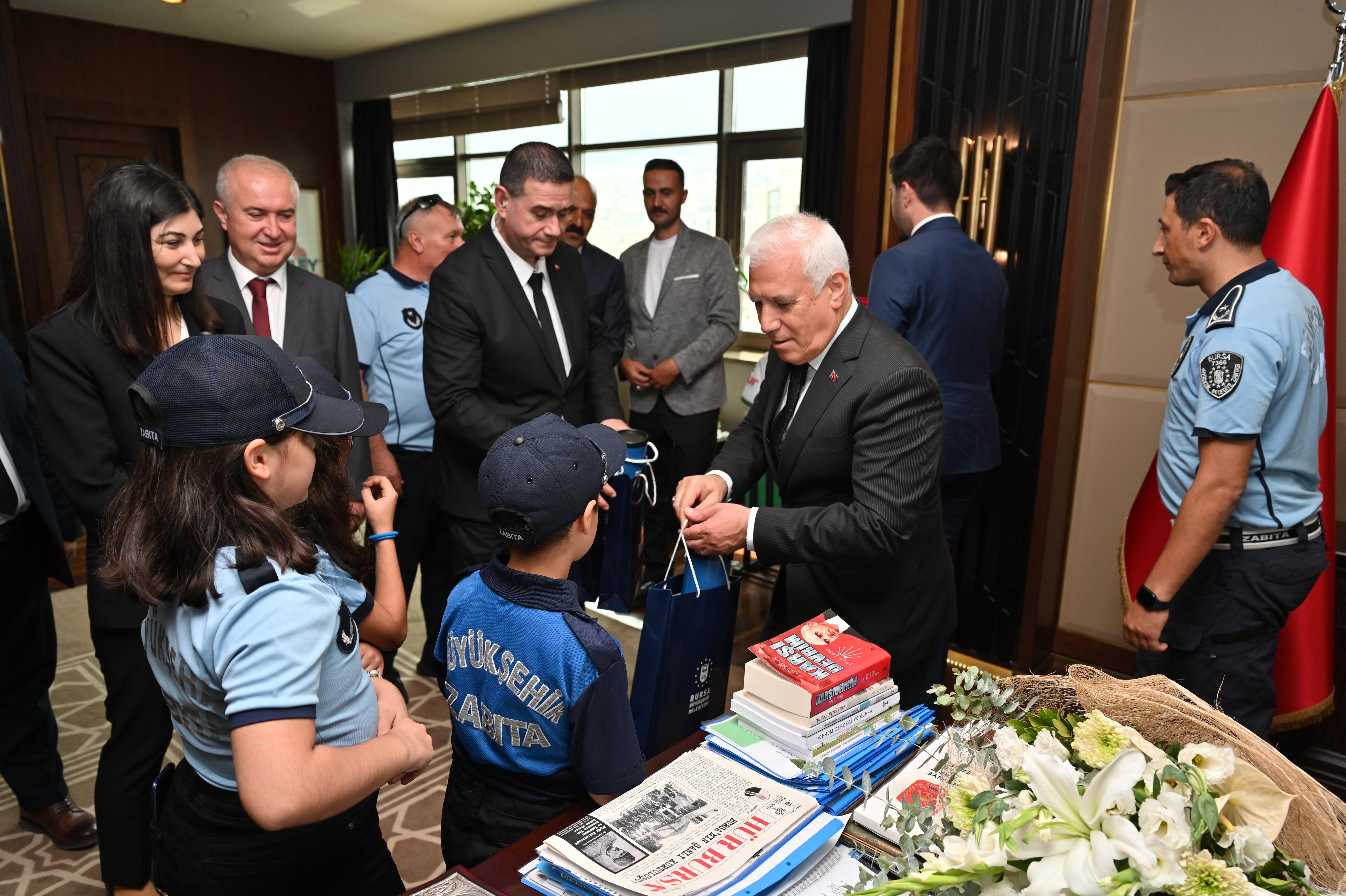 Programın ardından Bursa Büyükşehir Belediye Başkanı Mustafa Bozbey, zabıta teşkilatını makamında ağırladı. Büyükşehir Belediyesi Genel Sekreteri Doç. Dr. Ergül Halisçelik, Zabıta Dairesi Başkanı Cevdet Özgür, 17 ilçenin zabıta müdürleri, Bursa Zabıta Derneği ve Büyükşehir Belediyesi zabıta personelinin yer aldığı ziyarette, Başkan Bozbey zabıta kıyafetini giyen çocuklarla sohbet etti. Başkan Bozbey, “Bursa’mızın huzur ve düzeni için gece gündüz demeden görev yapan, hemşehrilerimizin güvenliği ve esenliği için özveriyle çalışan tüm zabıta personelimizin Zabıta Haftası’nı en içten dileklerimle kutluyorum” diye konuştu.