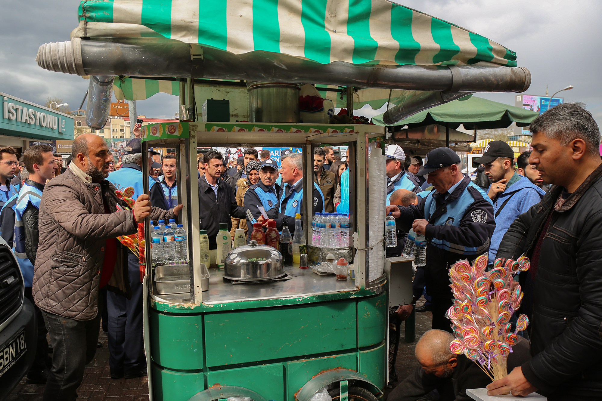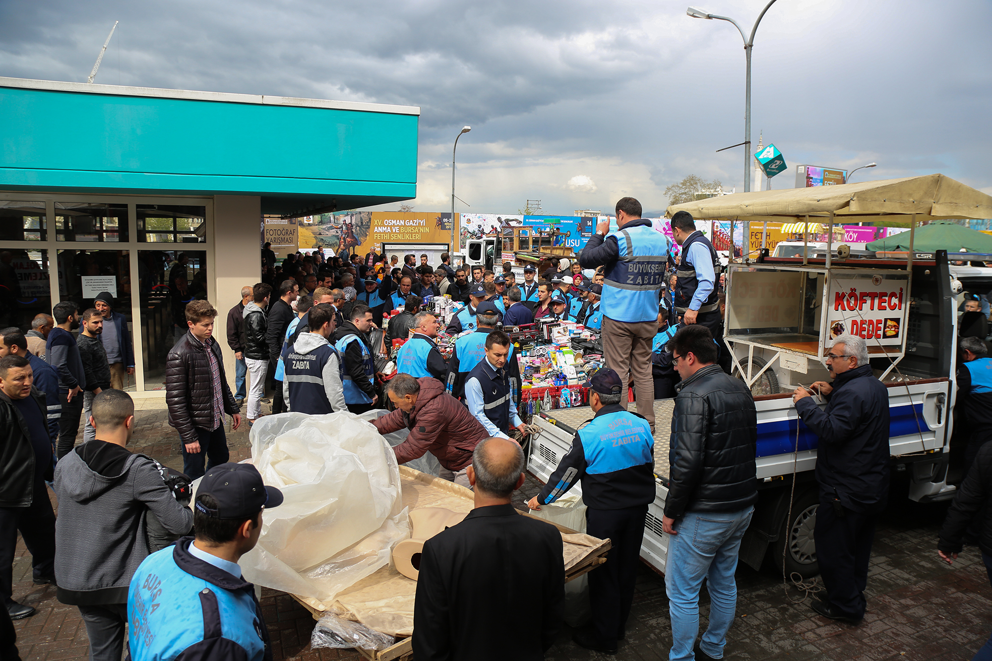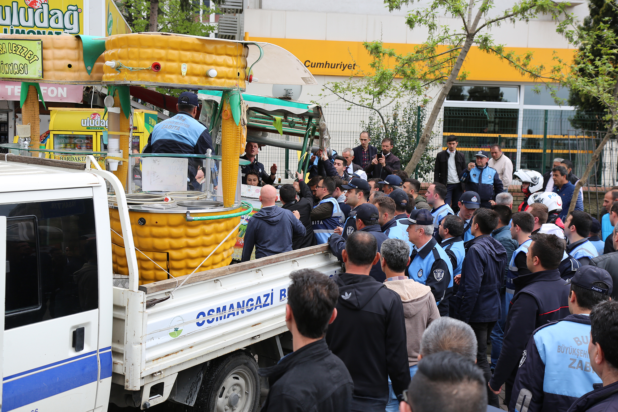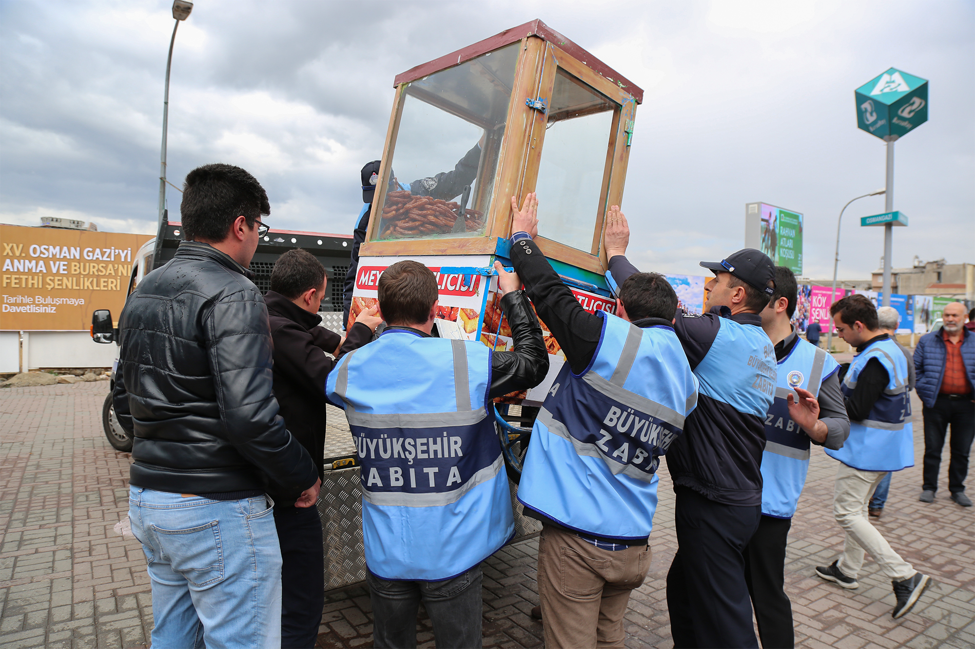 Özellikle yaya trafiğinin yoğun olduğu bölgelerdeki seyyar satıcılar ile kaldırımların işyerleri tarafından işgal edilmesine yönelik şikayetlerin artması üzerine Bursa Büyükşehir Belediyesi zabıta ekipleri denetim yaptı. En fazla seyyar satıcının bulunduğu Osmangazi metro istasyonu önü ve Fevzi Çakmak Caddesi’nde yapılan denetimlere Osmangazi Belediyesi Zabıta ekipleri ve polis de destek verdi. Operasyonda daha önce yapılan uyarılara rağmen kaldırımları boşaltmayan işyerlerinin kaldırım üzerinde bulunan 5 adet reklam standı, 2 işyerine ait tabure ve sandalyeler, 7 adet seyyar tatlı arabası, 8 mısır arabası, 2 boks makinesi ile birlikte 2 çerçiciye ait malzemelere el konuldu.