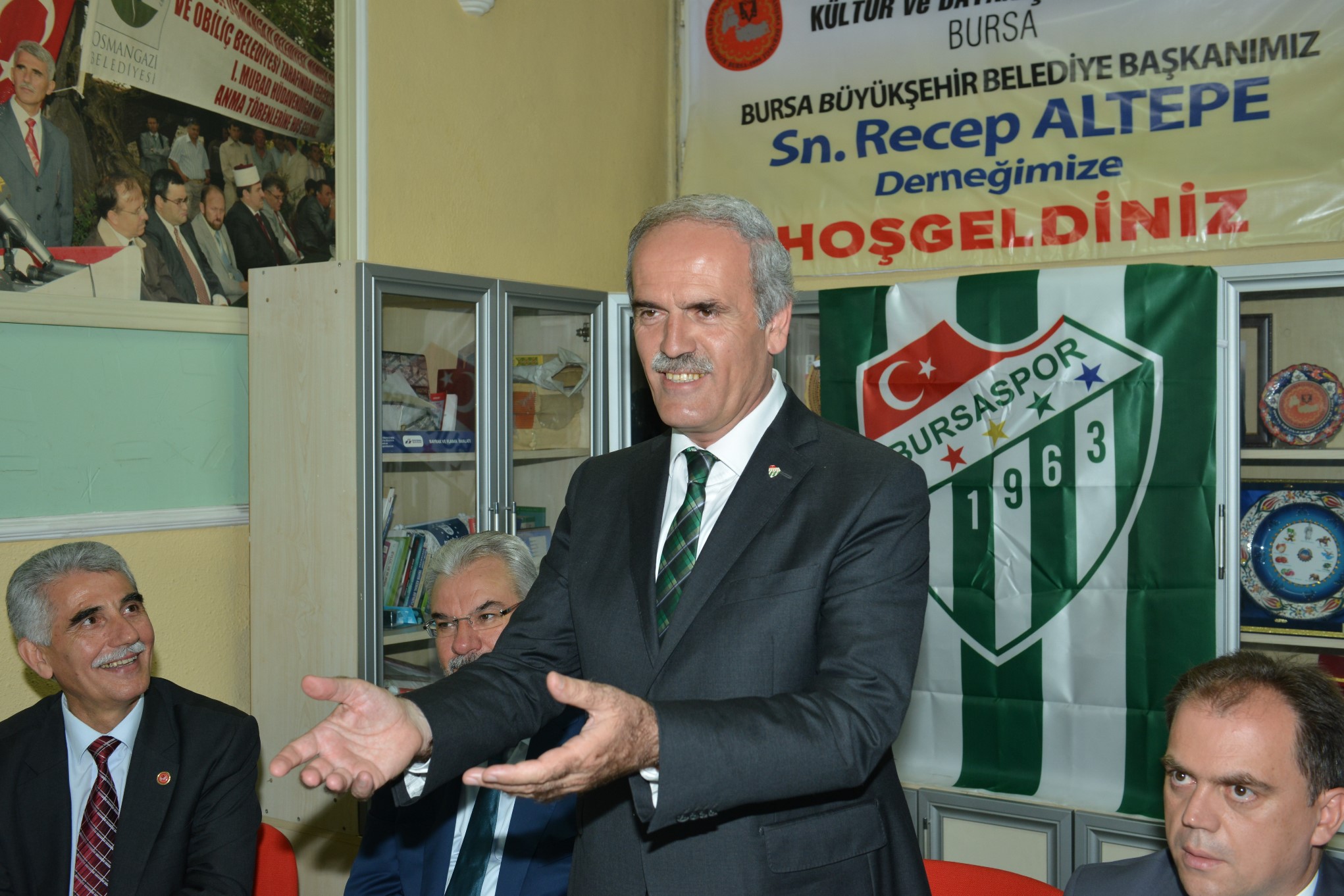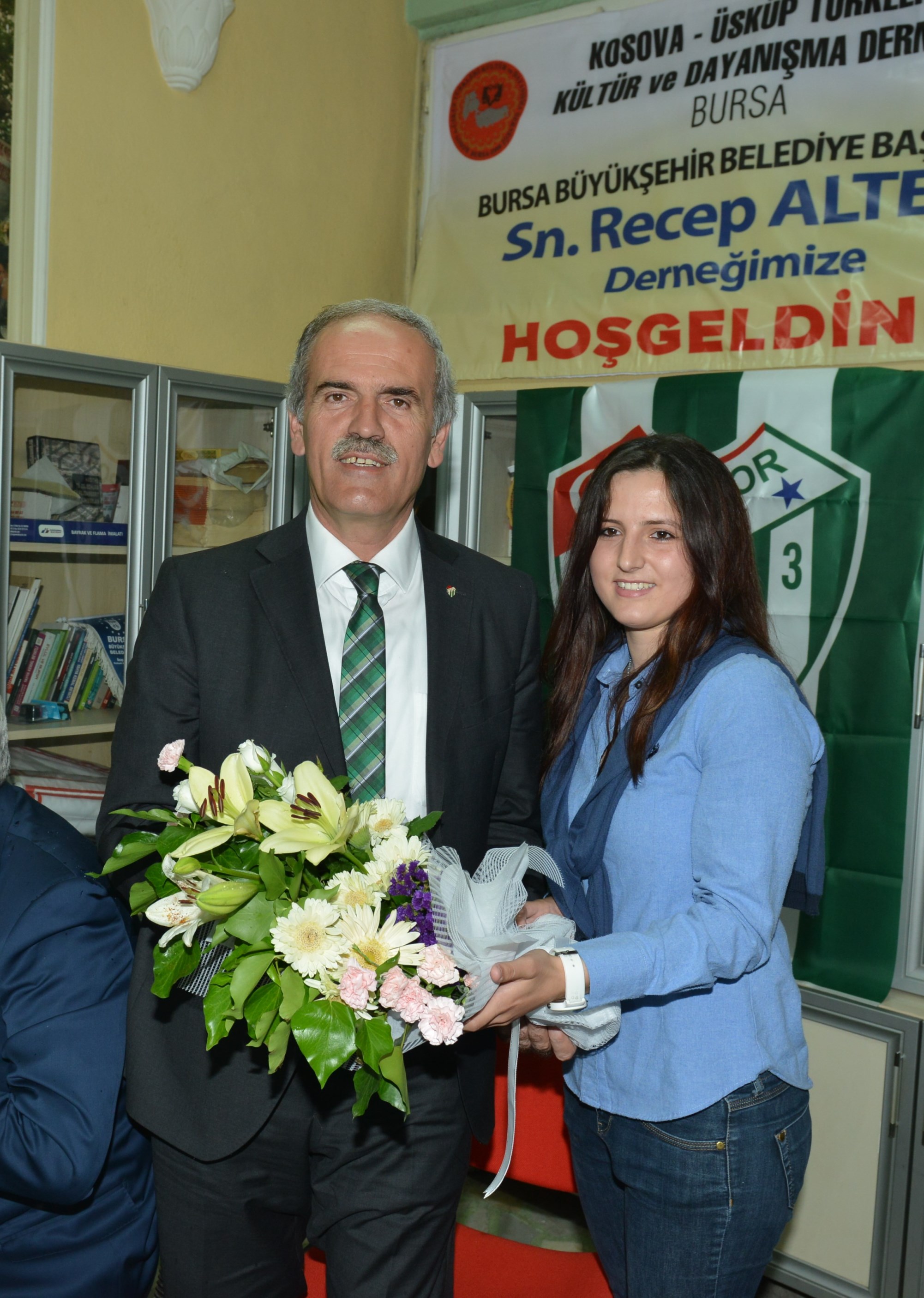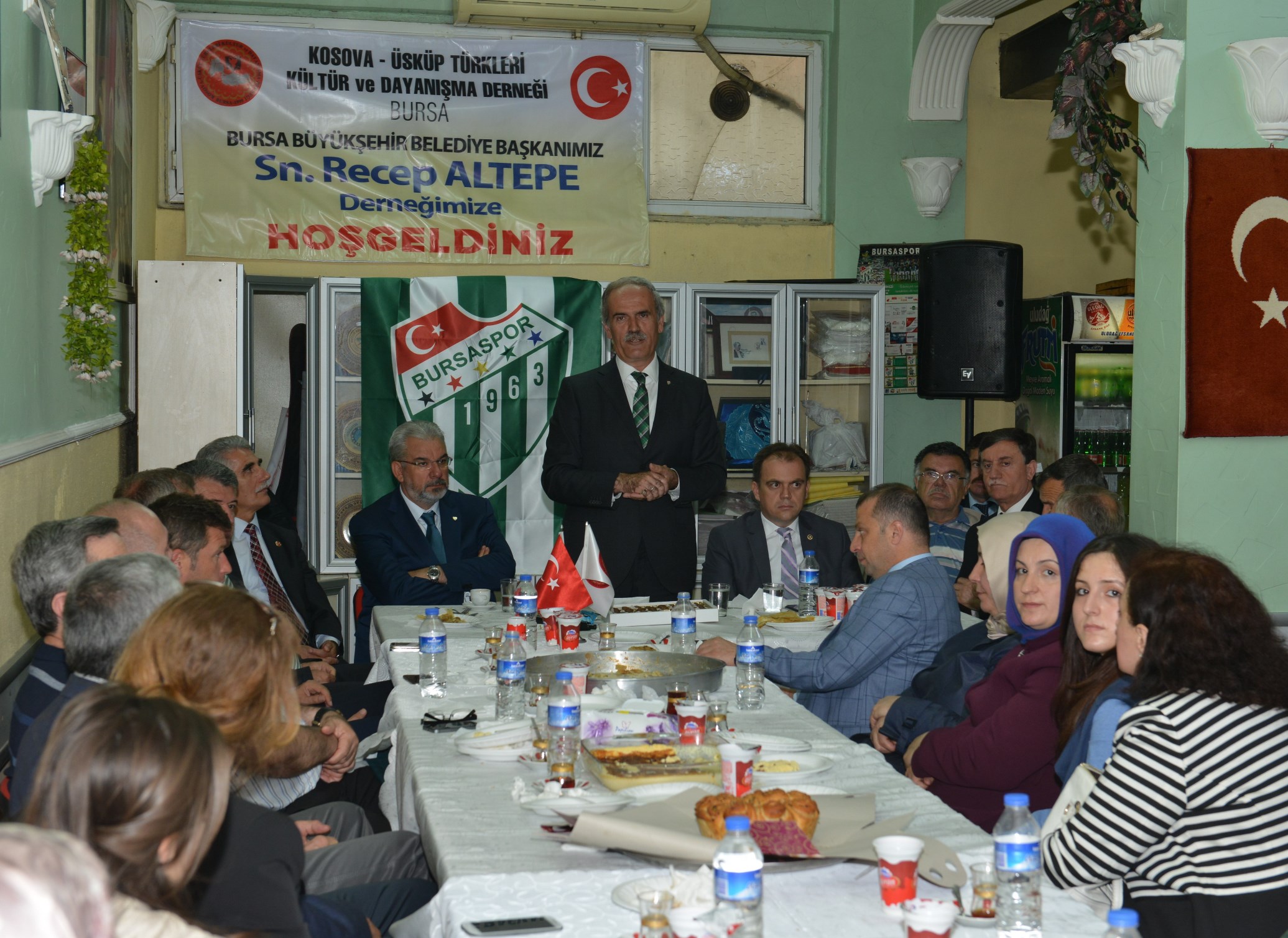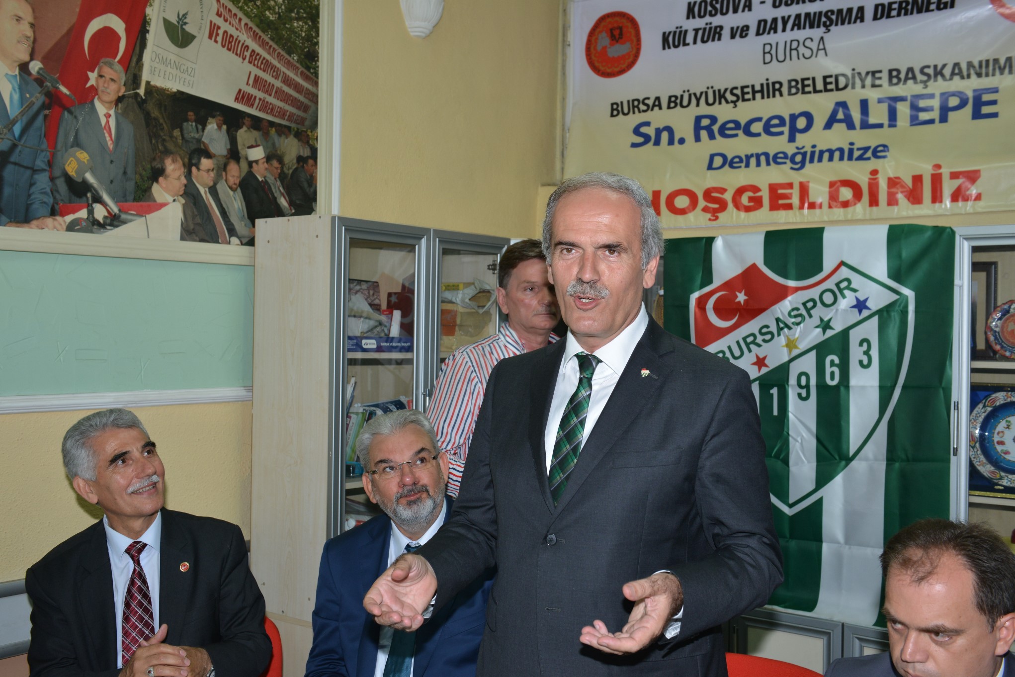 Büyükşehir Belediye Başkanı Recep Altepe, ziyaretinde başta Kosova olmak üzere Balkan ülkelerinde Büyükşehir Belediyesi tarafından yapılan yatırımlara değindi. Restorasyon işlemlerinin ve etkinliklerin hayırseverler eliyle gerçekleştiğini, finansörleri de bölge insanı olup da Bursa’da iş yapan kurum sahiplerinden seçtiklerini hatırlatan Başkan Altepe, Bursa’dan ziyade Türkiye yararına çalıştıklarını vurguladı. Yapılan yatırımlar ve düzenlenen etkinliklerle Müslümanlar arasında birlik ve beraberliği sağladıklarını, onlara güç verdiklerini belirten Başkan Altepe, “Flamalı araçlarımızla o bölgelerde gezmek, köy ve şehirlerde toplantılar yapmak, iftarlar vermek onlara büyük moral veriyor. Oradaki insanımıza sahip çıkacağız. O bölgelerin gelişmesi ve kalkınması bizim gücümüz demek. Çünkü onlar bizim bir parçamız. Hepimizin huzur içerisinde, kendine yeter halde olması gerekiyor. Orada işletmelerimizin kurulması, başkasına iş verir hale gelmesi gerekiyor. Onun için bu yatırımları yapıyoruz. Birlik ve beraberlik içerisinde bu çalışmaları sürdürüyoruz. Bu konuda üzerimize düşen neyse, onu yaptık. Yapmaya da devam edeceğiz” diye konuştu.
