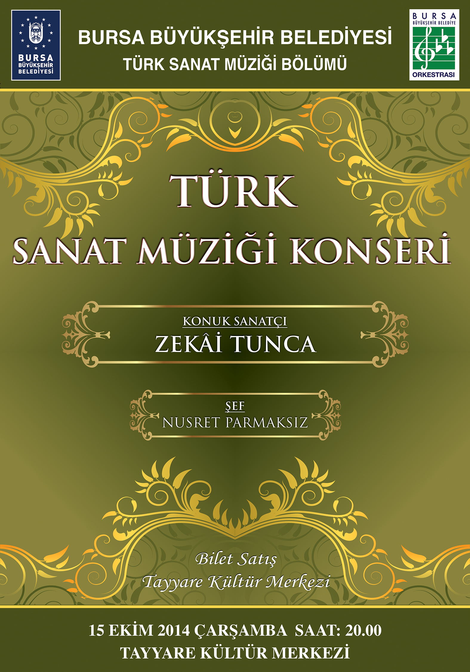 BURSA – Bursa Büyükşehir Belediyesi Orkestra Şube Müdürlüğü Türk Sanat Müziği Bölümü, 2014 – 2015 sanat sezonunu usta sanatçı Zekai Tunca’nın konuk olacağı muhteşem bir konserle açıyor.