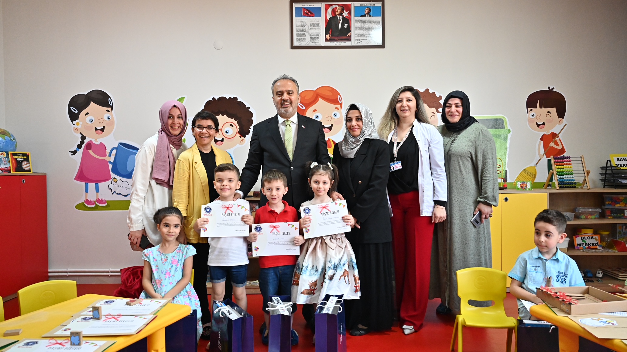 Bursa Büyükşehir Belediyesi tarafından 2019-2020 eğitim döneminde 6 nokta ile eğitime başlatılan ve bugün 26 merkezde yaklaşık 2500 öğrencisiyle okul öncesi eğitimde önemli bir marka haline gelen Ana Kucağı Eğitim Merkezlerinde karne sevinci yaşandı. Eğitim hayatlarına Büyükşehir Belediyesi’nin ana kucaklarında başlayan ve birbirinden farklı etkinliklerle bir yılı daha geride bırakan minik öğrenciler için Ana Kucağı Personel Kreşi’nde de karne töreni düzenlendi. Miniklerin karne sevincine Büyükşehir Belediye Başkanı Alinur Aktaş da ortak oldu. Başarı belgelerinin yanı sıra satranç takımı ve tohumlu kalemlerini Başkan Aktaş’ın elinden alan minikler, mezuniyet pastalarını da Başkan Aktaş ile birlikte kesti.