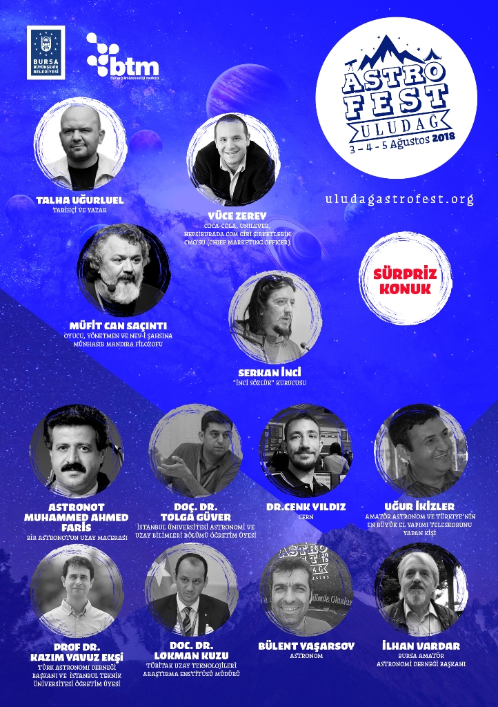Astrofest’te; Coca-Cola, Unilever ve www.hepsiburada.com şirketlerinin CMO’su Yüce Zerey, İstanbul Üniversitesi Astronomi ve Uzay Bilimleri Bölümü Öğretim Üyesi Doç. Dr. Tolga Güver, CERN’den Dr. Cenk Yıldız, Türkiye’nin en büyük el yapımı teleskopunu üreten Uğur İkizler, Türk Astronomi Derneği Başkanı Prof. Dr. Kazım Yavuz Ekşi, TÜBİTAK Uzay Teknolojileri Araştırma Enstitüsü’nden Doç. Dr. Lokman Kuzu, Astronom Bülent Yaşarsoy ve Bursa Amatör Astronomi Derneği Başkanı İlhan Vardar kendi alanlarına ilişkin sunum yapacak. Astrofest 2018’de Mandıra Filozofu filmiyle tanınan ve ‘Karşıyım’ felsefesini milyonların diline dolayan Müfit Can Saçıntı da sevenleriyle buluşacak. Bursa BTM Bilim Avcıları ekibi ise gösterileri ile festivale renk katacak.