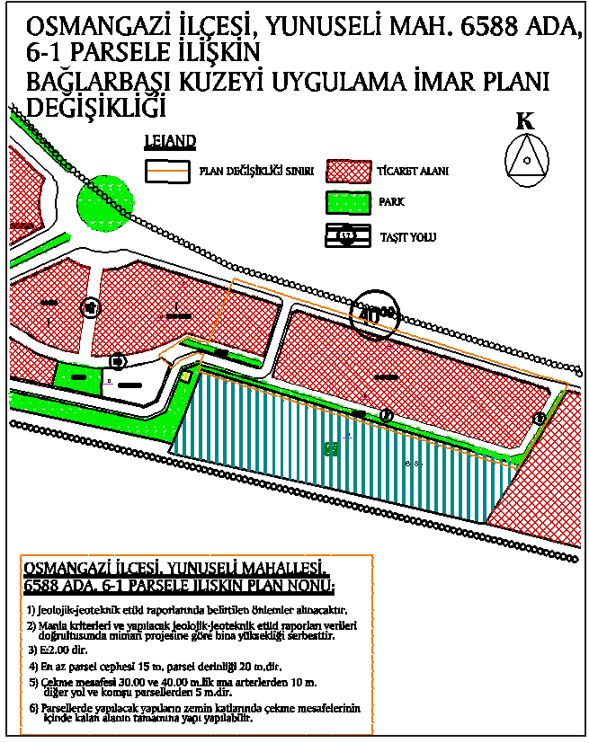 | Osmangazi İlçesi, Yunuseli Mah. 6588 ada, 1 ve 6 parsele ilişkin 1/1000 ölçekli Bağlarbaşı Kuzeyi Uygulama İmar Planı Değişikliği |