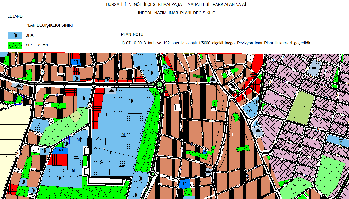 | İnegöl İlçesi, Kemalpaşa Mahallesi, 216 ada, 10 ve 63 nolu parseller arasında kalan “Park ve Dinlenme Alanı” nın bir kısmının “Yönetim Merkezleri Alanı” na, buna karşılık 868 ada ve 704 ada arasında kalan “Yönetim Merkezleri Alanın” nın ise “Park ve Dinlenme Alanı” na alınmasına ilişkin 1/5000 Ölçekli İnegöl Revizyon + İlave Nazım İmar Planı değişikliği |